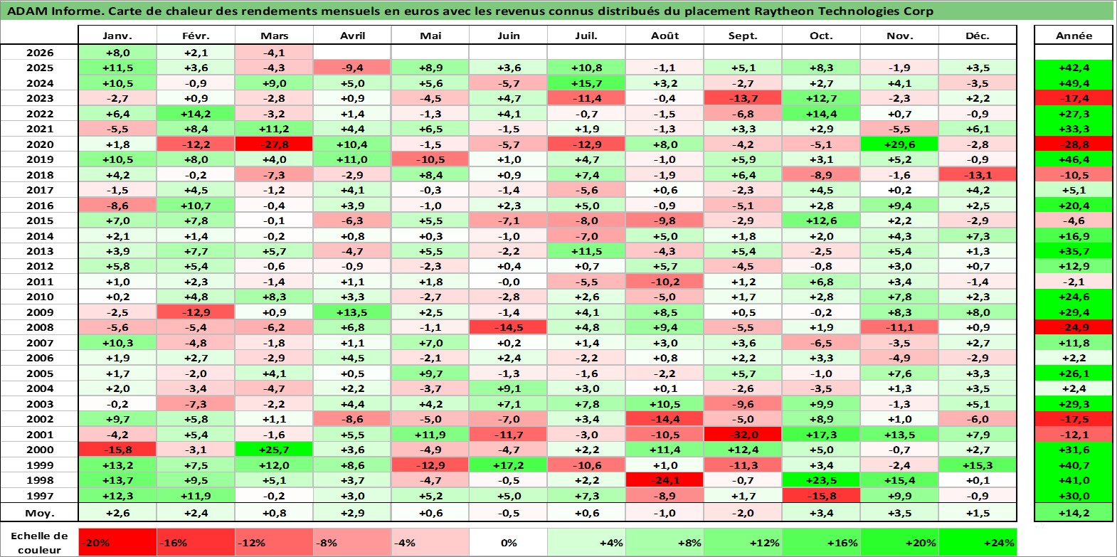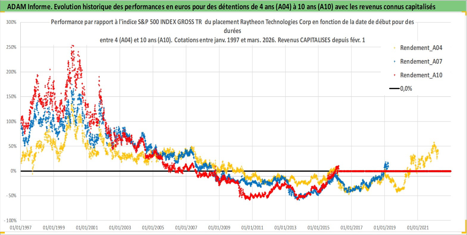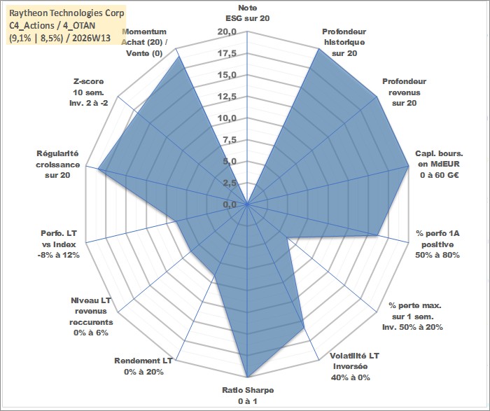Site dédié aux investisseursPage dédiée sur site financeAnalyse des valorisations hebdomadaires de l'action Raytheon Technologies Corp. Cet actif est cote en USD. Les valorisations sont en contrevaleur EURO et couvrent les semaines 1997W01 a 2026W13. Les revenus de cet actif financier sont pris en compte depuis la semaine 1997W08. La note ESG de cet actif n'est pas connue.