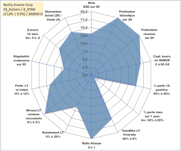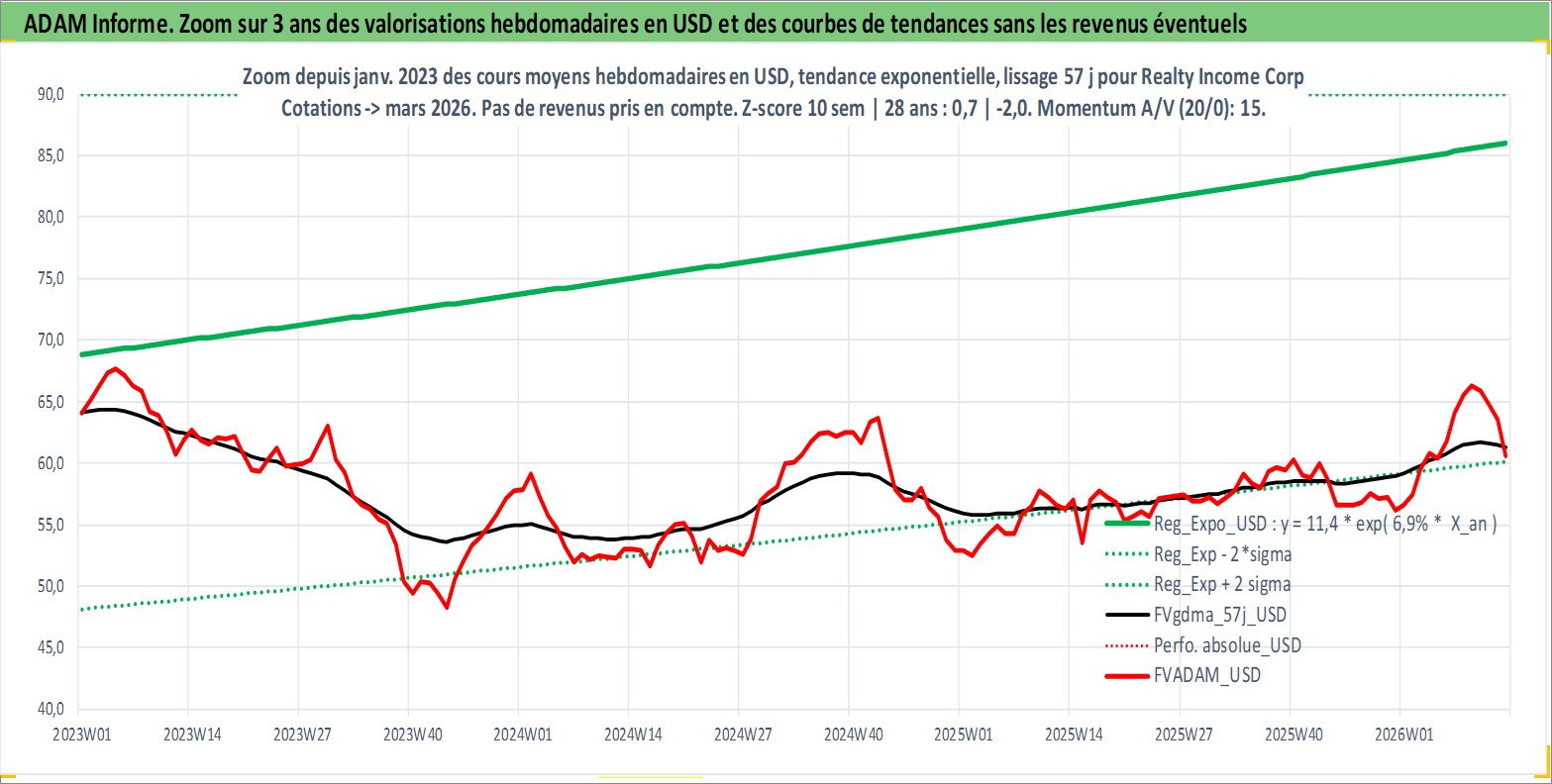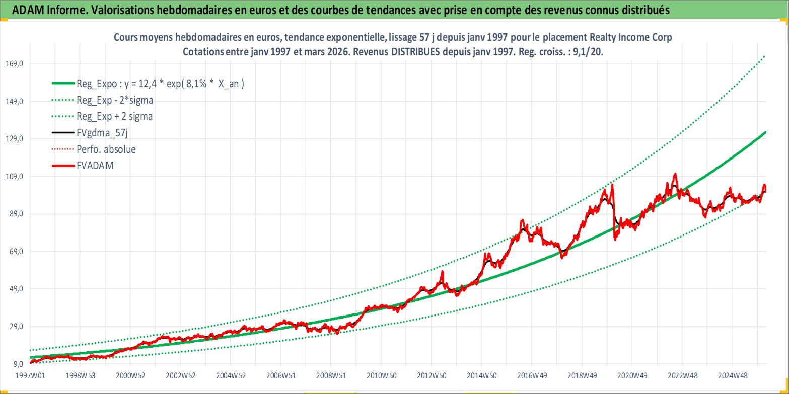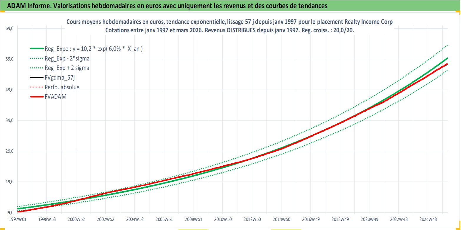 Site dédié aux investisseursPage dédiée sur site financeAnalyse des valorisations hebdomadaires de l'action Realty Income Corp. Cet actif est cote en USD. Les valorisations sont en contrevaleur EURO et couvrent les semaines 1997W01 a 2026W13. Les revenus de cet actif financier sont pris en compte depuis la semaine 1997W05. La note globale ESG de cet actif est estimee a 13.0 (apres rebasage entre 0 et 20).