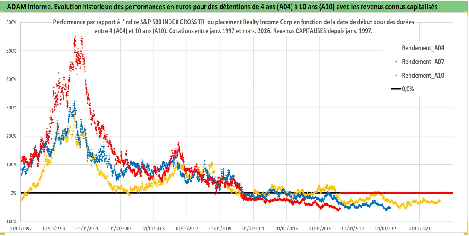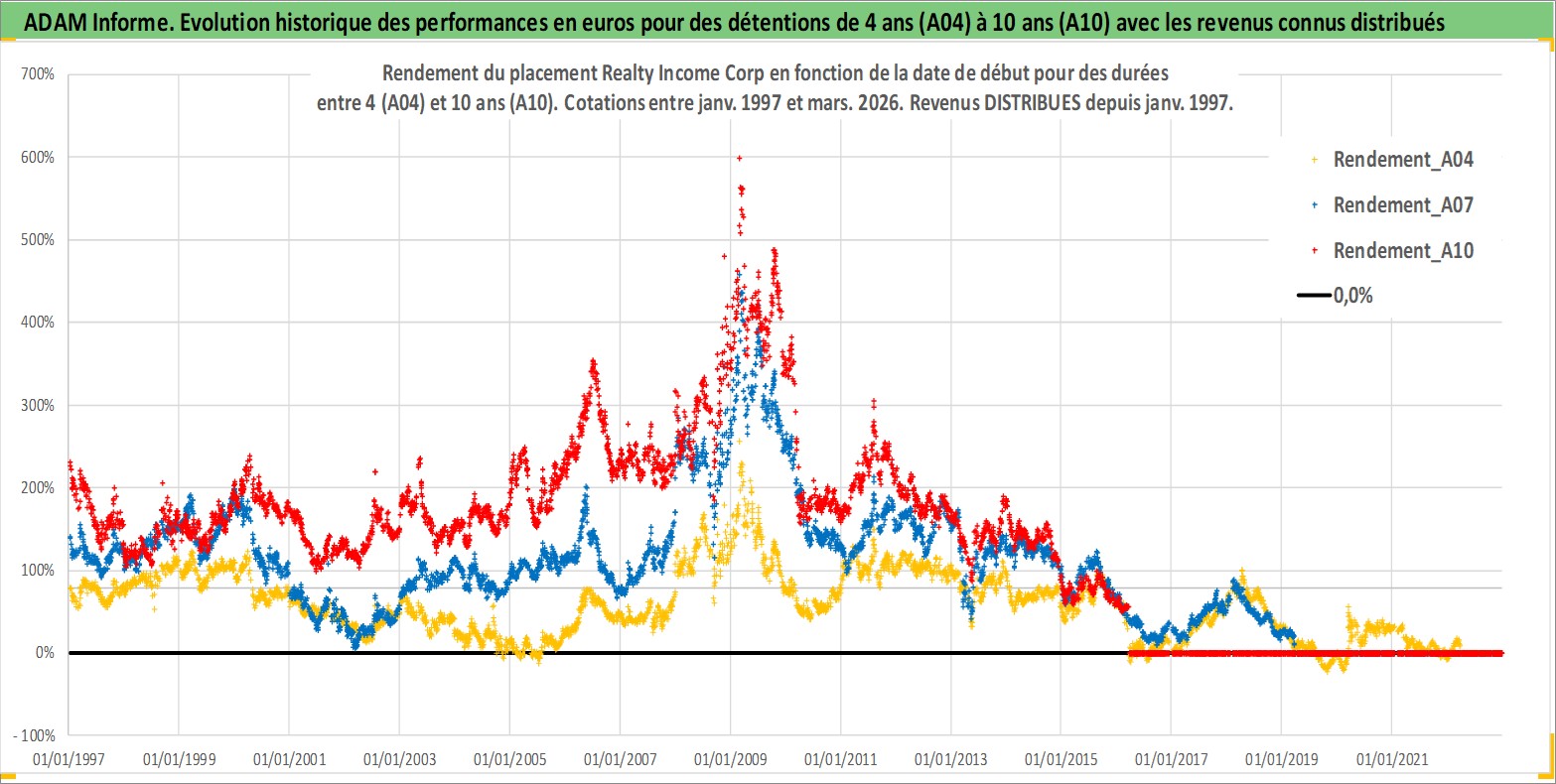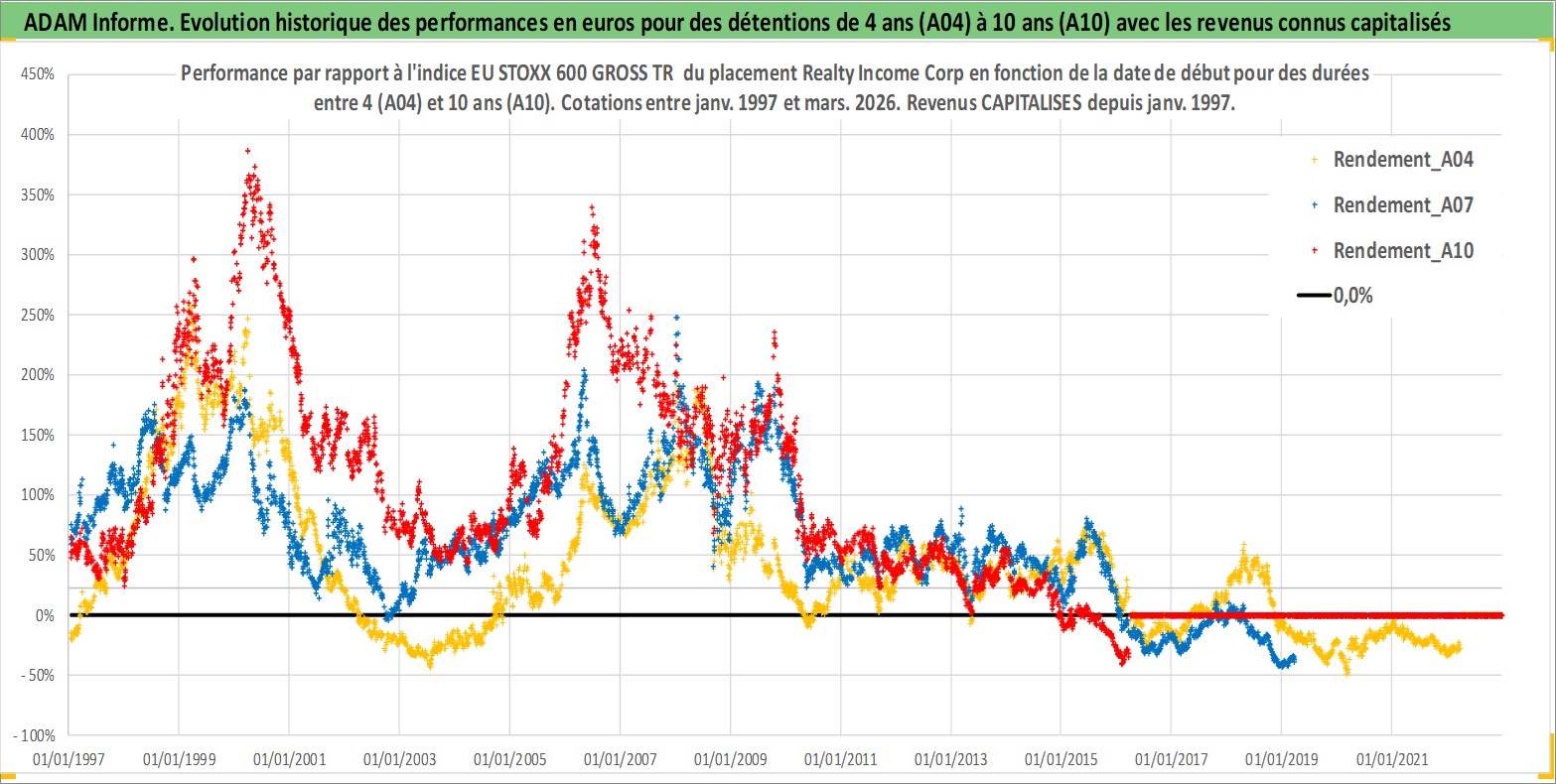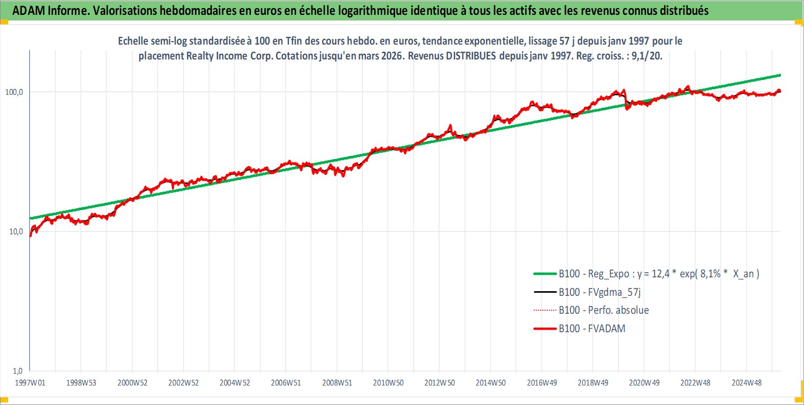Site dédié aux investisseursPage dédiée sur site financeAnalyse des valorisations hebdomadaires de l'action Realty Income Corp. Cet actif est cote en USD. Les valorisations sont en contrevaleur EURO et couvrent les semaines 1997W01 a 2026W13. Les revenus de cet actif financier sont pris en compte depuis la semaine 1997W05. La note globale ESG de cet actif est estimee a 13.0 (apres rebasage entre 0 et 20).