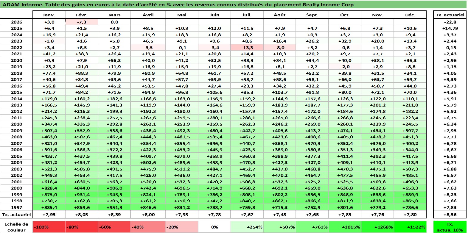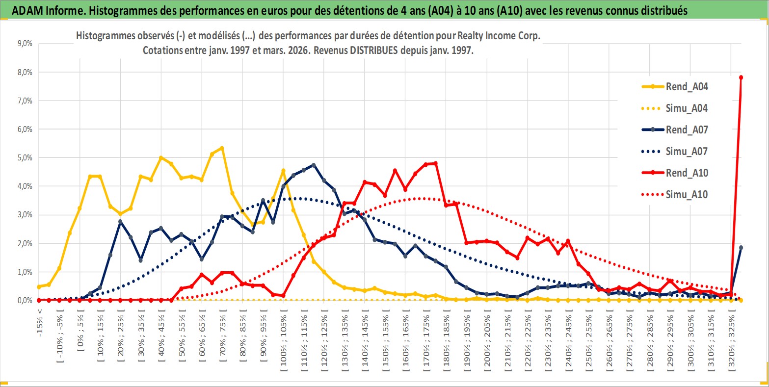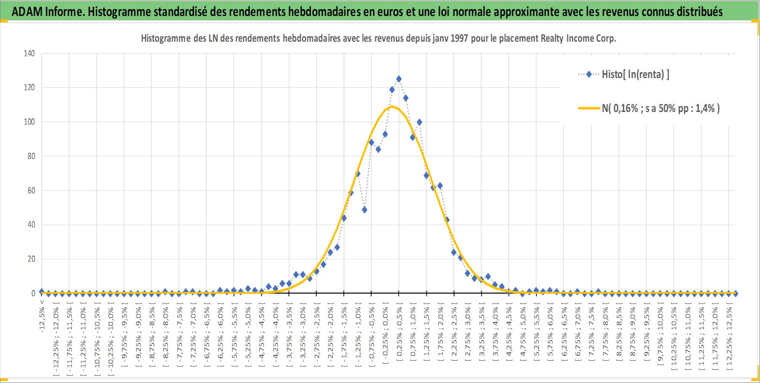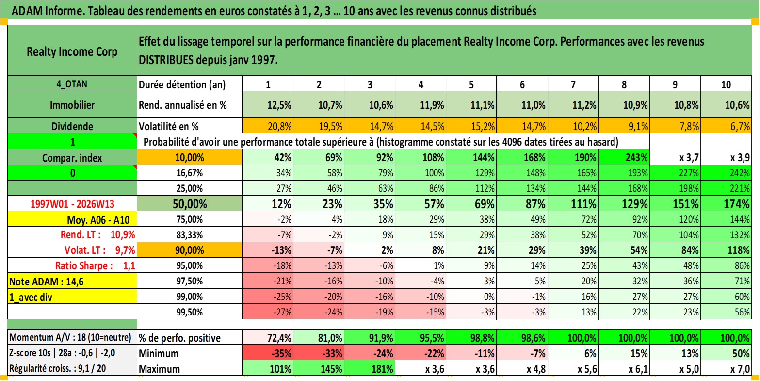Site dédié aux investisseursPage dédiée sur site financeAnalyse des valorisations hebdomadaires de l'action Realty Income Corp. Cet actif est cote en USD. Les valorisations sont en contrevaleur EURO et couvrent les semaines 1997W01 a 2026W13. Les revenus de cet actif financier sont pris en compte depuis la semaine 1997W05. La note globale ESG de cet actif est estimee a 13.0 (apres rebasage entre 0 et 20).