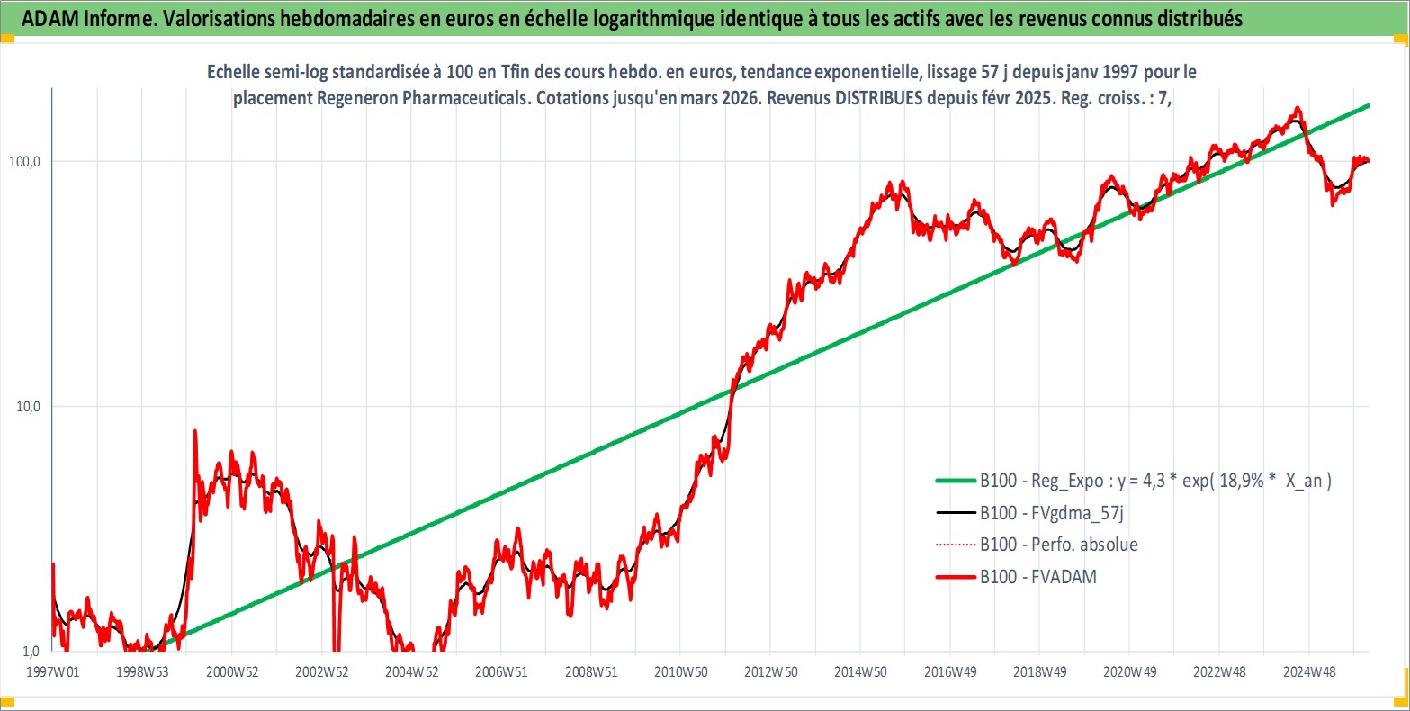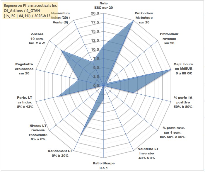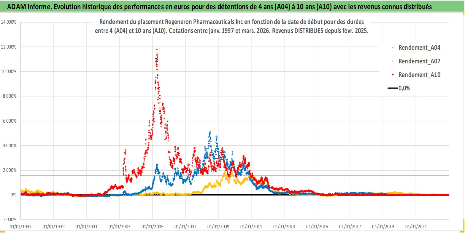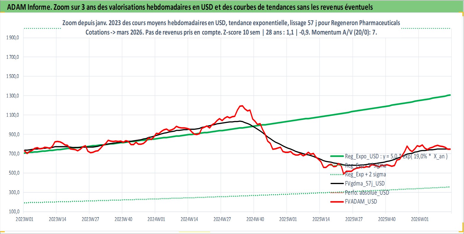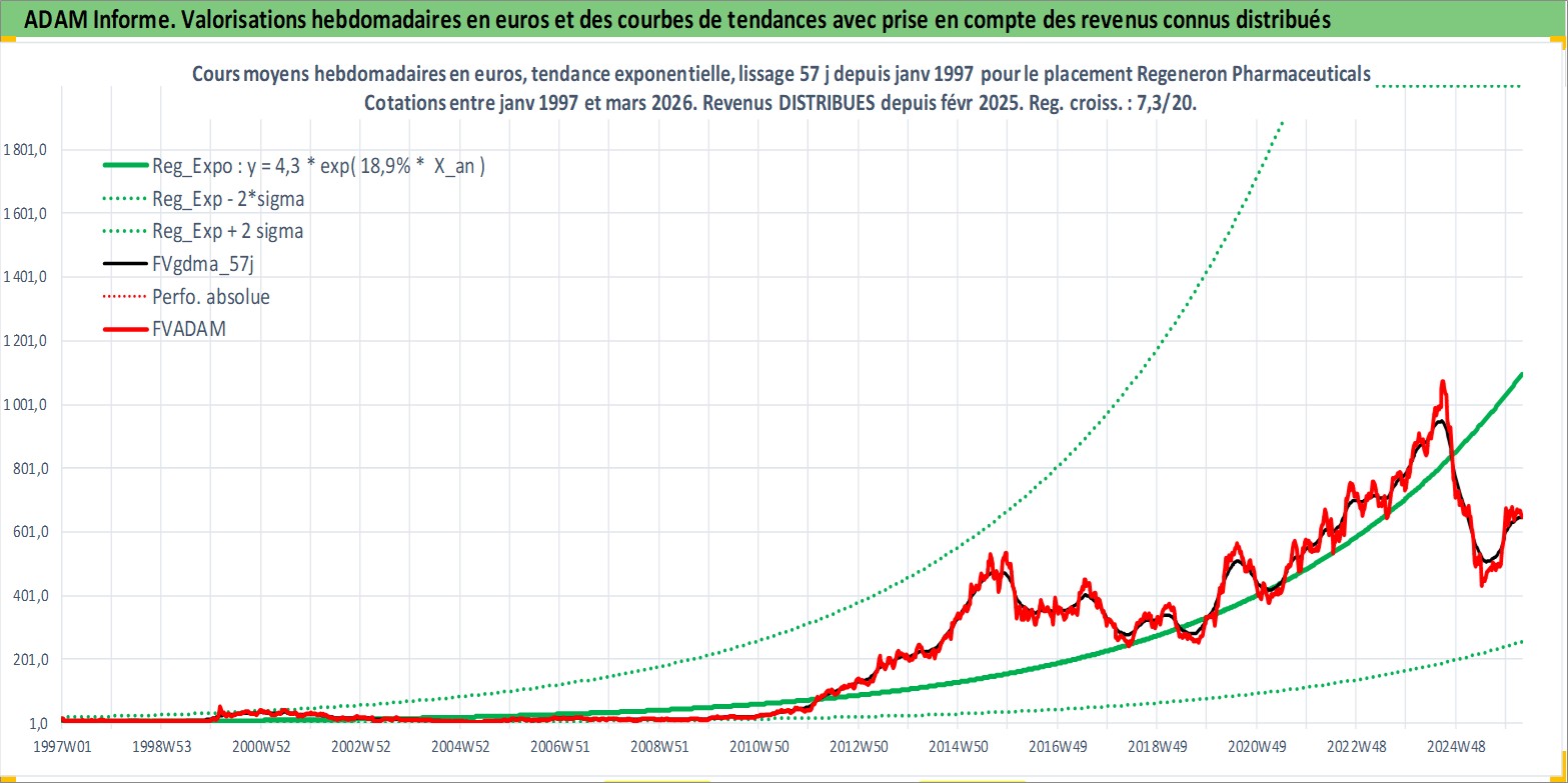 Site dédié aux investisseursPage dédiée sur site financeAnalyse des valorisations hebdomadaires de l'action Regeneron Pharmaceuticals Inc. Cet actif est cote en USD. Les valorisations sont en contrevaleur EURO et couvrent les semaines 1997W01 a 2026W13. Les revenus de cet actif financier sont pris en compte depuis la semaine 2025W08. La note globale ESG de cet actif est estimee a 11.0 (apres rebasage entre 0 et 20).