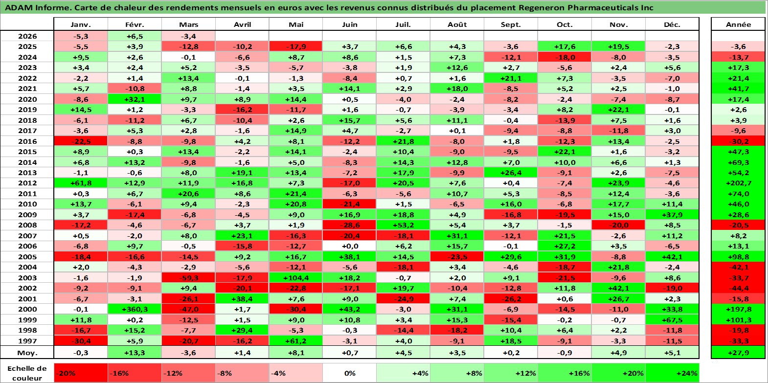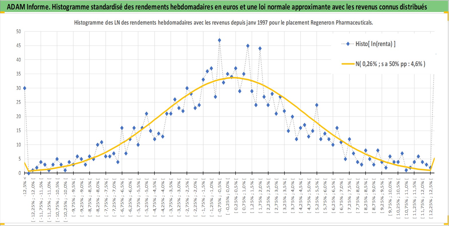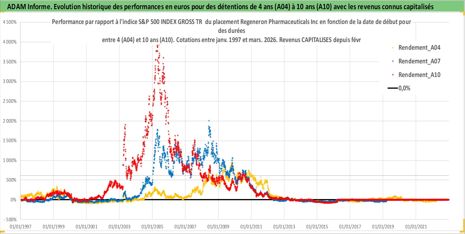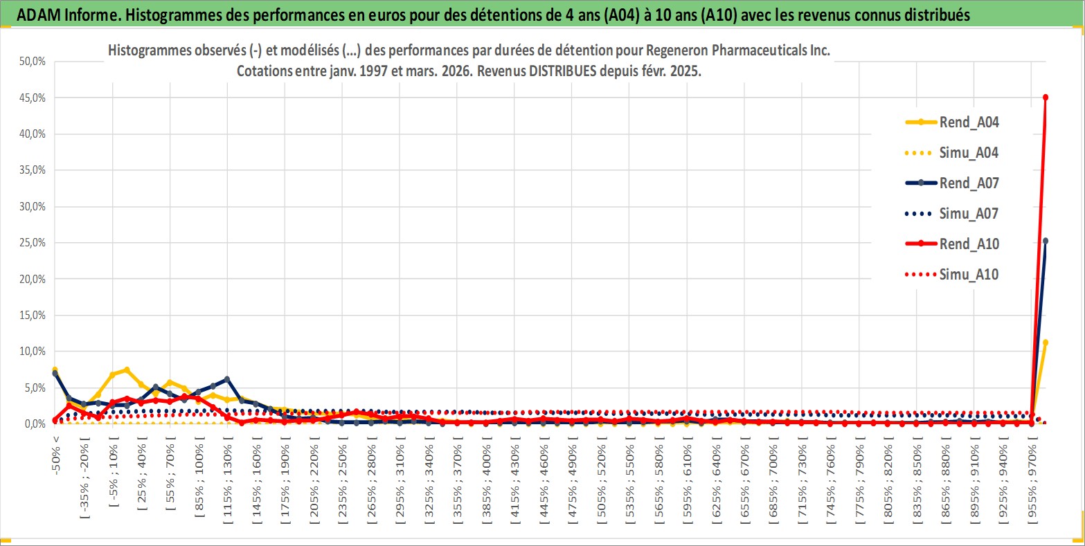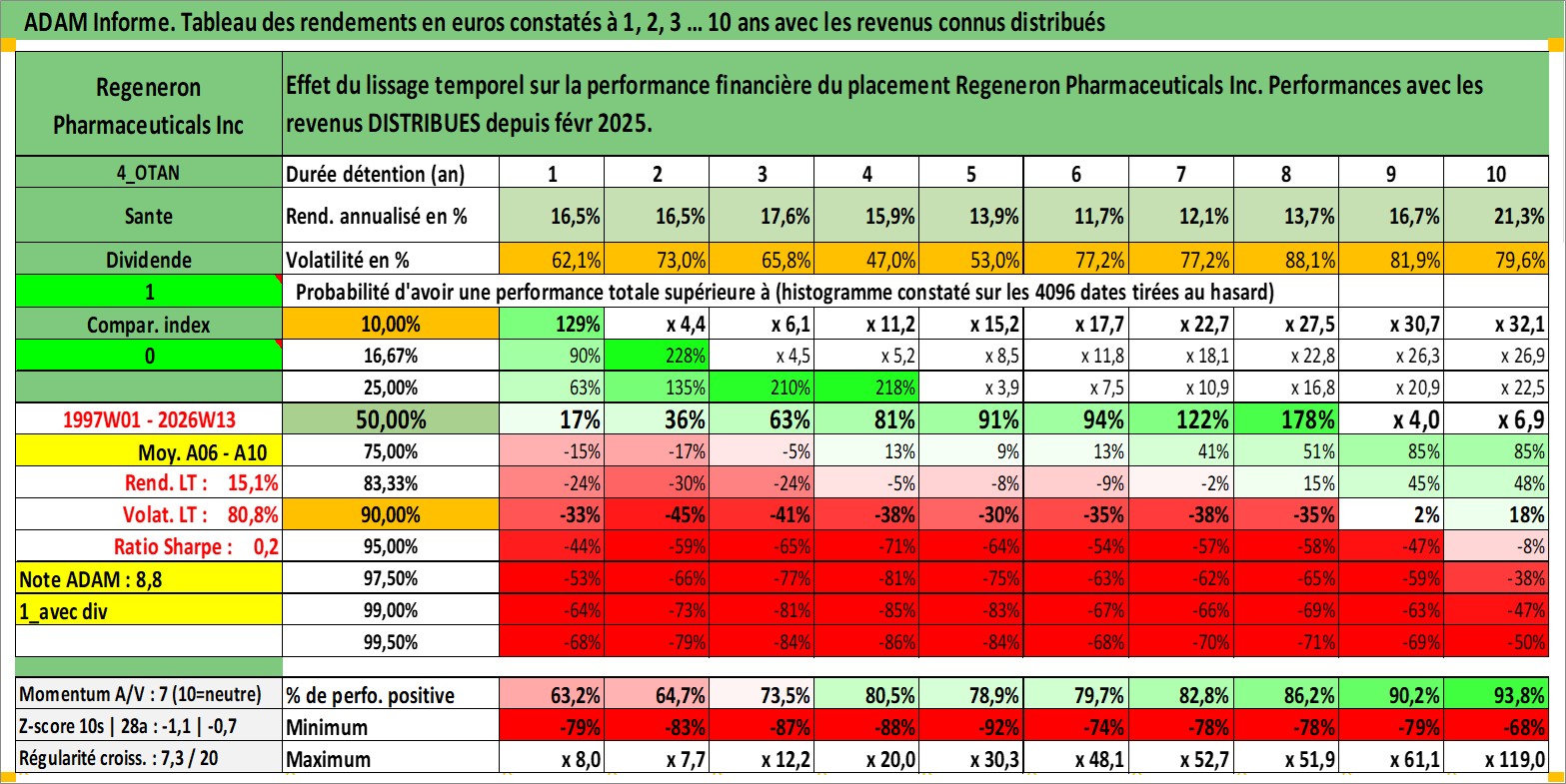 Site dédié aux investisseursPage dédiée sur site financeAnalyse des valorisations hebdomadaires de l'action Regeneron Pharmaceuticals Inc. Cet actif est cote en USD. Les valorisations sont en contrevaleur EURO et couvrent les semaines 1997W01 a 2026W13. Les revenus de cet actif financier sont pris en compte depuis la semaine 2025W08. La note globale ESG de cet actif est estimee a 11.0 (apres rebasage entre 0 et 20).