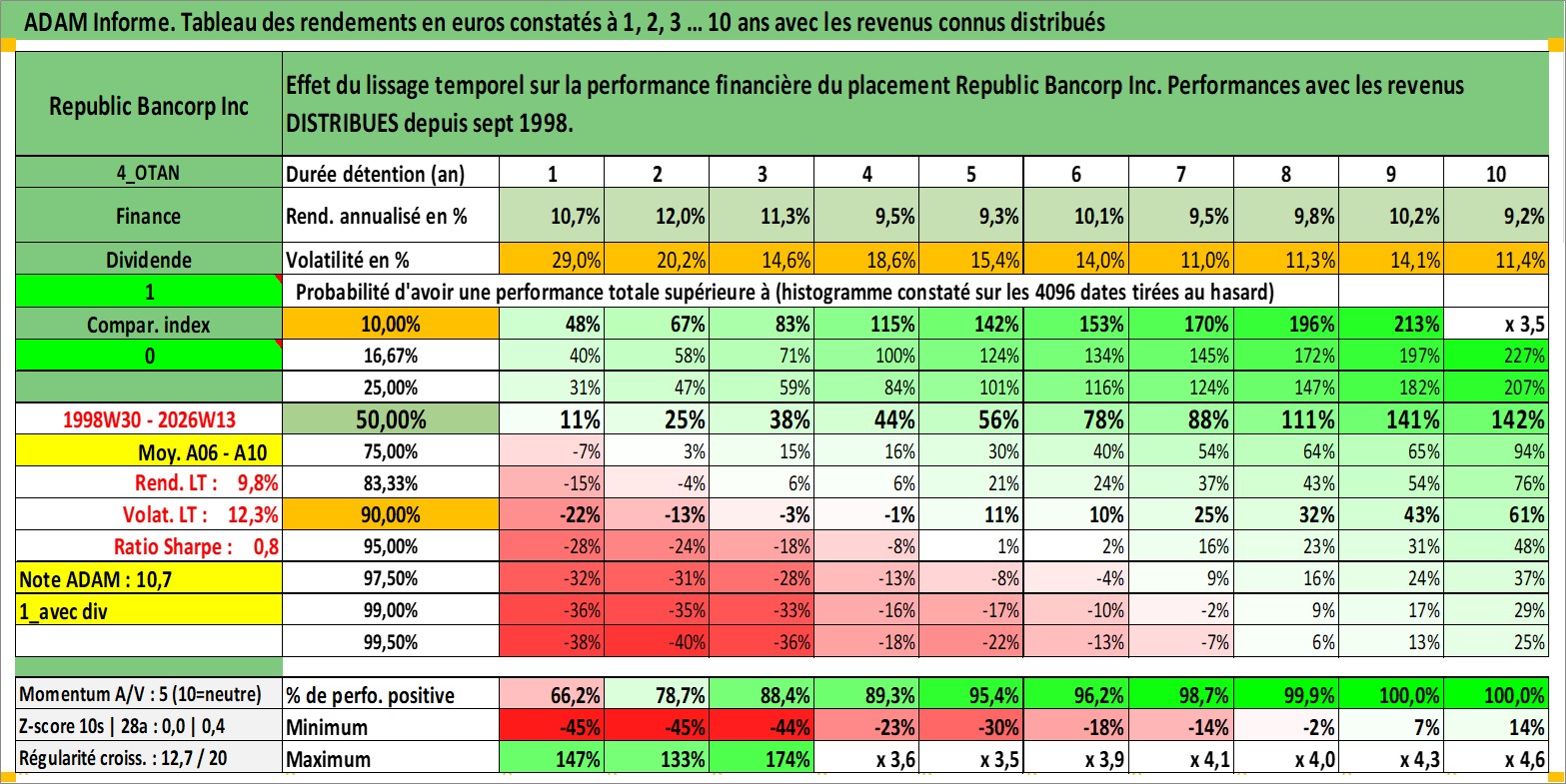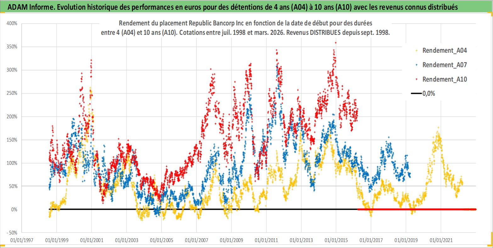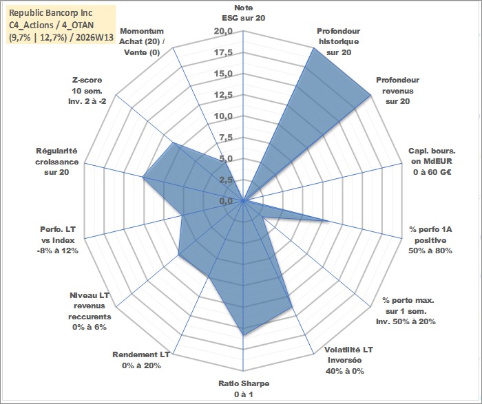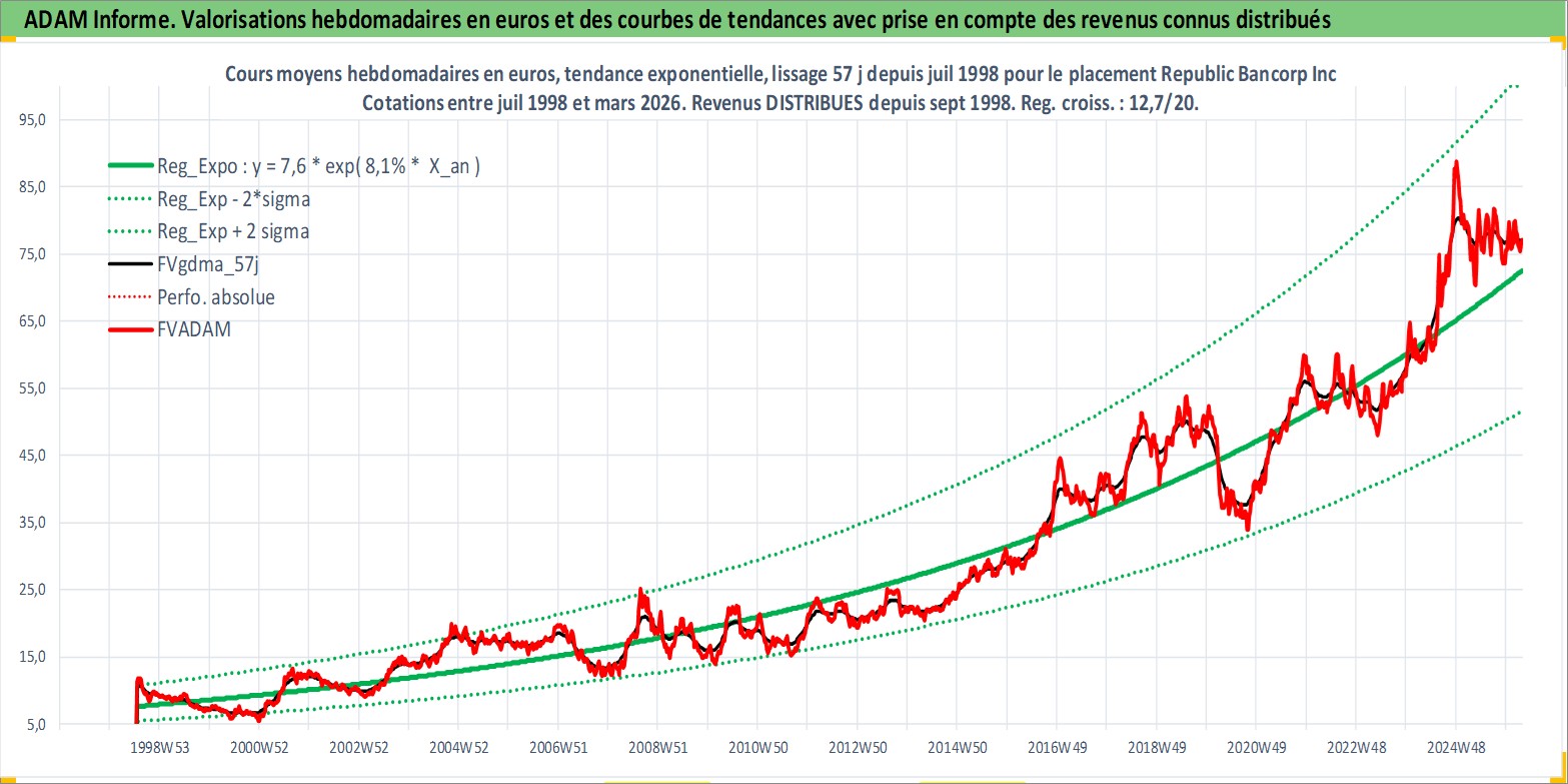 Site dédié aux investisseursPage dédiée sur site financeAnalyse des valorisations hebdomadaires de l'action Republic Bancorp Inc. Cet actif est cote en USD. Les valorisations sont en contrevaleur EURO et couvrent les semaines 1998W30 a 2026W13. Les revenus de cet actif financier sont pris en compte depuis la semaine 1998W38. La note ESG de cet actif n'est pas connue.