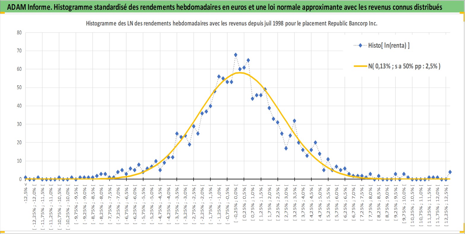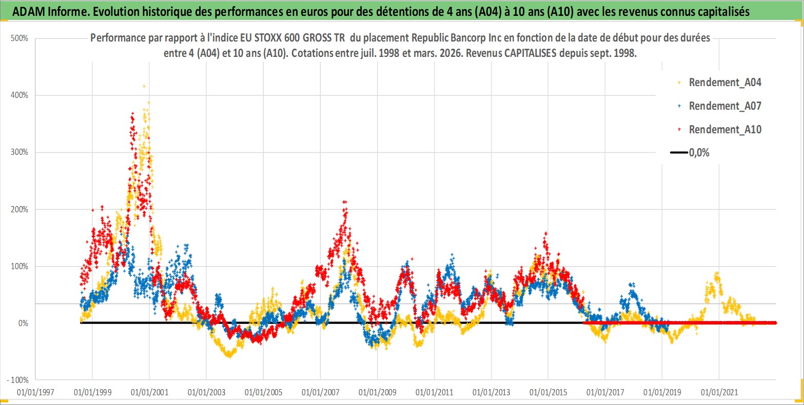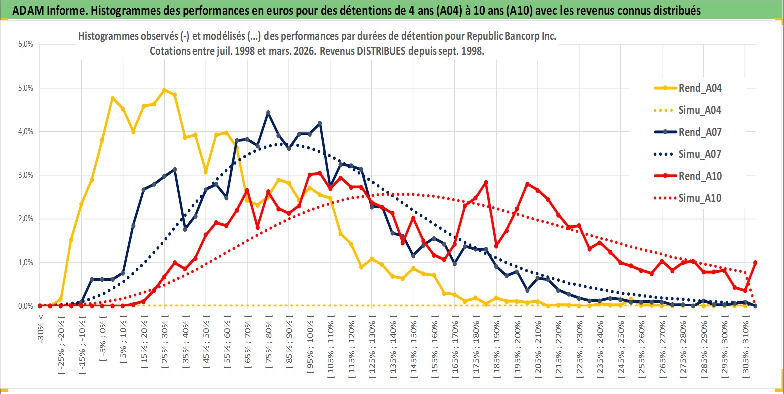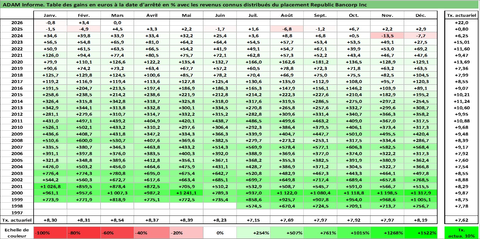 Site dédié aux investisseursPage dédiée sur site financeAnalyse des valorisations hebdomadaires de l'action Republic Bancorp Inc. Cet actif est cote en USD. Les valorisations sont en contrevaleur EURO et couvrent les semaines 1998W30 a 2026W13. Les revenus de cet actif financier sont pris en compte depuis la semaine 1998W38. La note ESG de cet actif n'est pas connue.