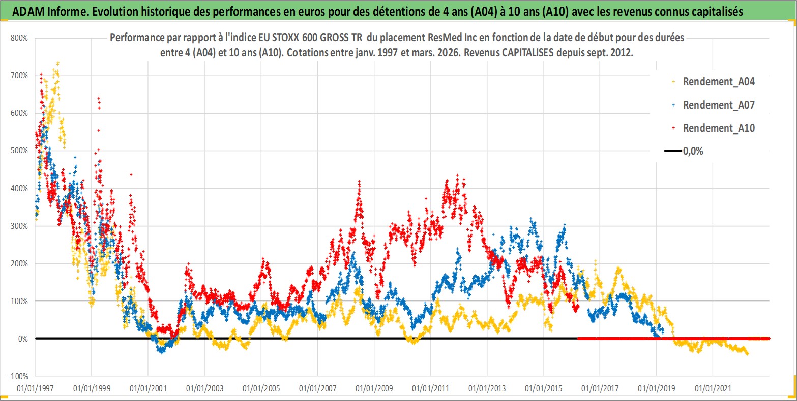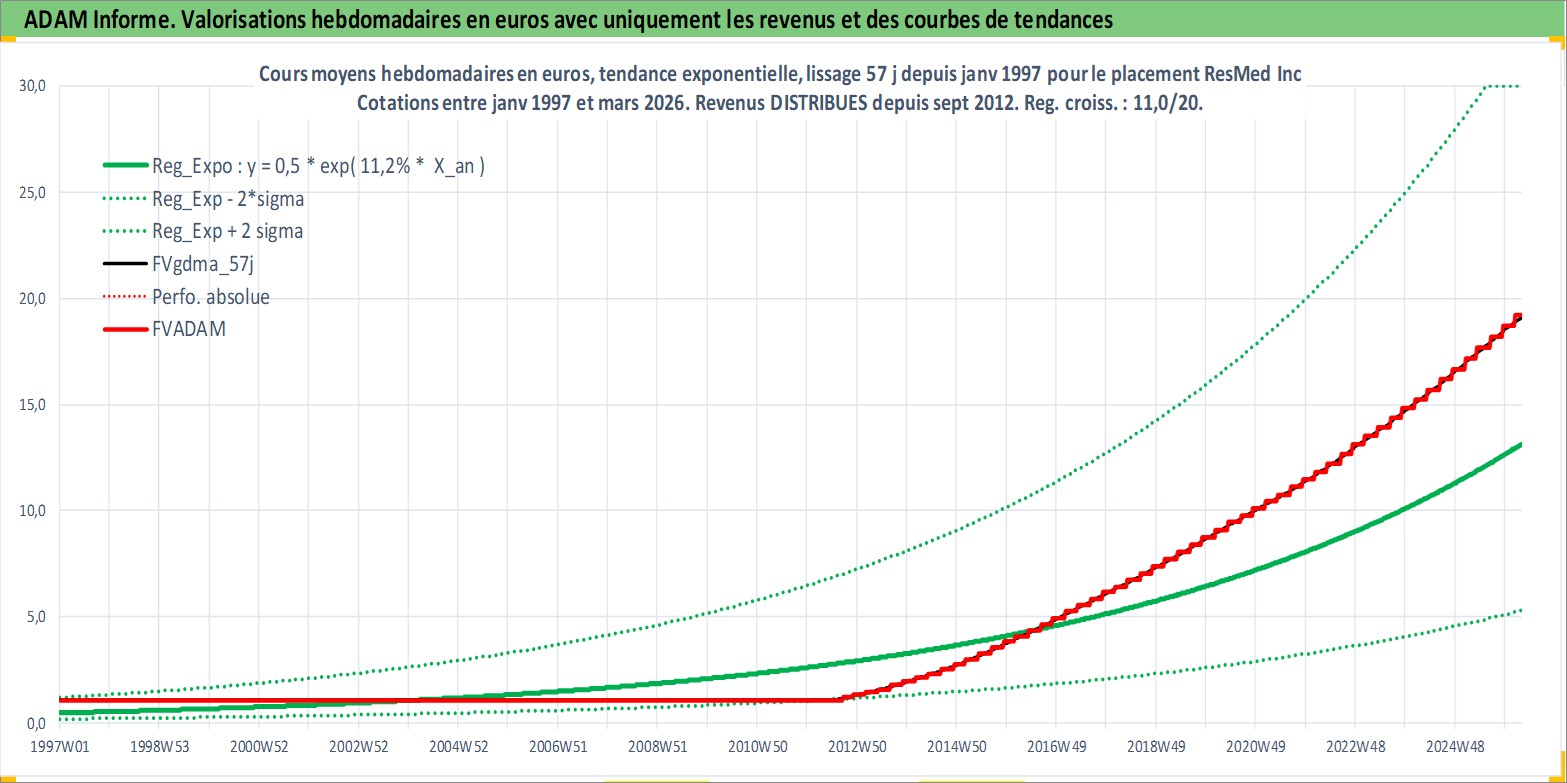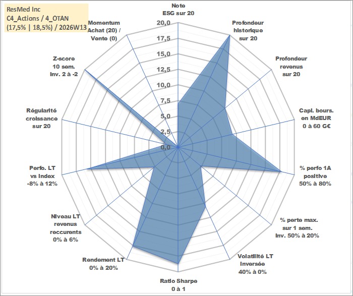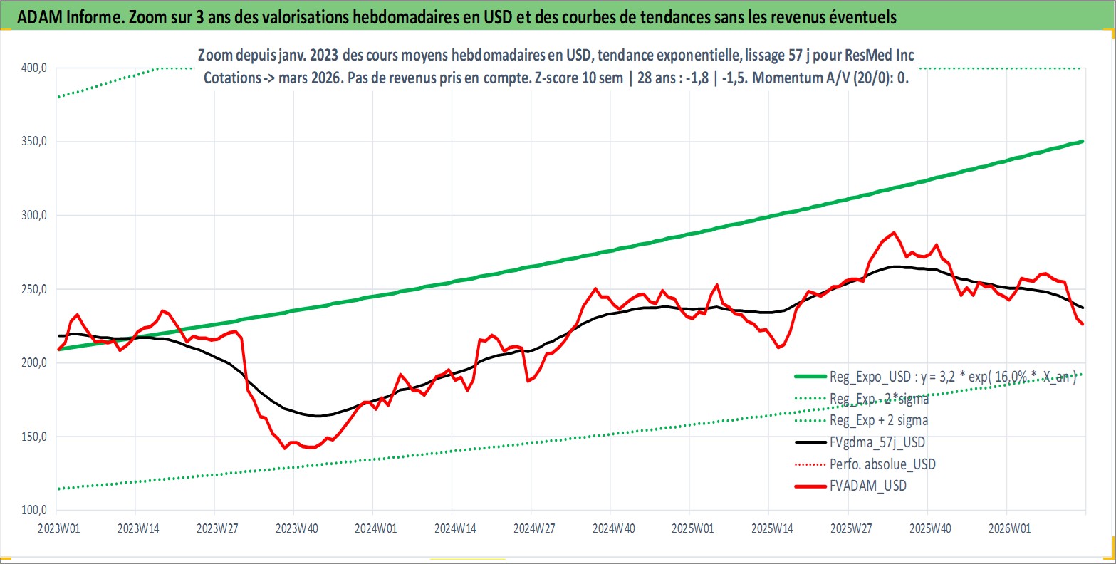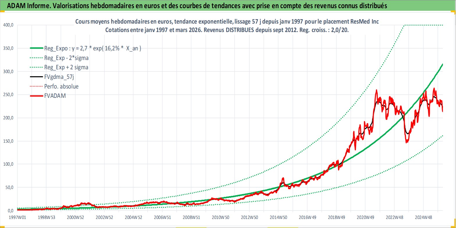 Site dédié aux investisseursPage dédiée sur site financeAnalyse des valorisations hebdomadaires de l'action ResMed Inc. Cet actif est cote en USD. Les valorisations sont en contrevaleur EURO et couvrent les semaines 1997W01 a 2026W13. Les revenus de cet actif financier sont pris en compte depuis la semaine 2012W36. La note globale ESG de cet actif est estimee a 7.0 (apres rebasage entre 0 et 20).