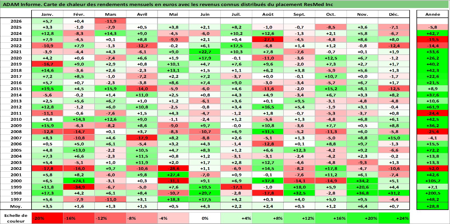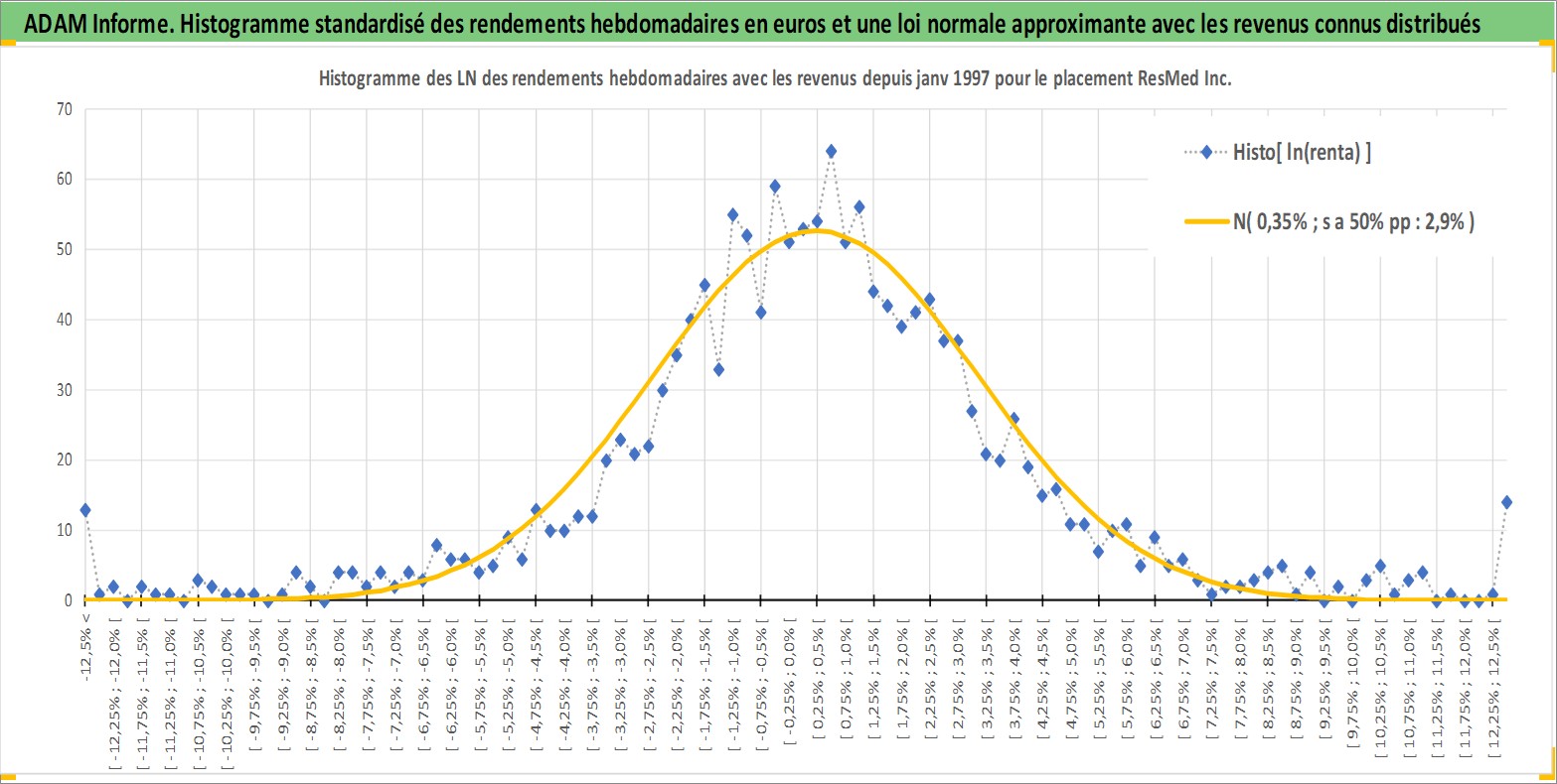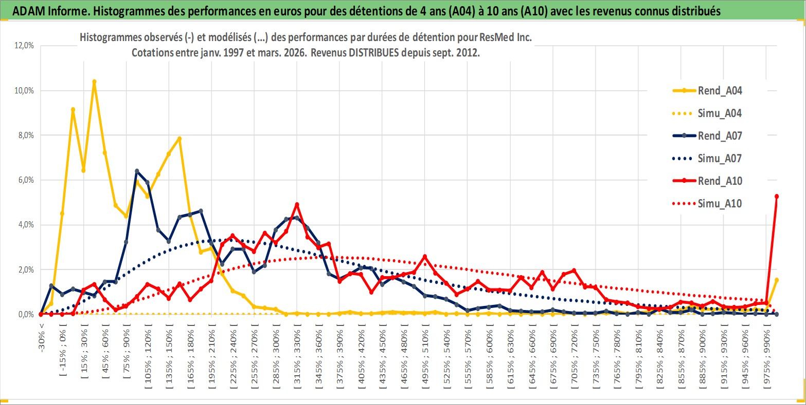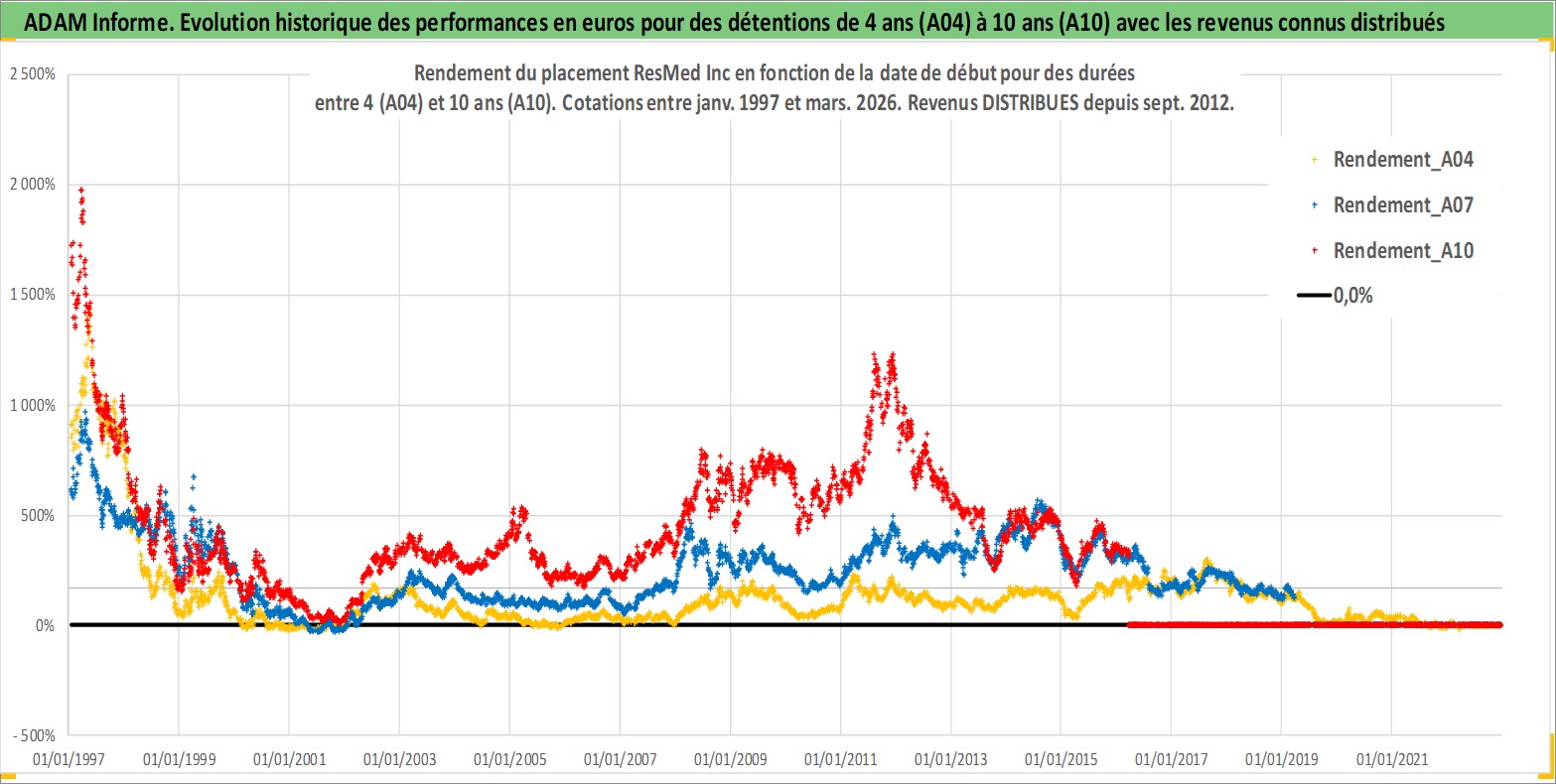 Site dédié aux investisseursPage dédiée sur site financeAnalyse des valorisations hebdomadaires de l'action ResMed Inc. Cet actif est cote en USD. Les valorisations sont en contrevaleur EURO et couvrent les semaines 1997W01 a 2026W13. Les revenus de cet actif financier sont pris en compte depuis la semaine 2012W36. La note globale ESG de cet actif est estimee a 7.0 (apres rebasage entre 0 et 20).