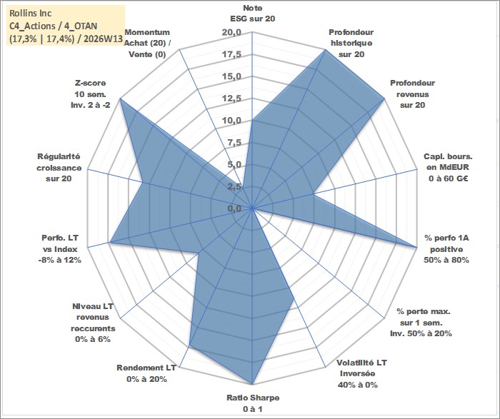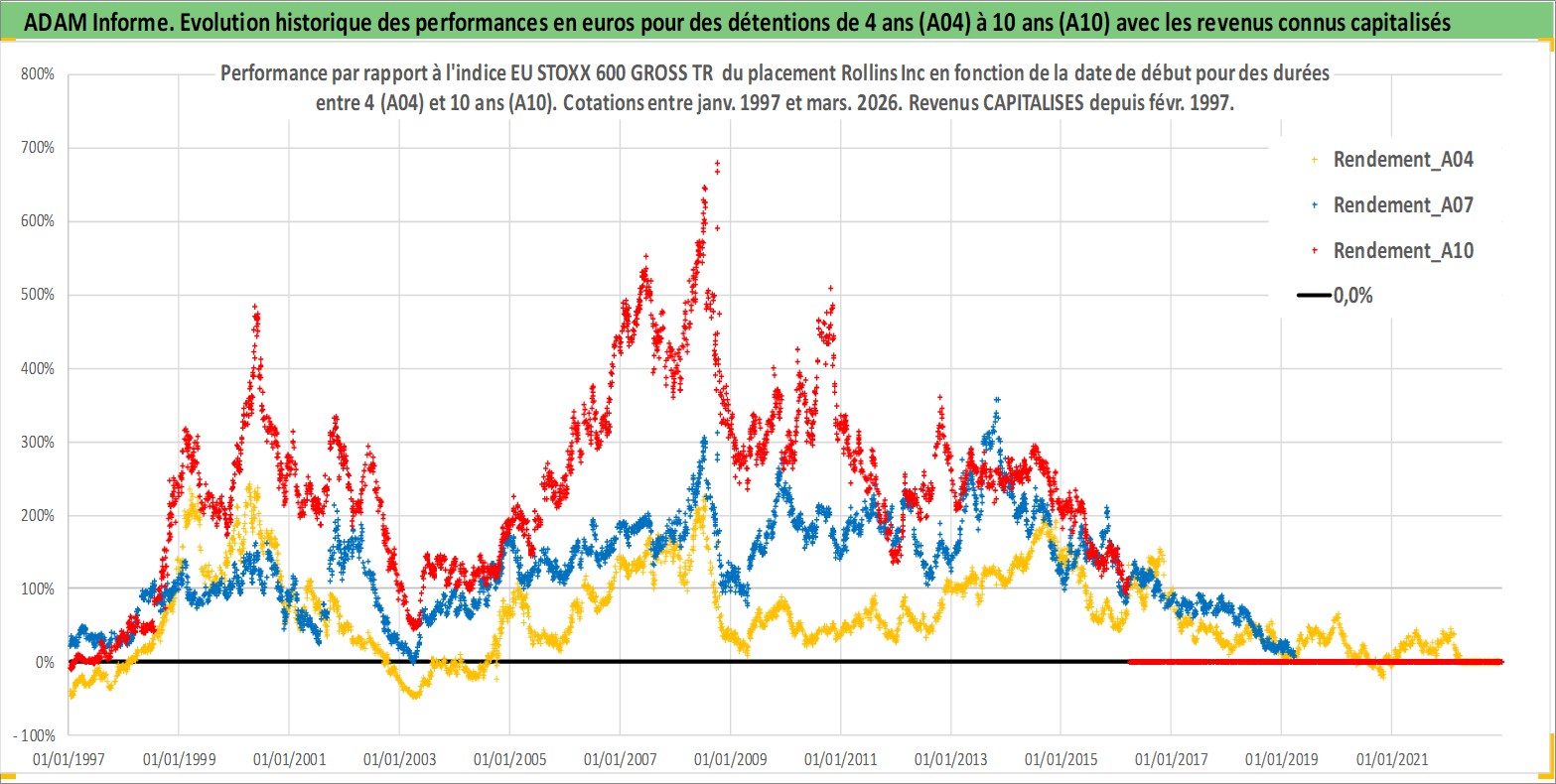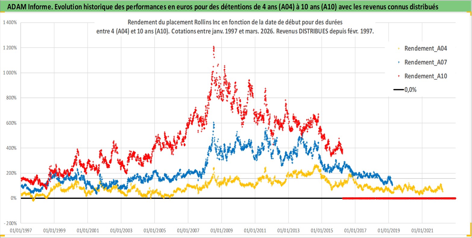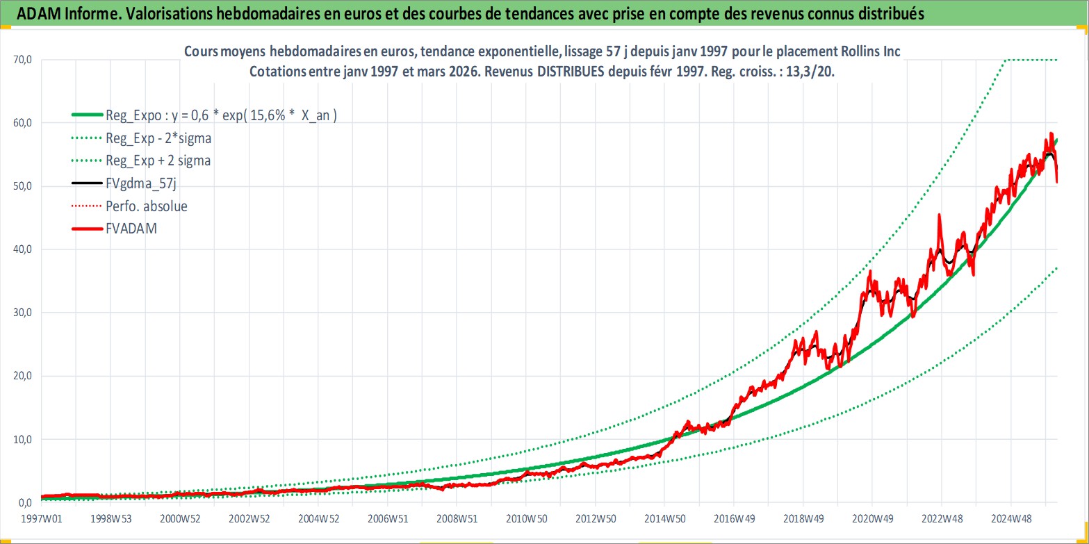 Site dédié aux investisseursPage dédiée sur site financeAnalyse des valorisations hebdomadaires de l'action Rollins Inc. Cet actif est cote en USD. Les valorisations sont en contrevaleur EURO et couvrent les semaines 1997W01 a 2026W13. Les revenus de cet actif financier sont pris en compte depuis la semaine 1997W06. La note globale ESG de cet actif est estimee a 10.0 (apres rebasage entre 0 et 20).
