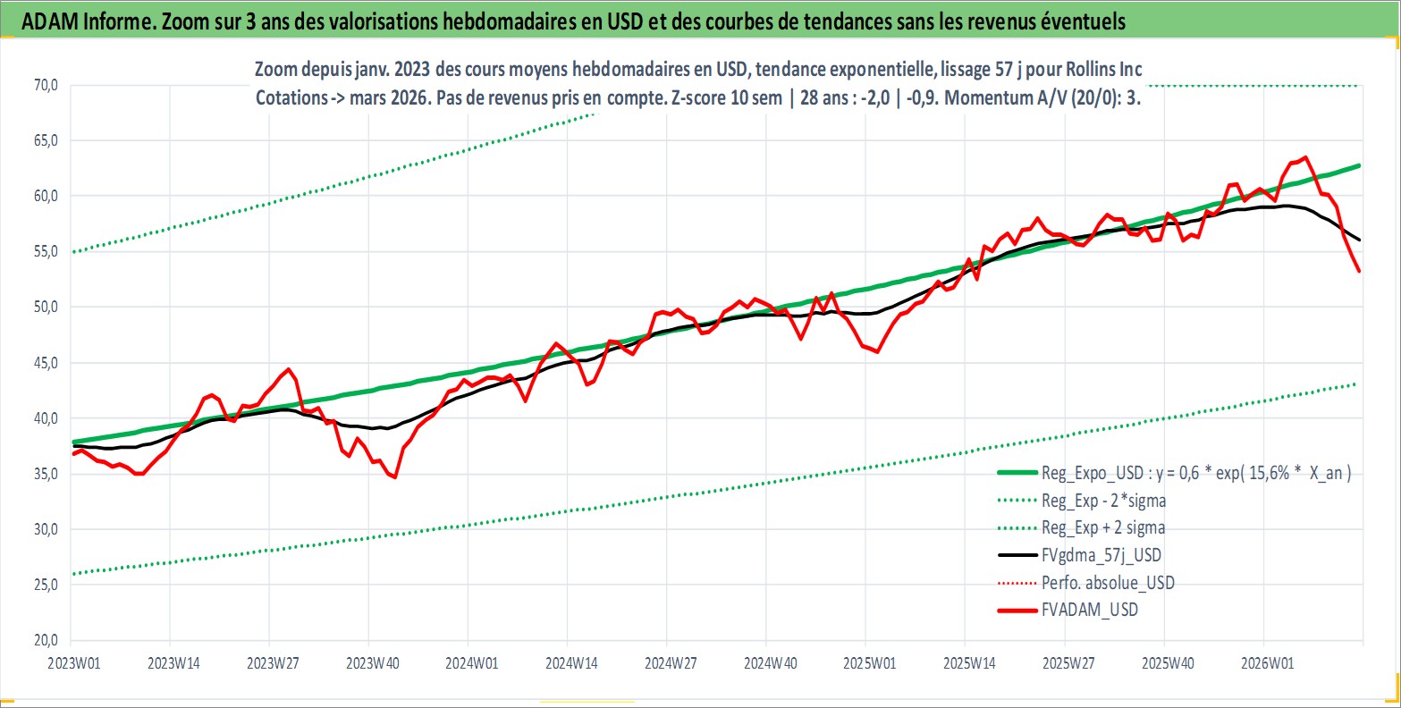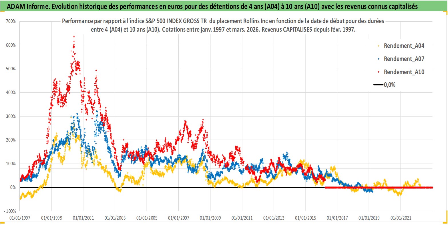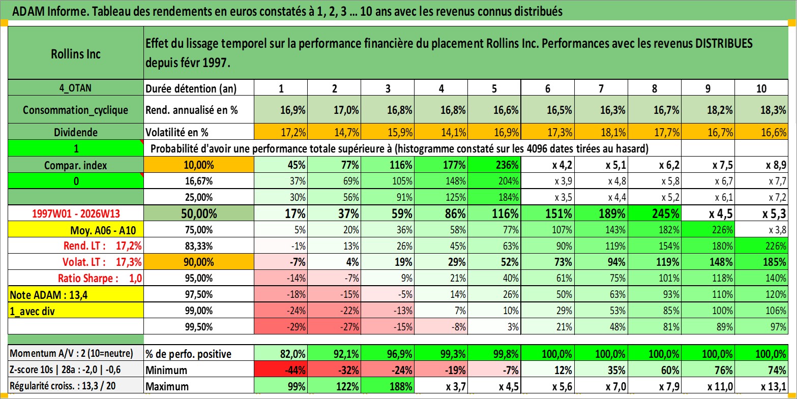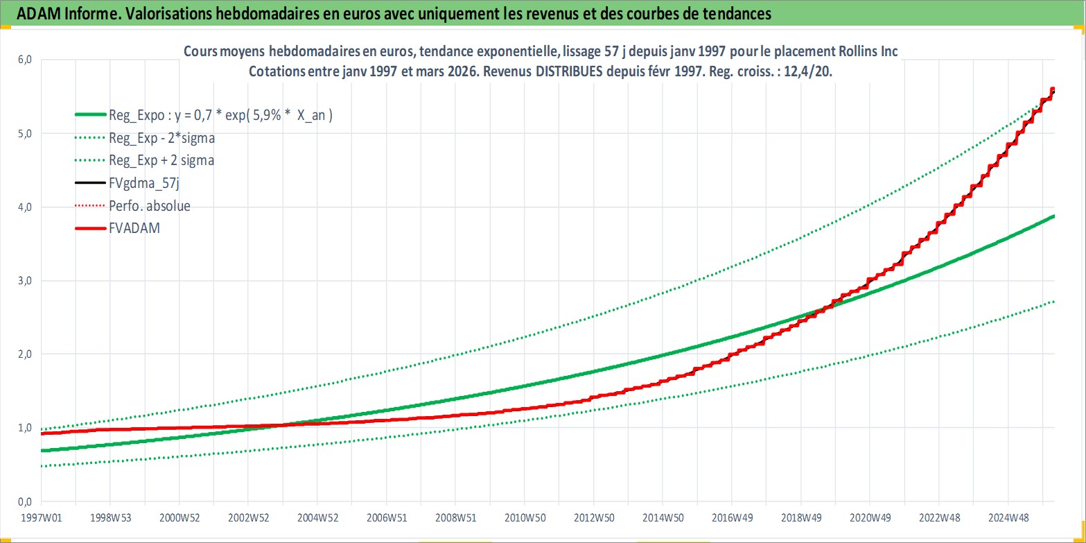 Site dédié aux investisseursPage dédiée sur site financeAnalyse des valorisations hebdomadaires de l'action Rollins Inc. Cet actif est cote en USD. Les valorisations sont en contrevaleur EURO et couvrent les semaines 1997W01 a 2026W13. Les revenus de cet actif financier sont pris en compte depuis la semaine 1997W06. La note globale ESG de cet actif est estimee a 10.0 (apres rebasage entre 0 et 20).