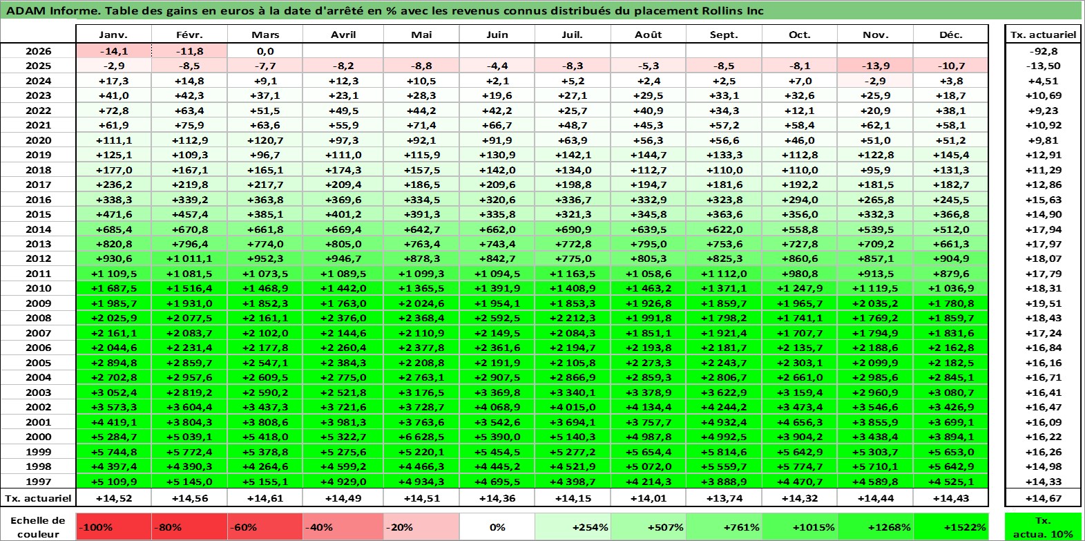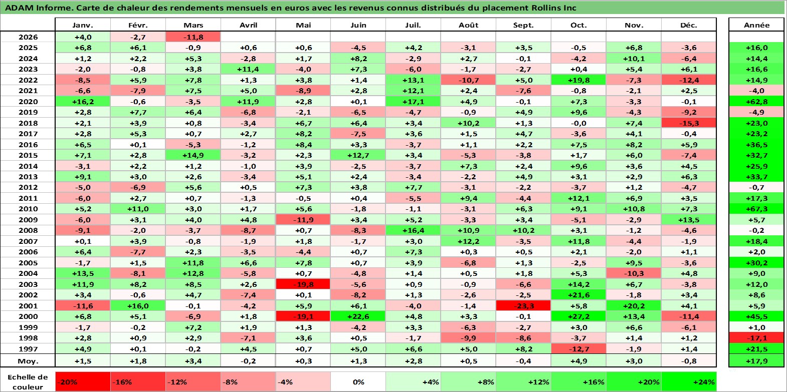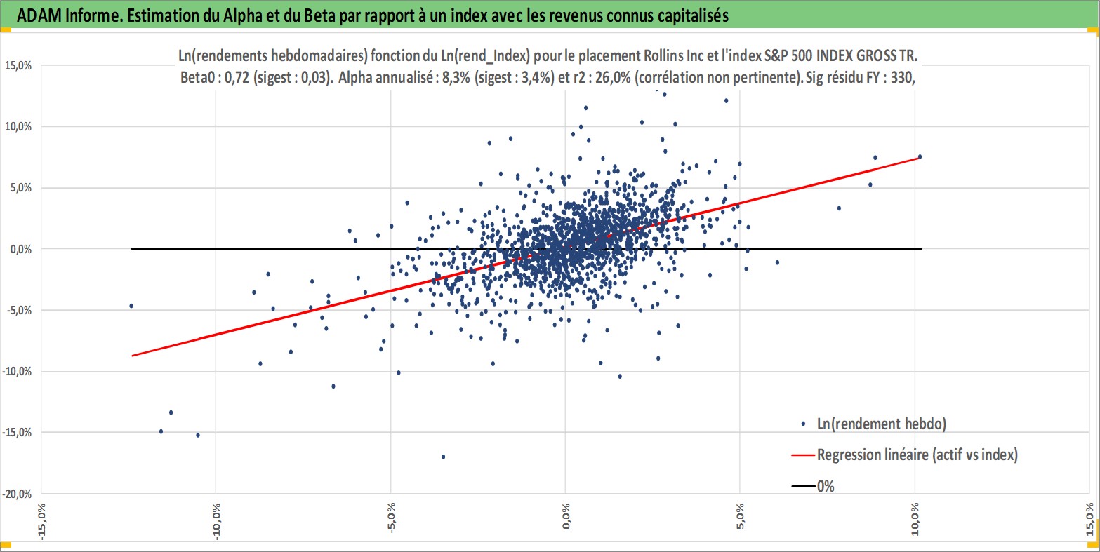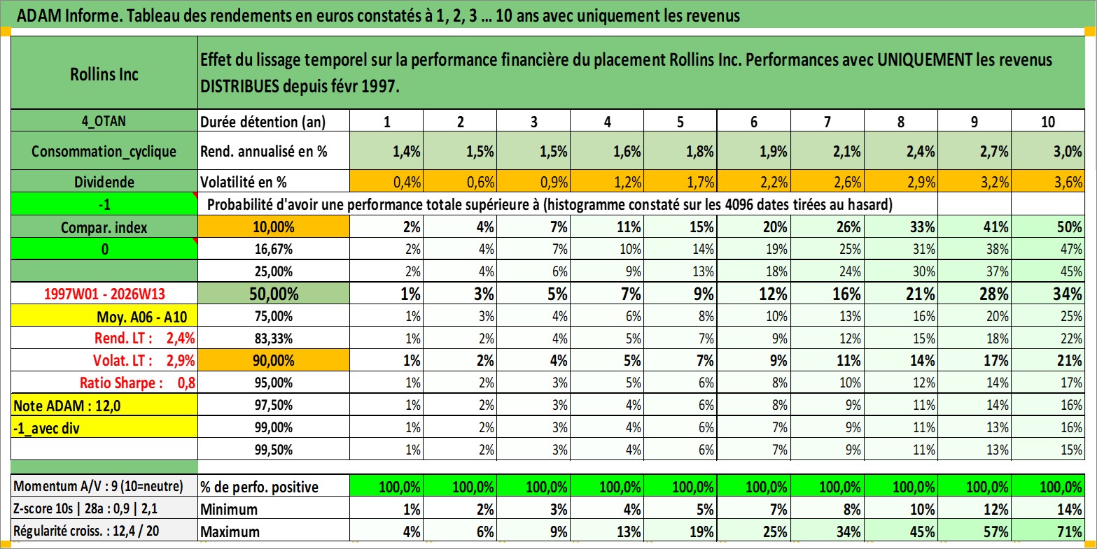 Site dédié aux investisseursPage dédiée sur site financeAnalyse des valorisations hebdomadaires de l'action Rollins Inc. Cet actif est cote en USD. Les valorisations sont en contrevaleur EURO et couvrent les semaines 1997W01 a 2026W13. Les revenus de cet actif financier sont pris en compte depuis la semaine 1997W06. La note globale ESG de cet actif est estimee a 10.0 (apres rebasage entre 0 et 20).