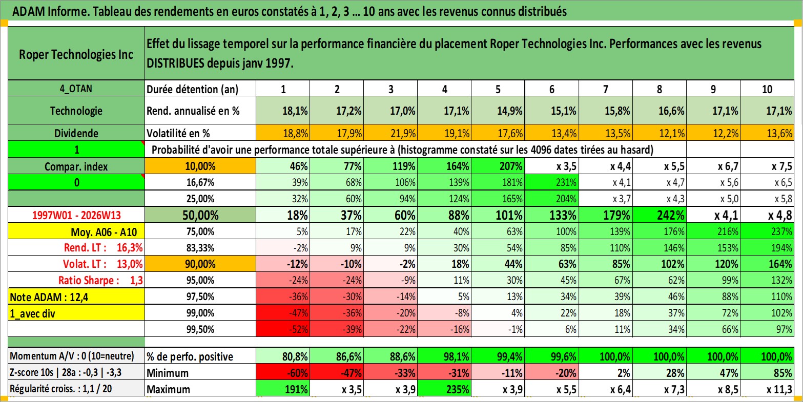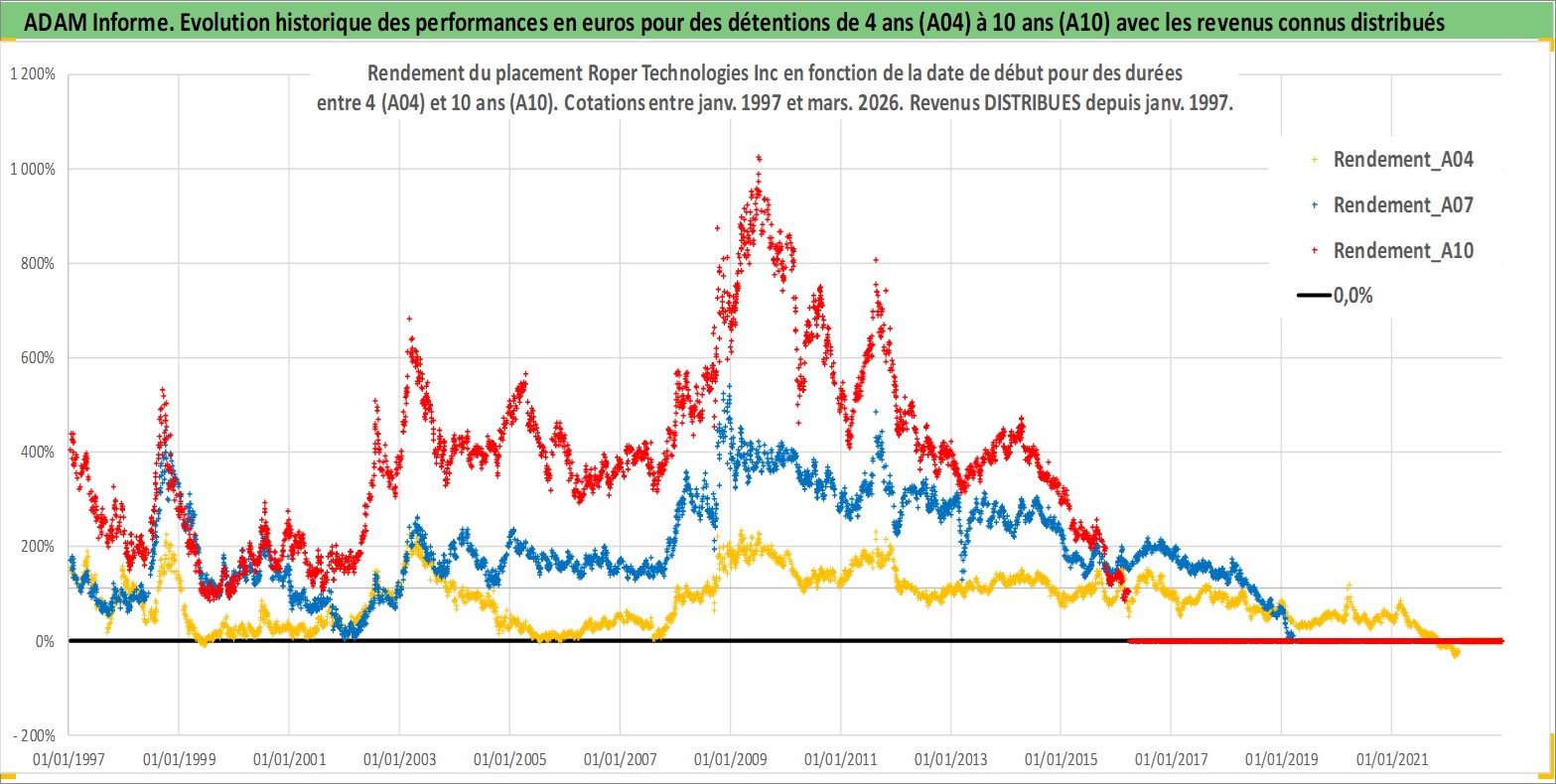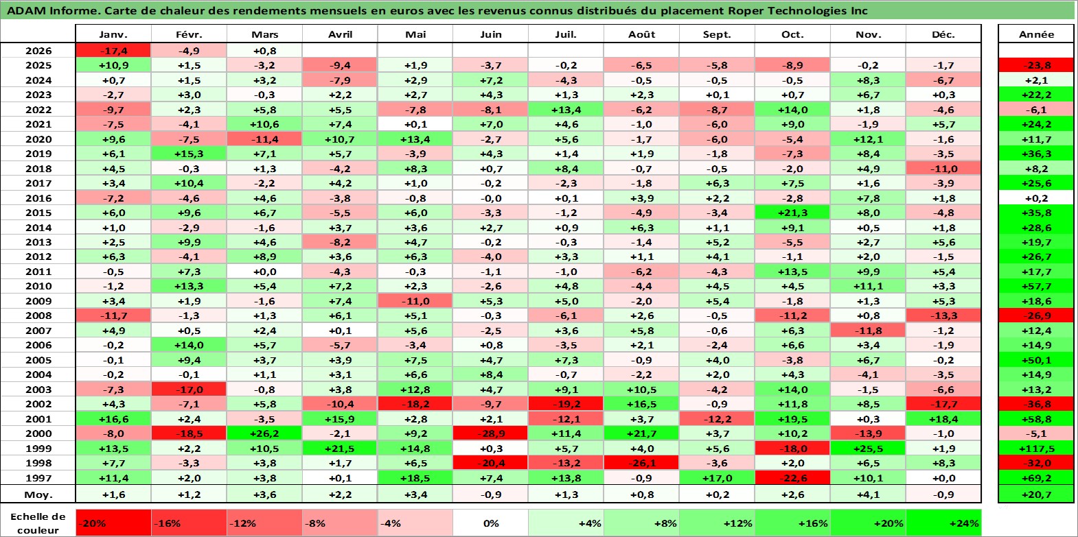 Site dédié aux investisseursPage dédiée sur site financeAnalyse des valorisations hebdomadaires de l'action Roper Technologies Inc. Cet actif est cote en USD. Les valorisations sont en contrevaleur EURO et couvrent les semaines 1997W01 a 2026W13. Les revenus de cet actif financier sont pris en compte depuis la semaine 1997W02. La note globale ESG de cet actif est estimee a 9.0 (apres rebasage entre 0 et 20).