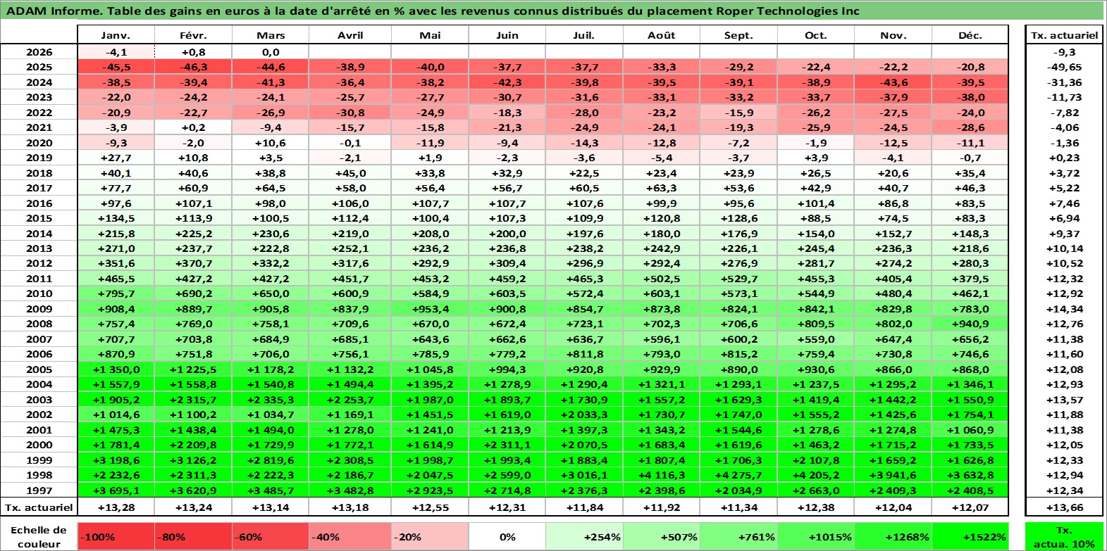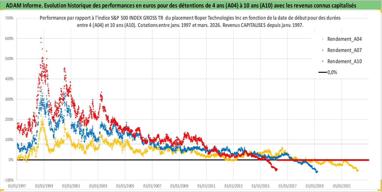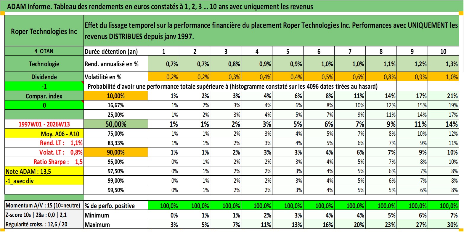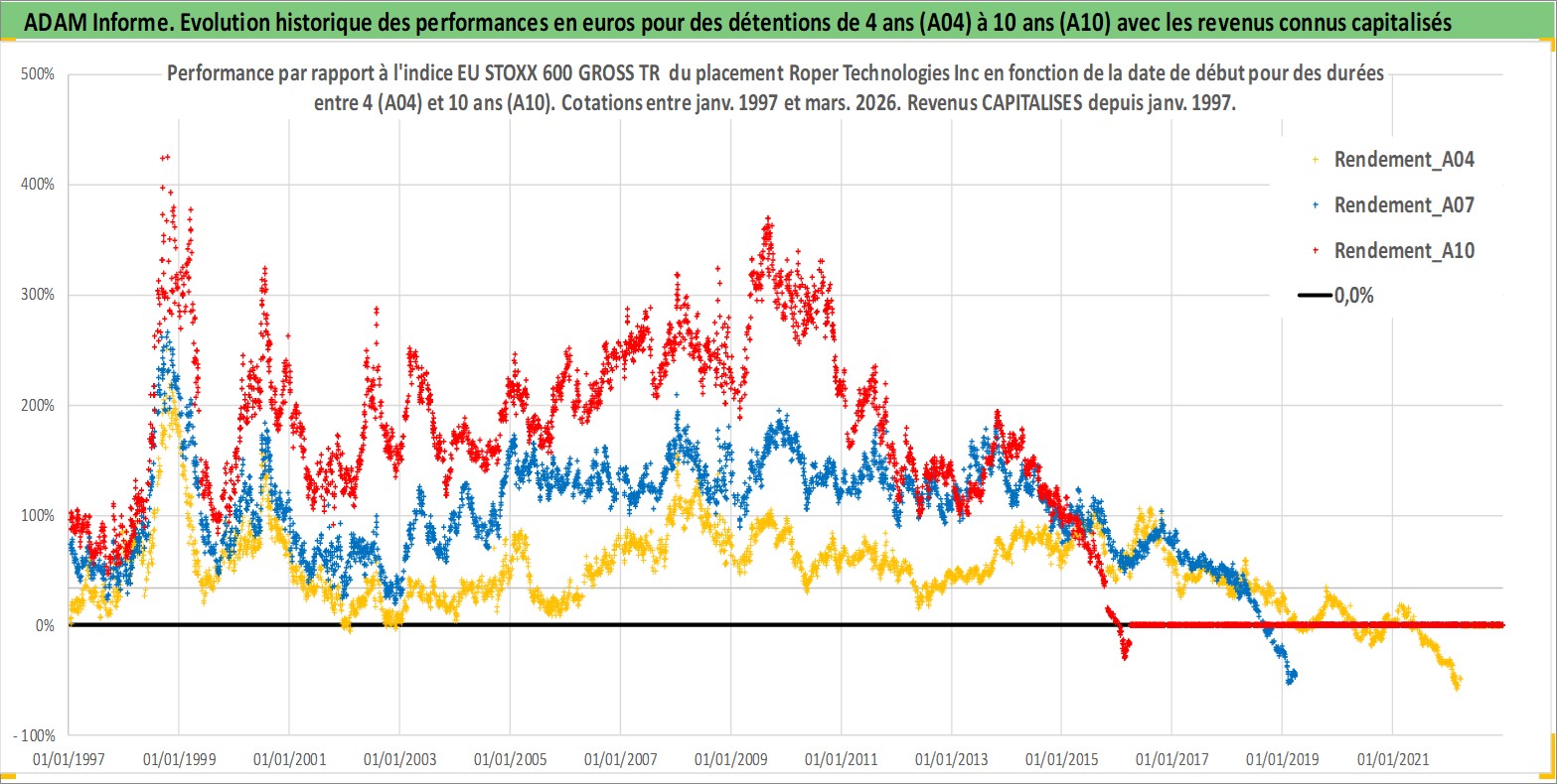 Site dédié aux investisseursPage dédiée sur site financeAnalyse des valorisations hebdomadaires de l'action Roper Technologies Inc. Cet actif est cote en USD. Les valorisations sont en contrevaleur EURO et couvrent les semaines 1997W01 a 2026W13. Les revenus de cet actif financier sont pris en compte depuis la semaine 1997W02. La note globale ESG de cet actif est estimee a 9.0 (apres rebasage entre 0 et 20).