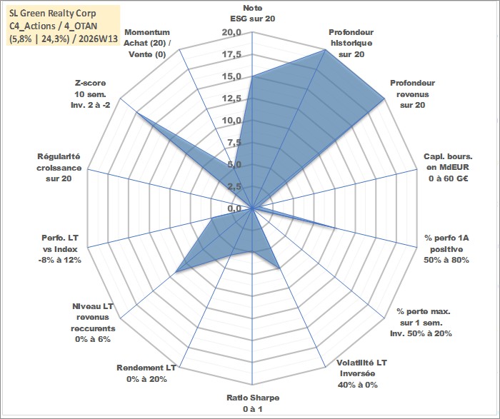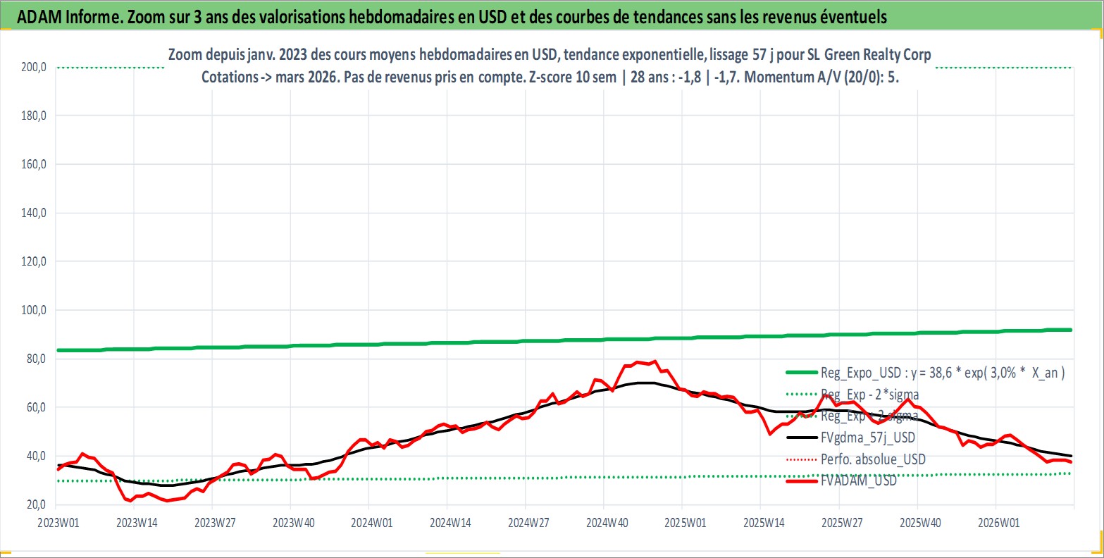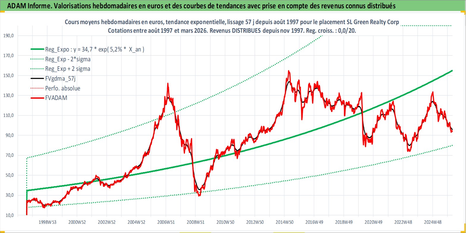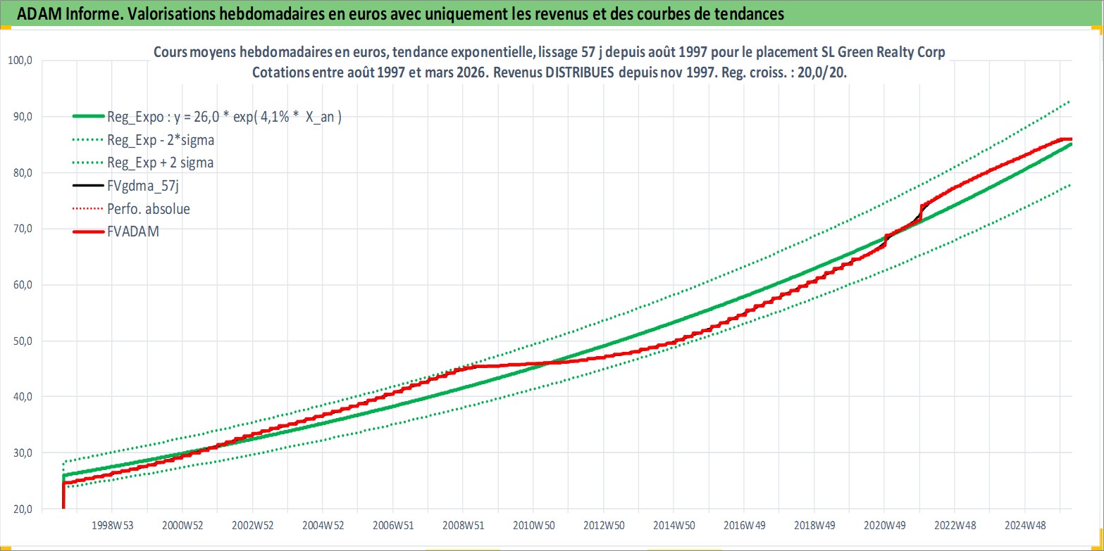Site dédié aux investisseursPage dédiée sur site financeAnalyse des valorisations hebdomadaires de l'action SL Green Realty Corp. Cet actif est cote en USD. Les valorisations sont en contrevaleur EURO et couvrent les semaines 1997W33 a 2026W13. Les revenus de cet actif financier sont pris en compte depuis la semaine 1997W46. La note globale ESG de cet actif est estimee a 15.0 (apres rebasage entre 0 et 20).