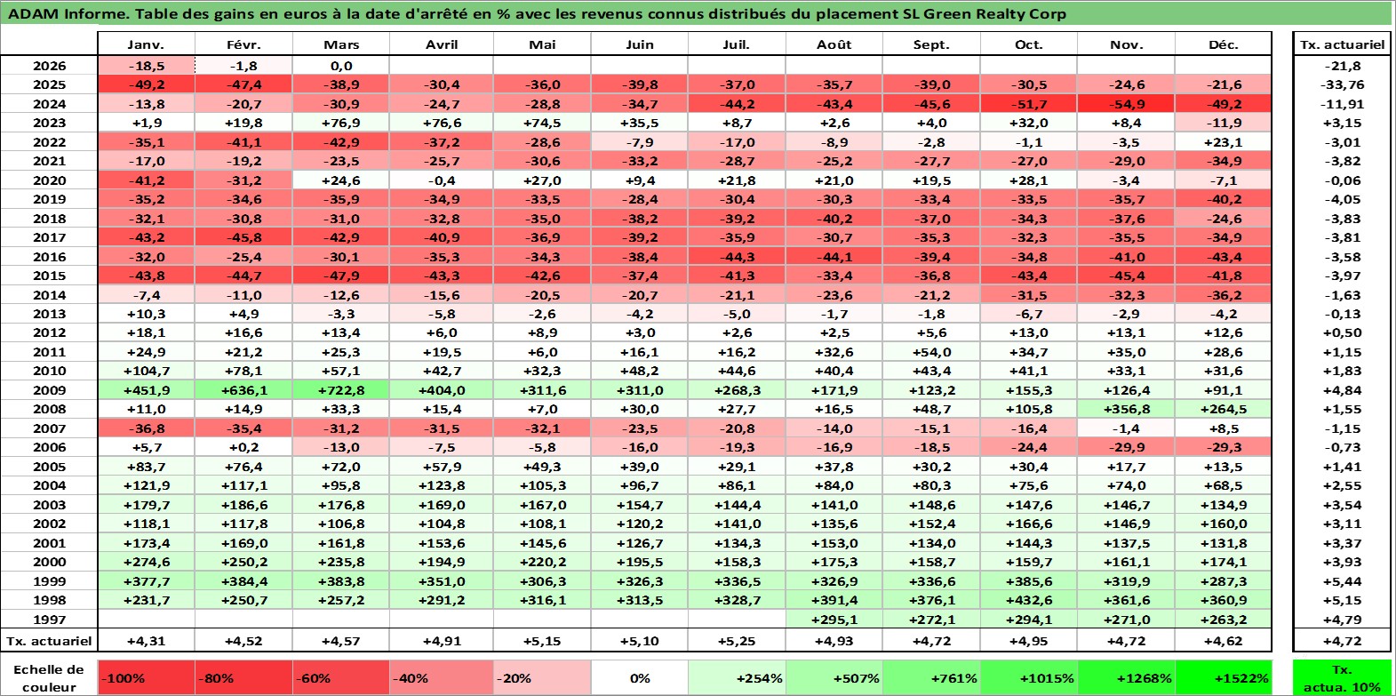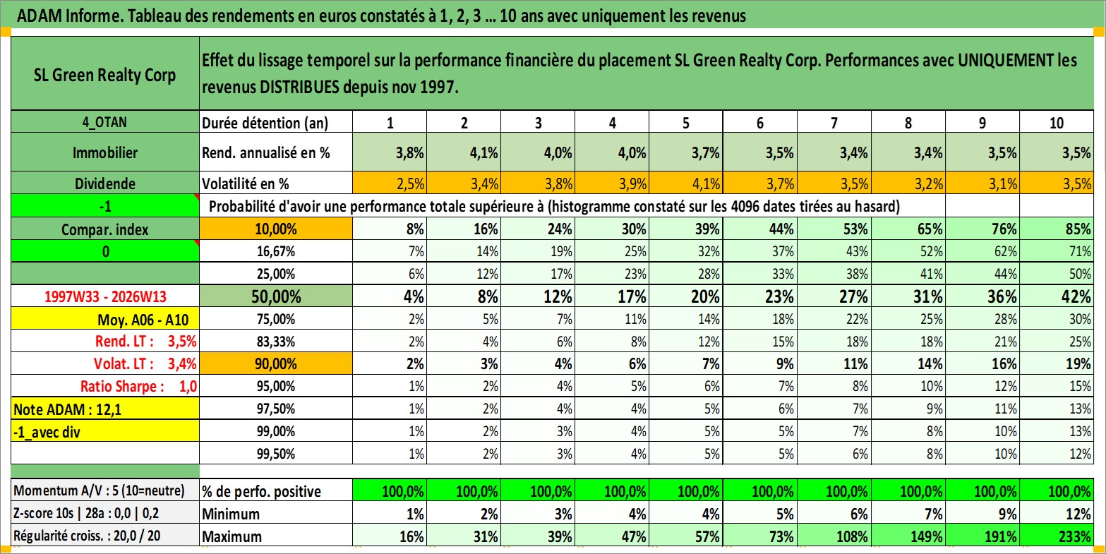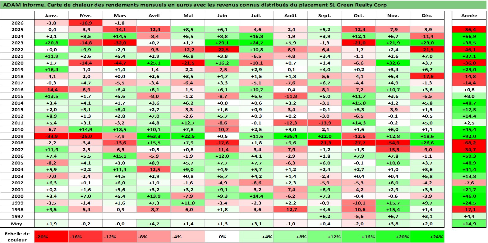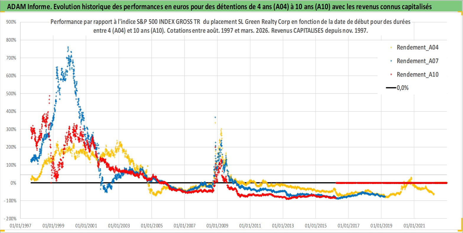 Site dédié aux investisseursPage dédiée sur site financeAnalyse des valorisations hebdomadaires de l'action SL Green Realty Corp. Cet actif est cote en USD. Les valorisations sont en contrevaleur EURO et couvrent les semaines 1997W33 a 2026W13. Les revenus de cet actif financier sont pris en compte depuis la semaine 1997W46. La note globale ESG de cet actif est estimee a 15.0 (apres rebasage entre 0 et 20).