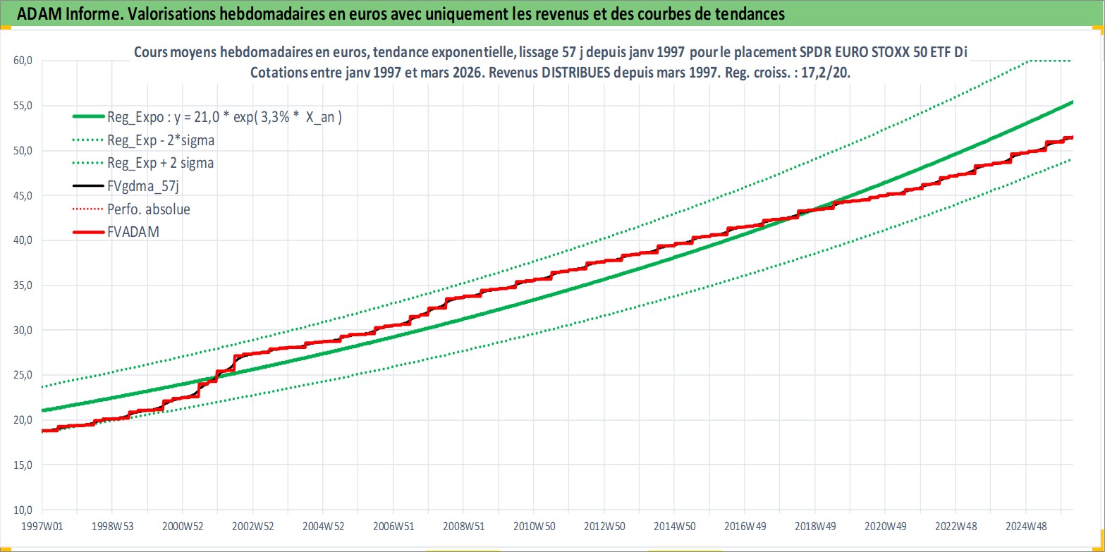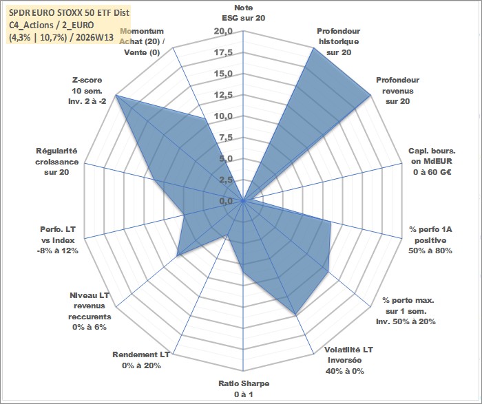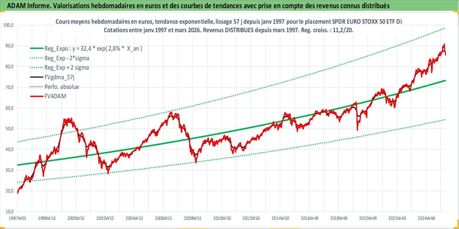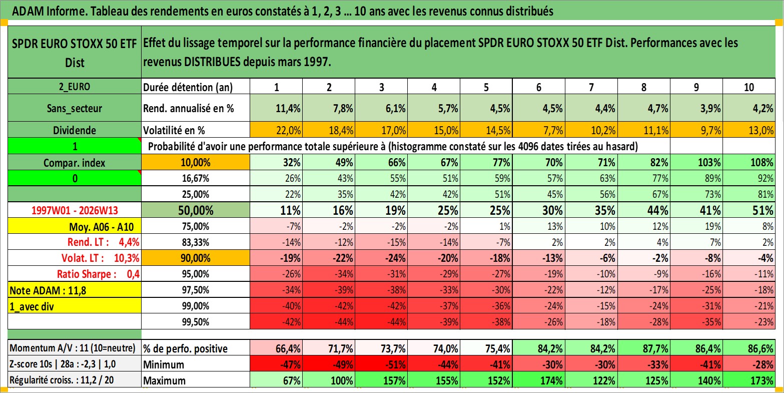 Site dédié aux investisseursPage dédiée sur site financeAnalyse des valorisations hebdomadaires du fonds SPDR EURO STOXX 50 ETF Dist. Cet actif est cote en USD. Les valorisations sont en contrevaleur EURO et couvrent les semaines 1997W01 a 2026W13. Les revenus de cet actif financier sont pris en compte depuis la semaine 1997W12. La note ESG de cet actif n'est pas connue.