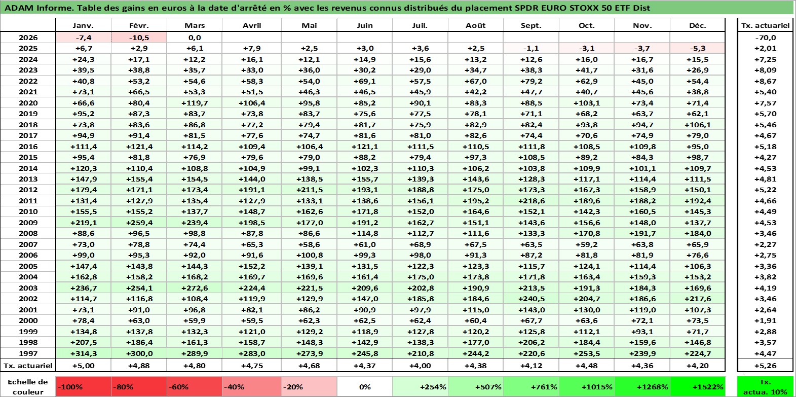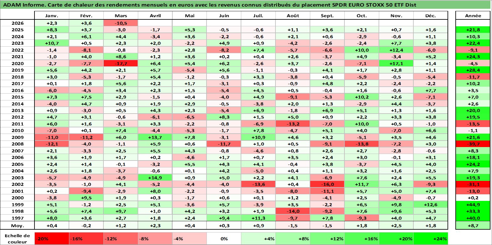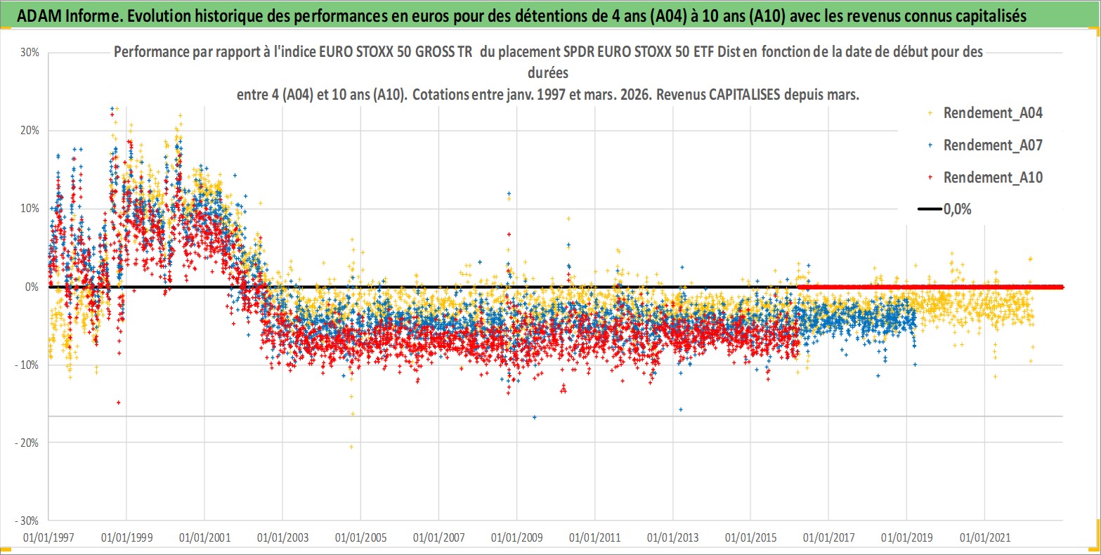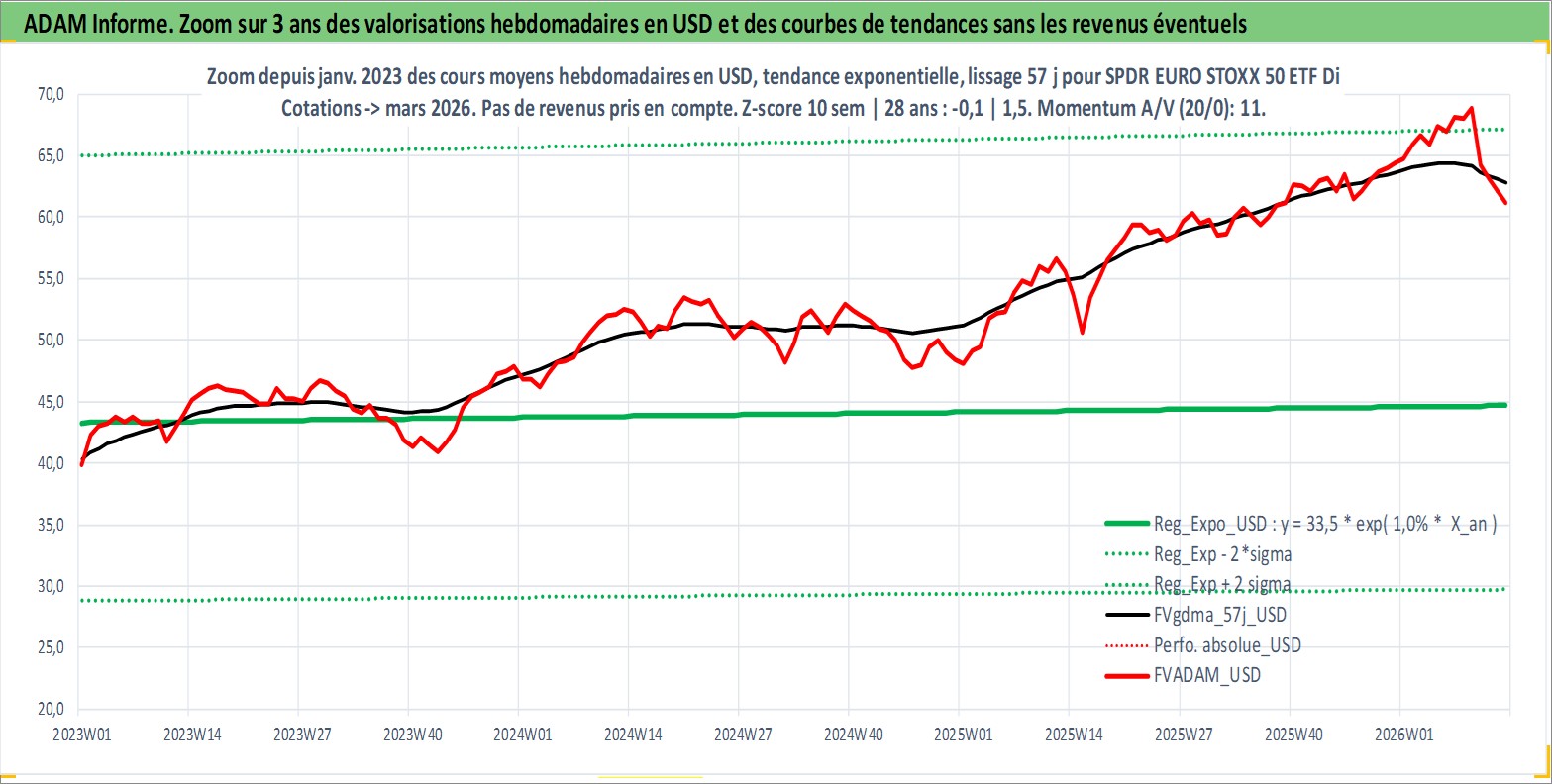 Site dédié aux investisseursPage dédiée sur site financeAnalyse des valorisations hebdomadaires du fonds SPDR EURO STOXX 50 ETF Dist. Cet actif est cote en USD. Les valorisations sont en contrevaleur EURO et couvrent les semaines 1997W01 a 2026W13. Les revenus de cet actif financier sont pris en compte depuis la semaine 1997W12. La note ESG de cet actif n'est pas connue.