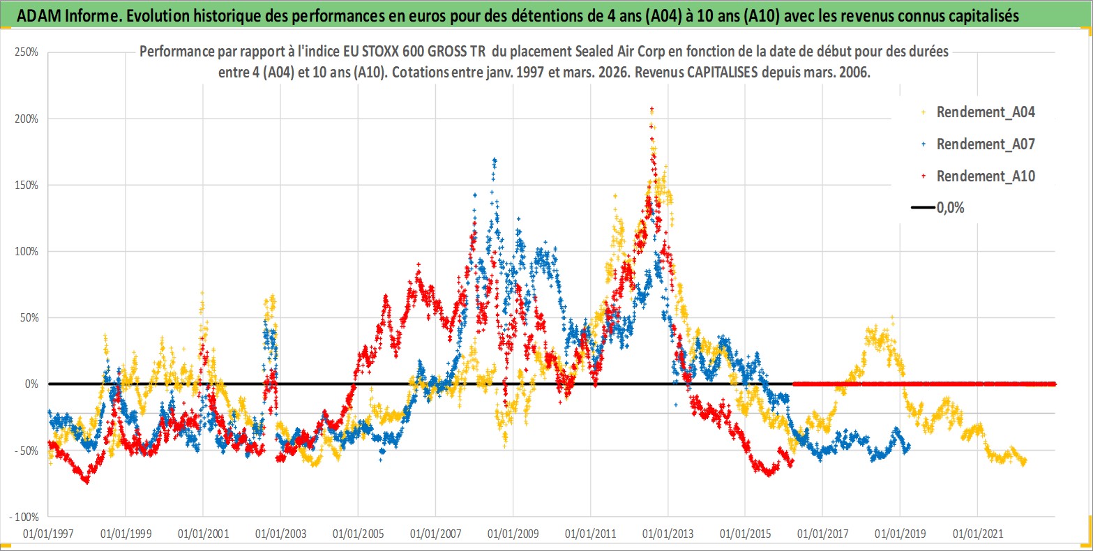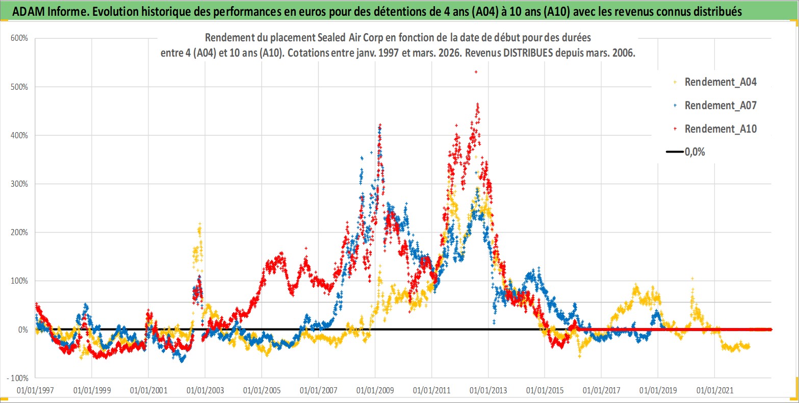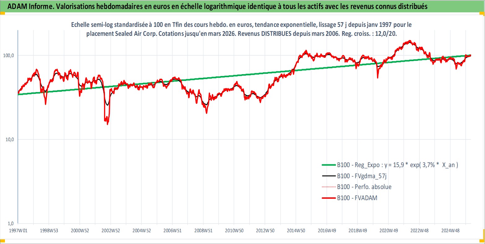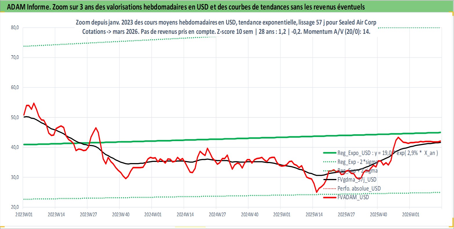 Site dédié aux investisseursPage dédiée sur site financeAnalyse des valorisations hebdomadaires de l'action Sealed Air Corp. Cet actif est cote en USD. Les valorisations sont en contrevaleur EURO et couvrent les semaines 1997W01 a 2026W13. Les revenus de cet actif financier sont pris en compte depuis la semaine 2006W09. La note globale ESG de cet actif est estimee a 10.0 (apres rebasage entre 0 et 20).