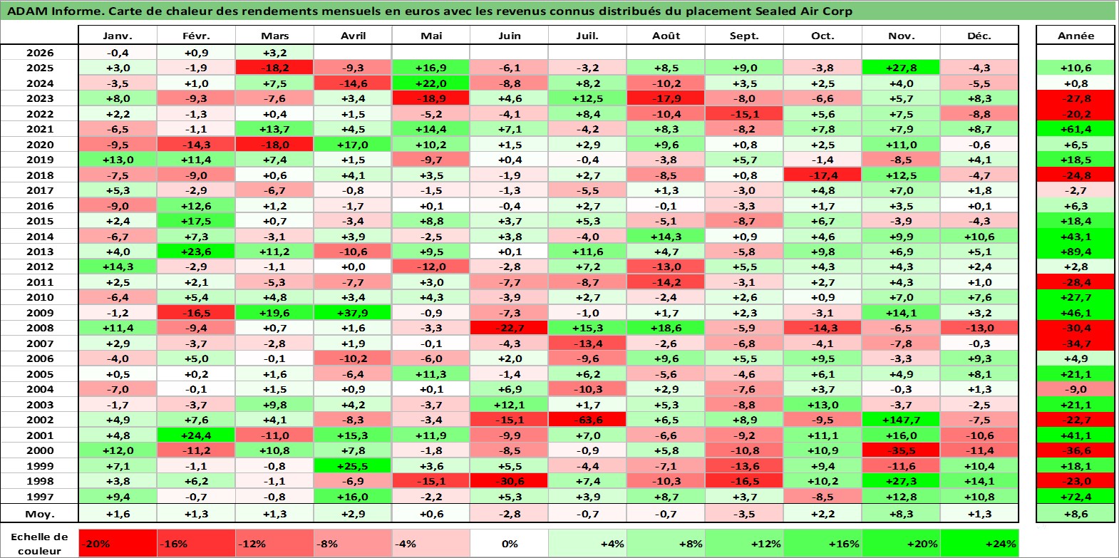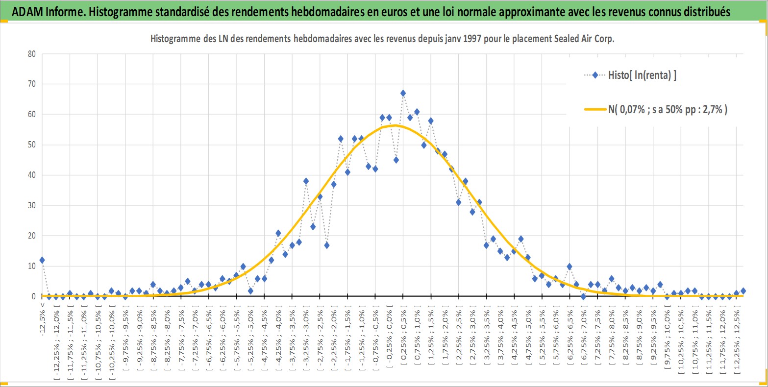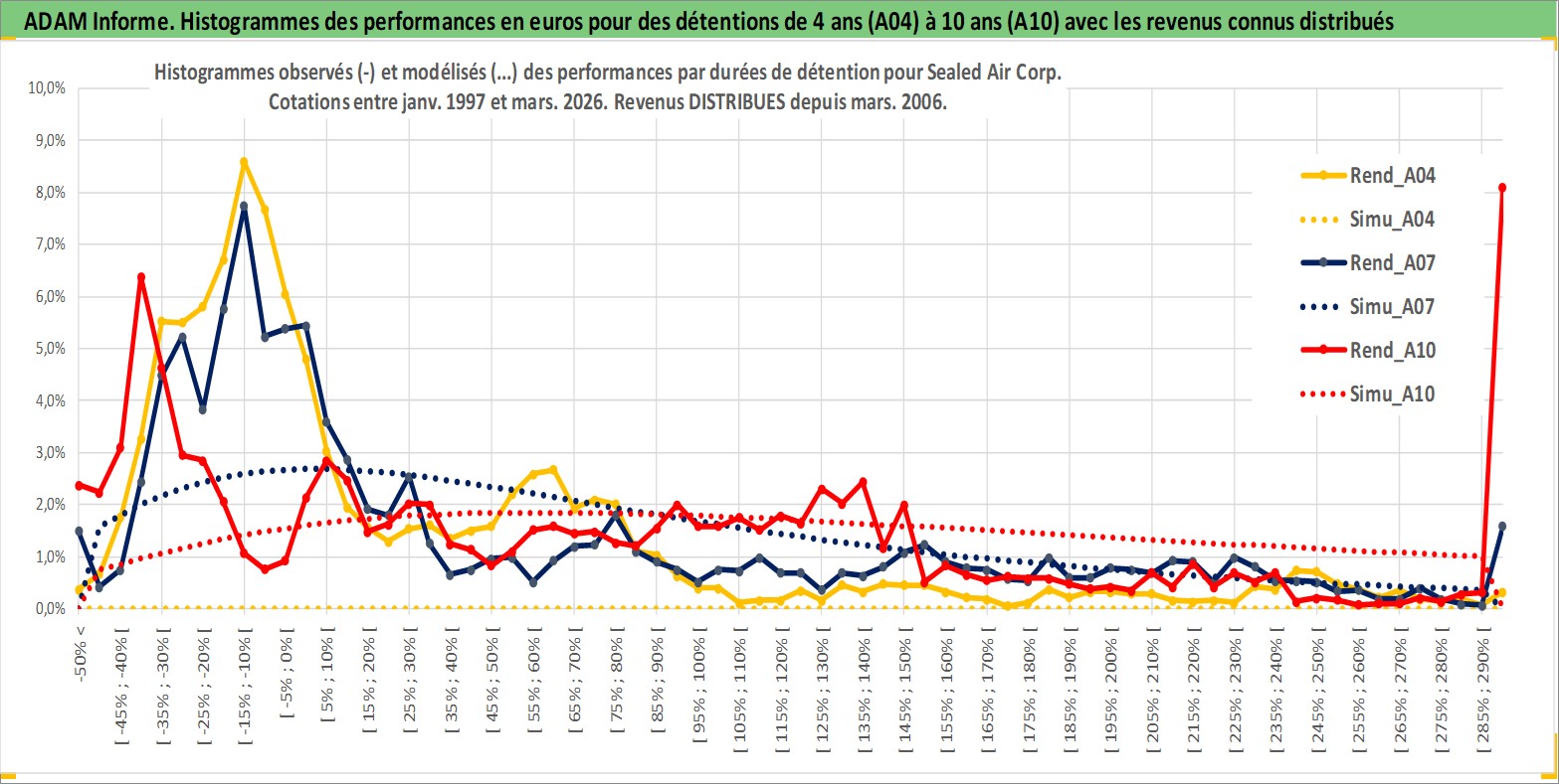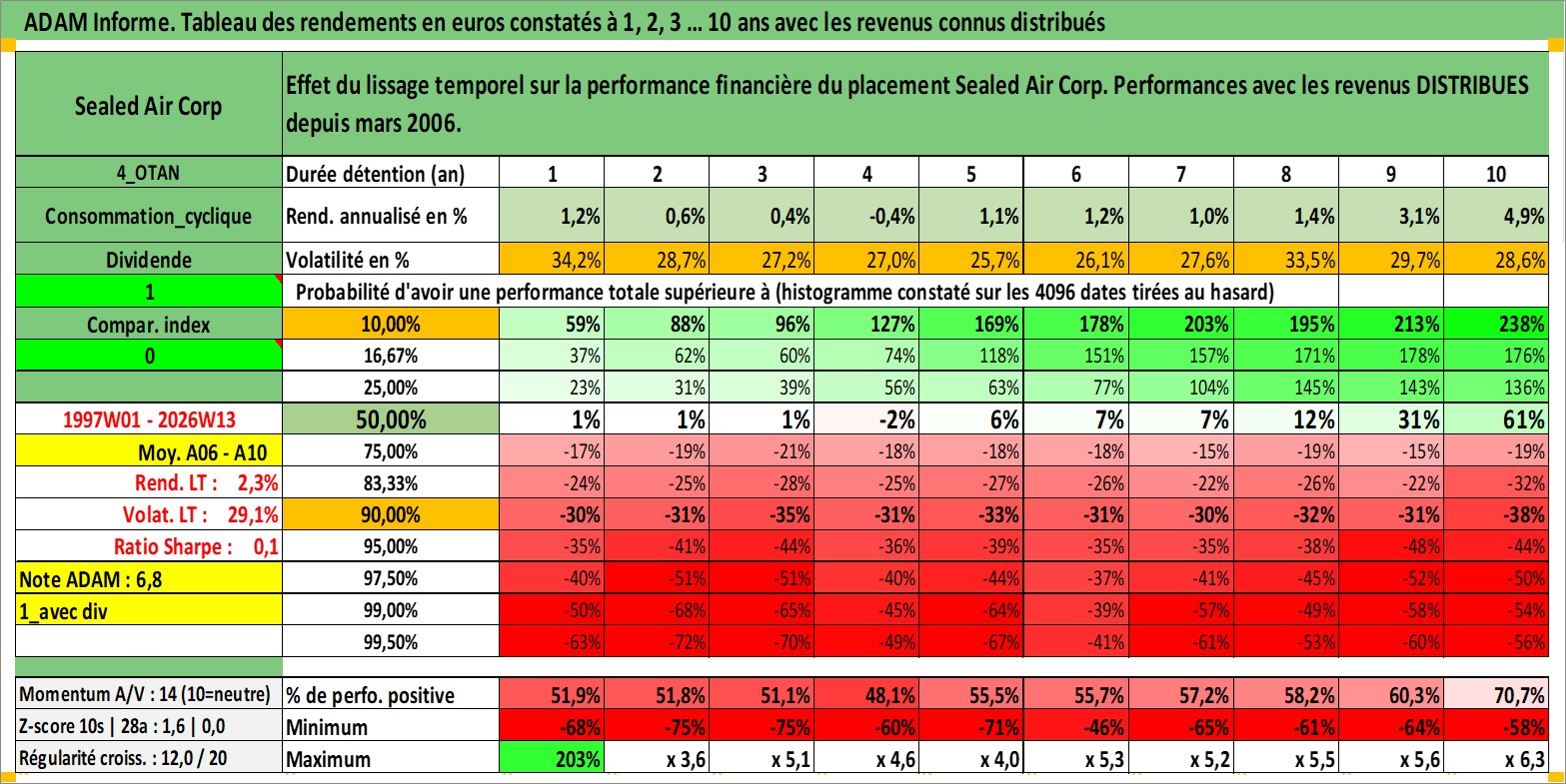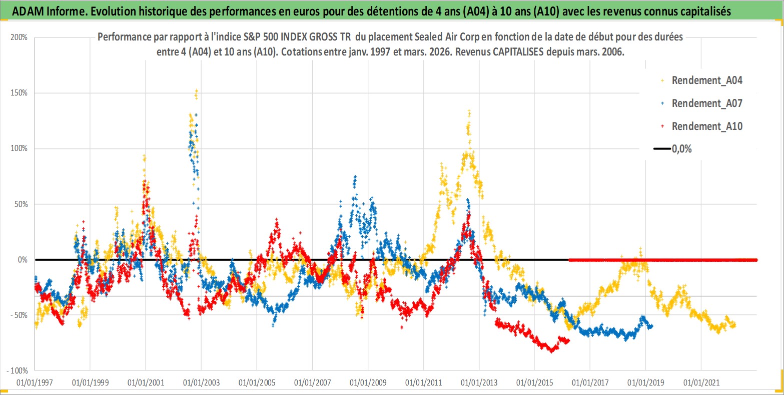 Site dédié aux investisseursPage dédiée sur site financeAnalyse des valorisations hebdomadaires de l'action Sealed Air Corp. Cet actif est cote en USD. Les valorisations sont en contrevaleur EURO et couvrent les semaines 1997W01 a 2026W13. Les revenus de cet actif financier sont pris en compte depuis la semaine 2006W09. La note globale ESG de cet actif est estimee a 10.0 (apres rebasage entre 0 et 20).