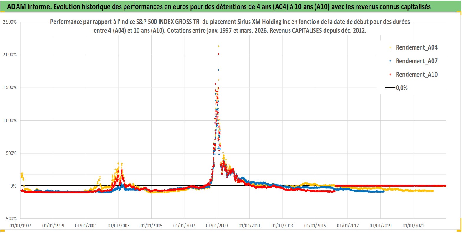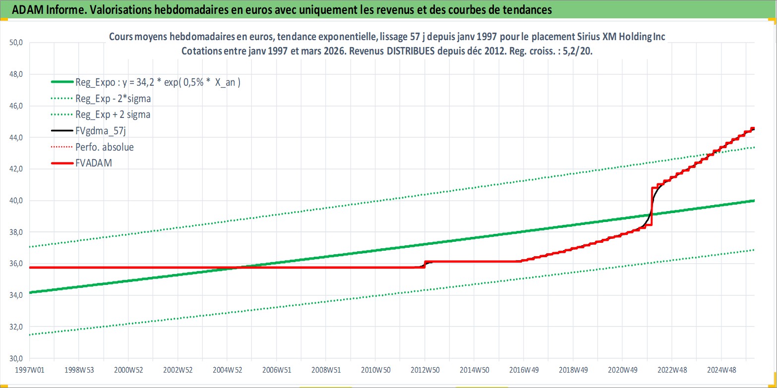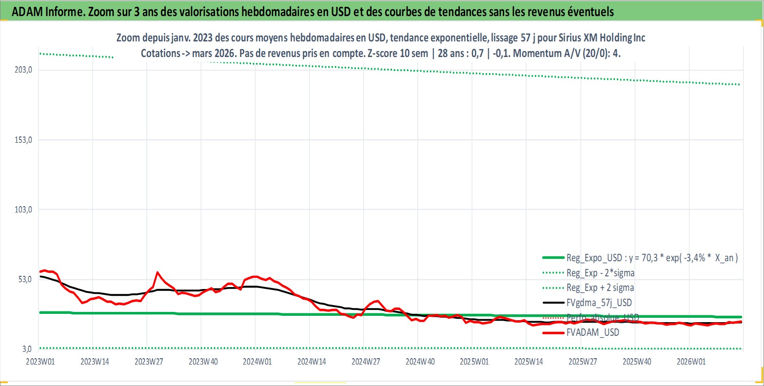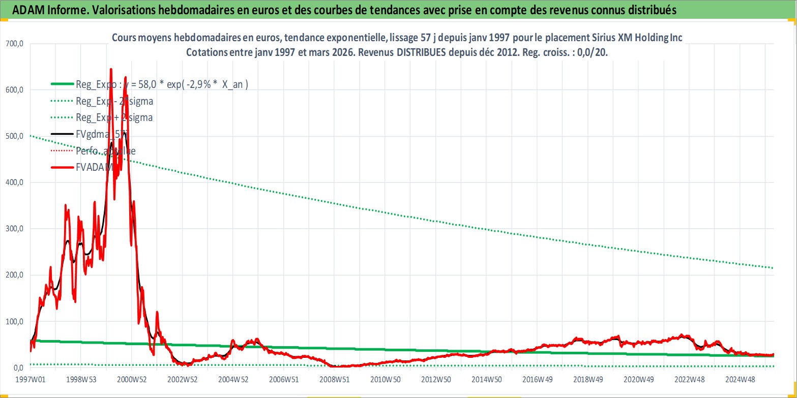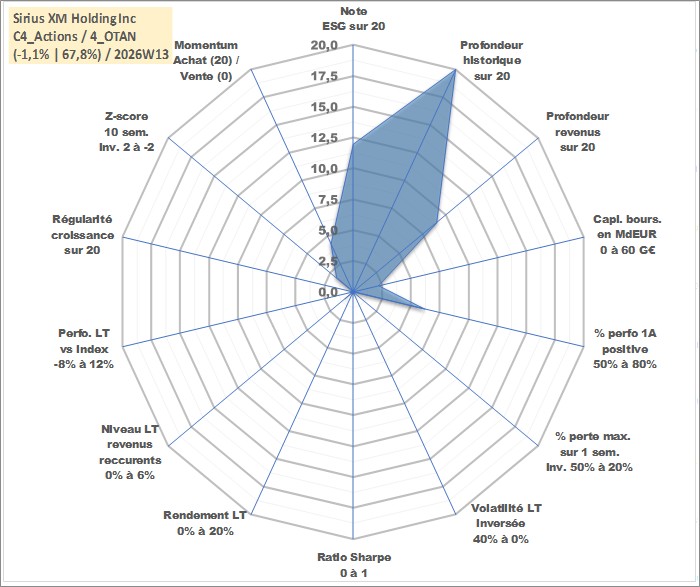 Site dédié aux investisseursPage dédiée sur site financeAnalyse des valorisations hebdomadaires de l'action Sirius XM Holding Inc. Cet actif est cote en USD. Les valorisations sont en contrevaleur EURO et couvrent les semaines 1997W01 a 2026W13. Les revenus de cet actif financier sont pris en compte depuis la semaine 2012W50. La note globale ESG de cet actif est estimee a 12.0 (apres rebasage entre 0 et 20).