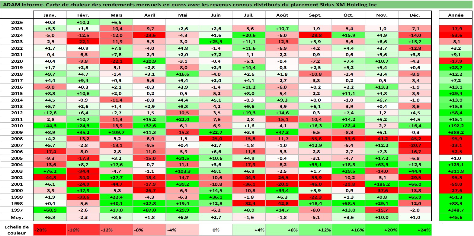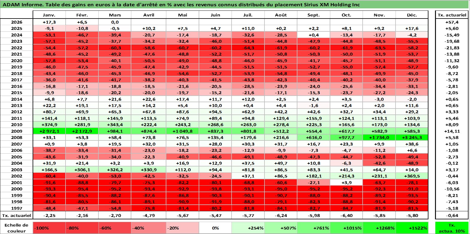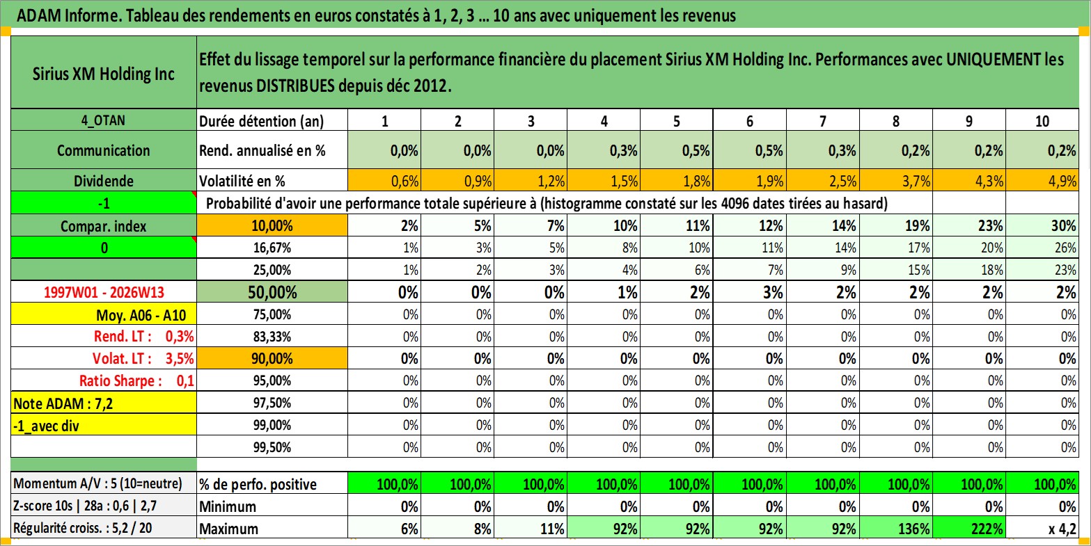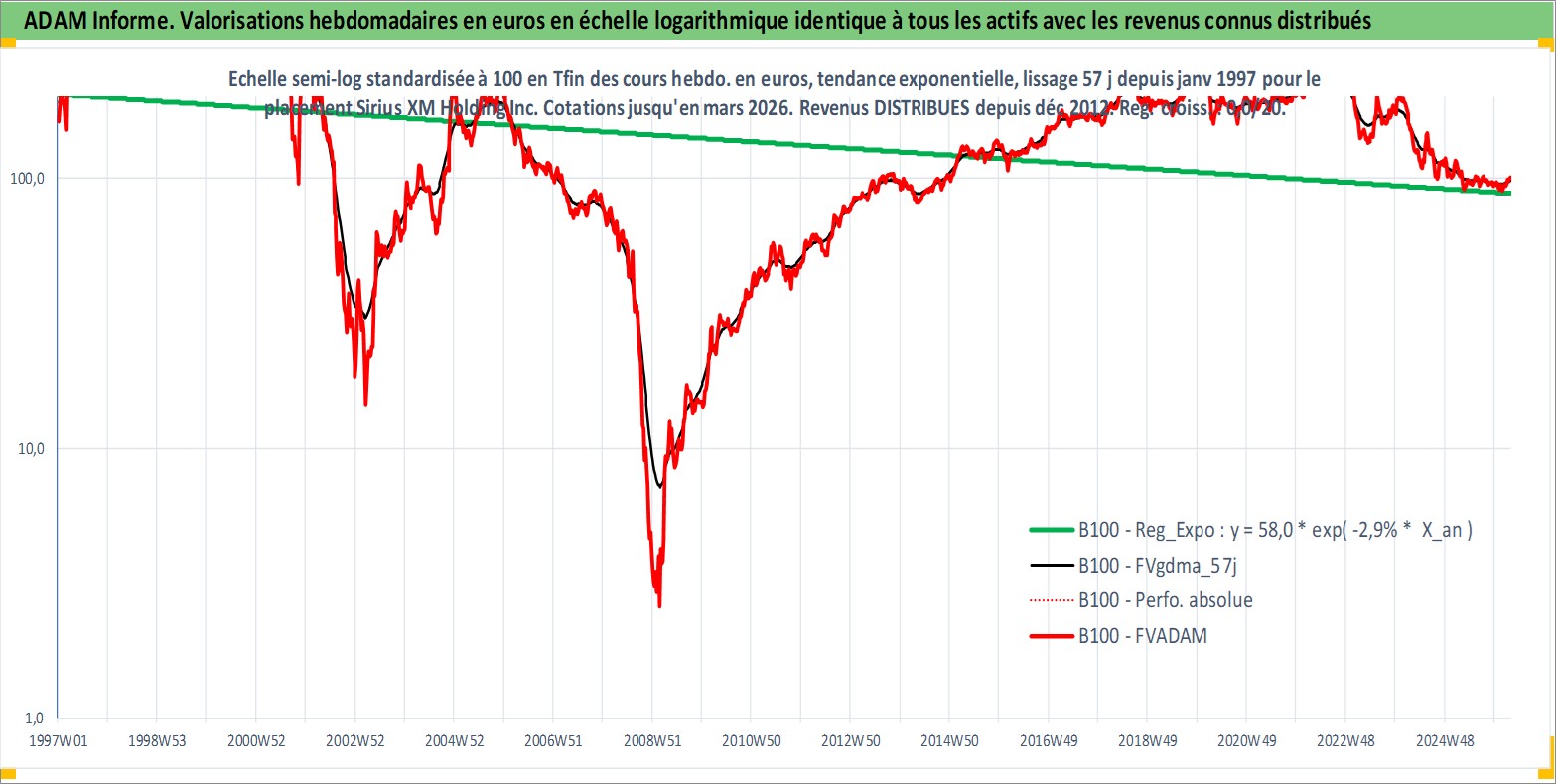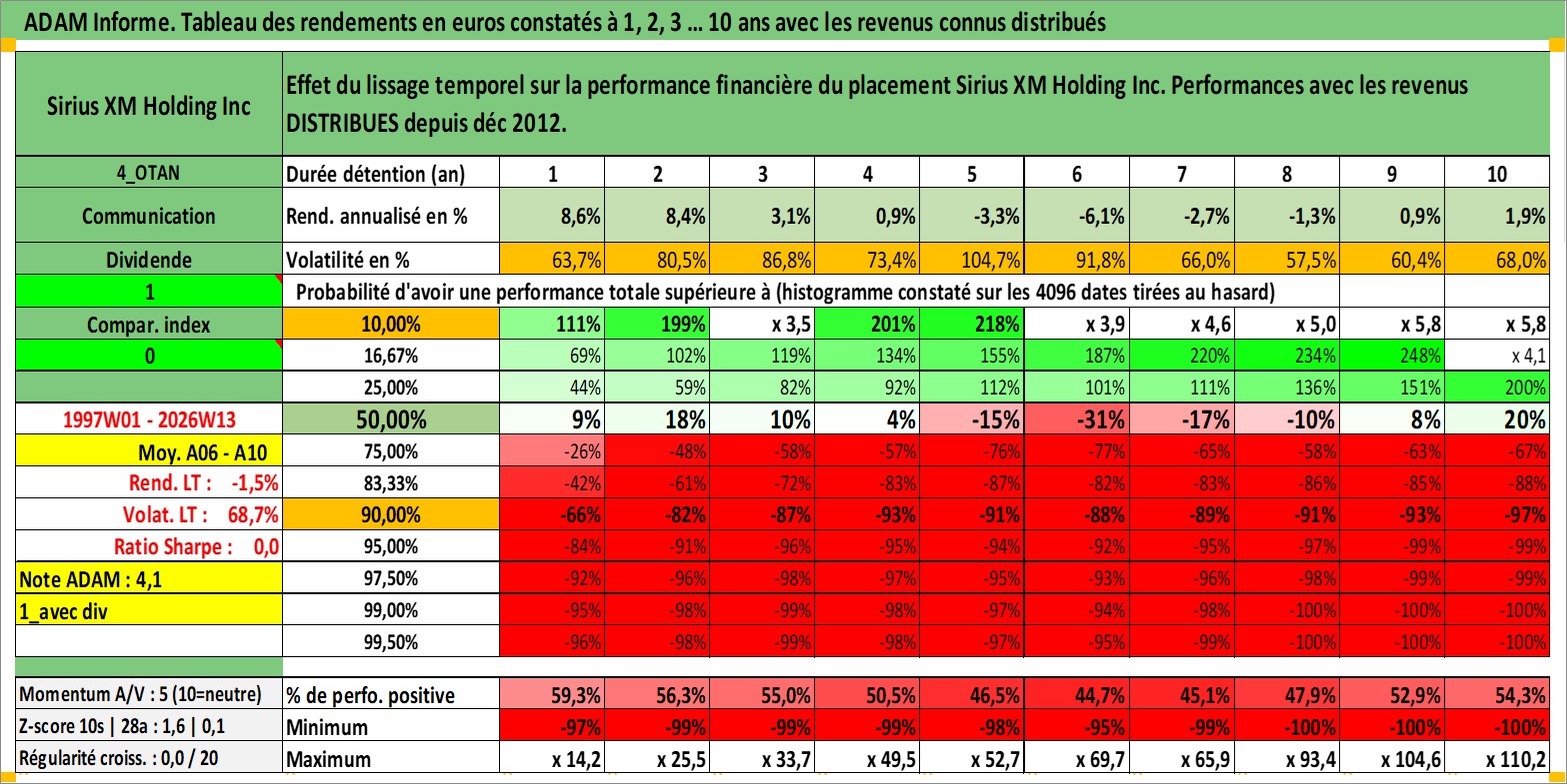 Site dédié aux investisseursPage dédiée sur site financeAnalyse des valorisations hebdomadaires de l'action Sirius XM Holding Inc. Cet actif est cote en USD. Les valorisations sont en contrevaleur EURO et couvrent les semaines 1997W01 a 2026W13. Les revenus de cet actif financier sont pris en compte depuis la semaine 2012W50. La note globale ESG de cet actif est estimee a 12.0 (apres rebasage entre 0 et 20).