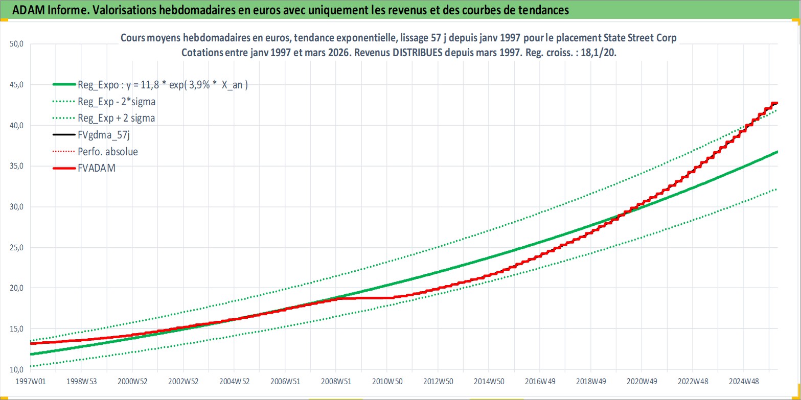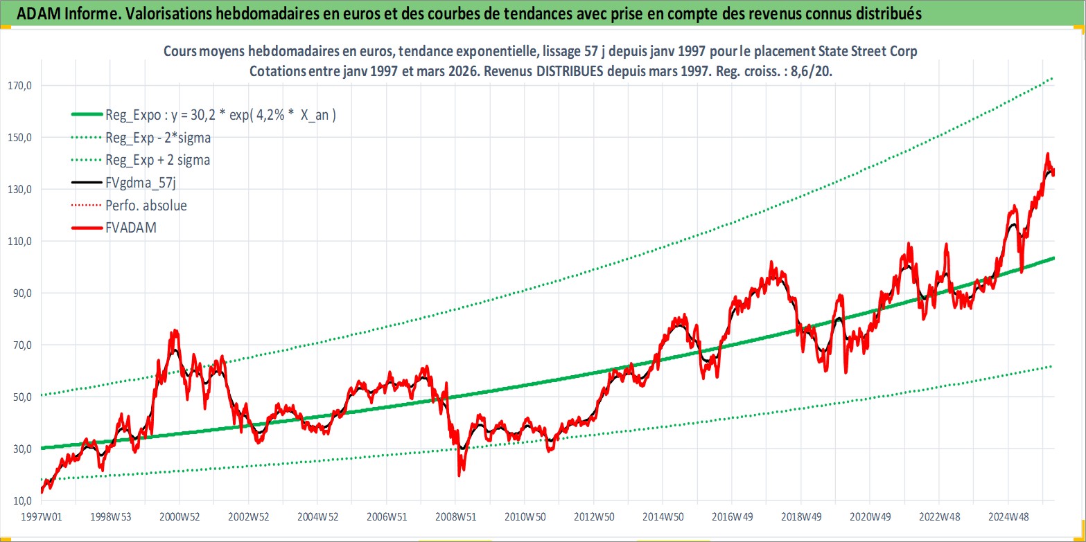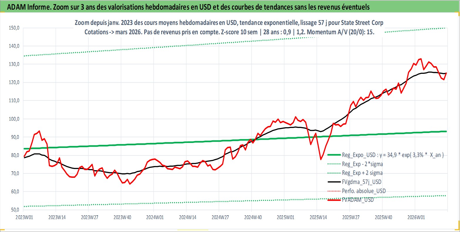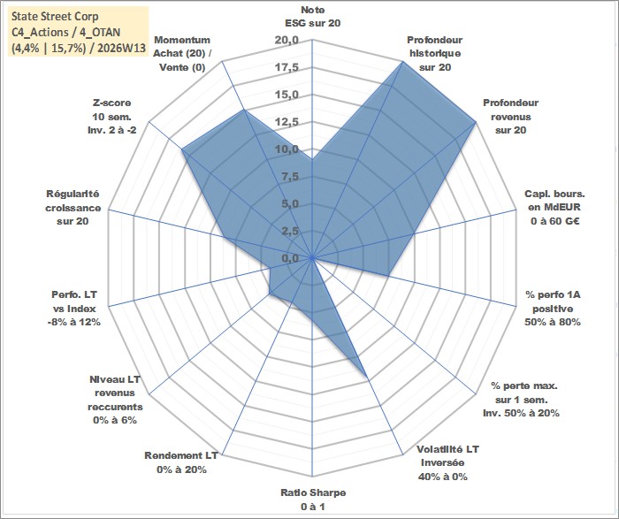 Site dédié aux investisseursPage dédiée sur site financeAnalyse des valorisations hebdomadaires de l'action State Street Corp. Cet actif est cote en USD. Les valorisations sont en contrevaleur EURO et couvrent les semaines 1997W01 a 2026W13. Les revenus de cet actif financier sont pris en compte depuis la semaine 1997W13. La note globale ESG de cet actif est estimee a 9.0 (apres rebasage entre 0 et 20).