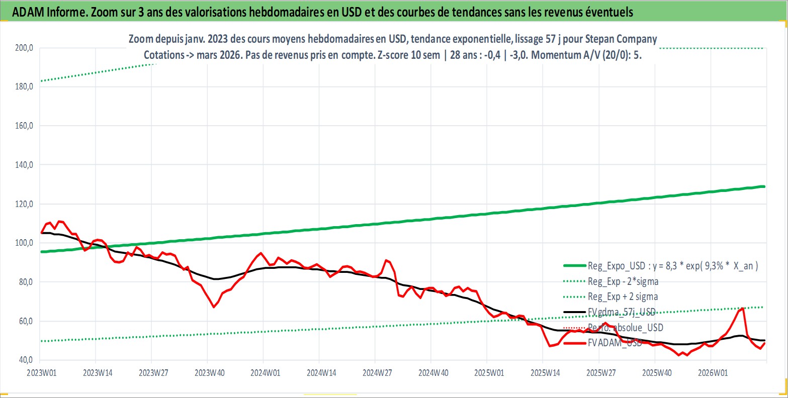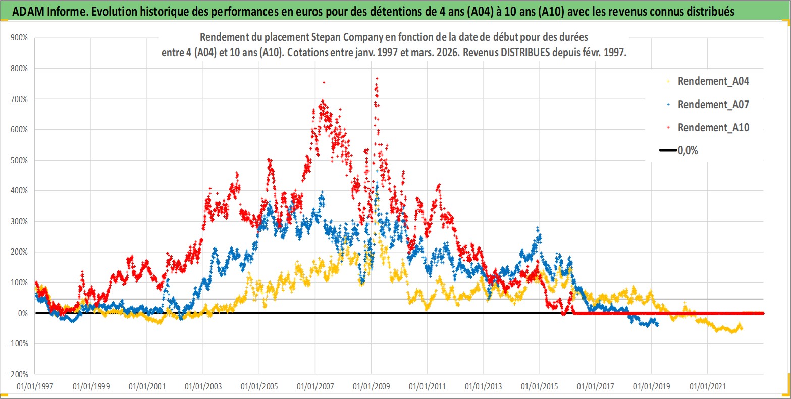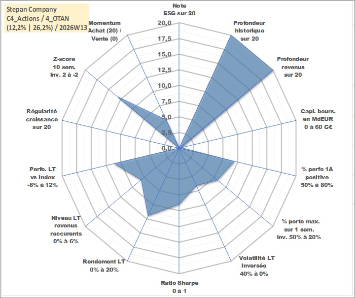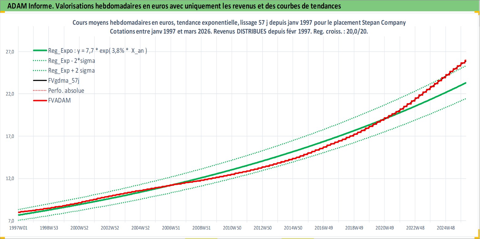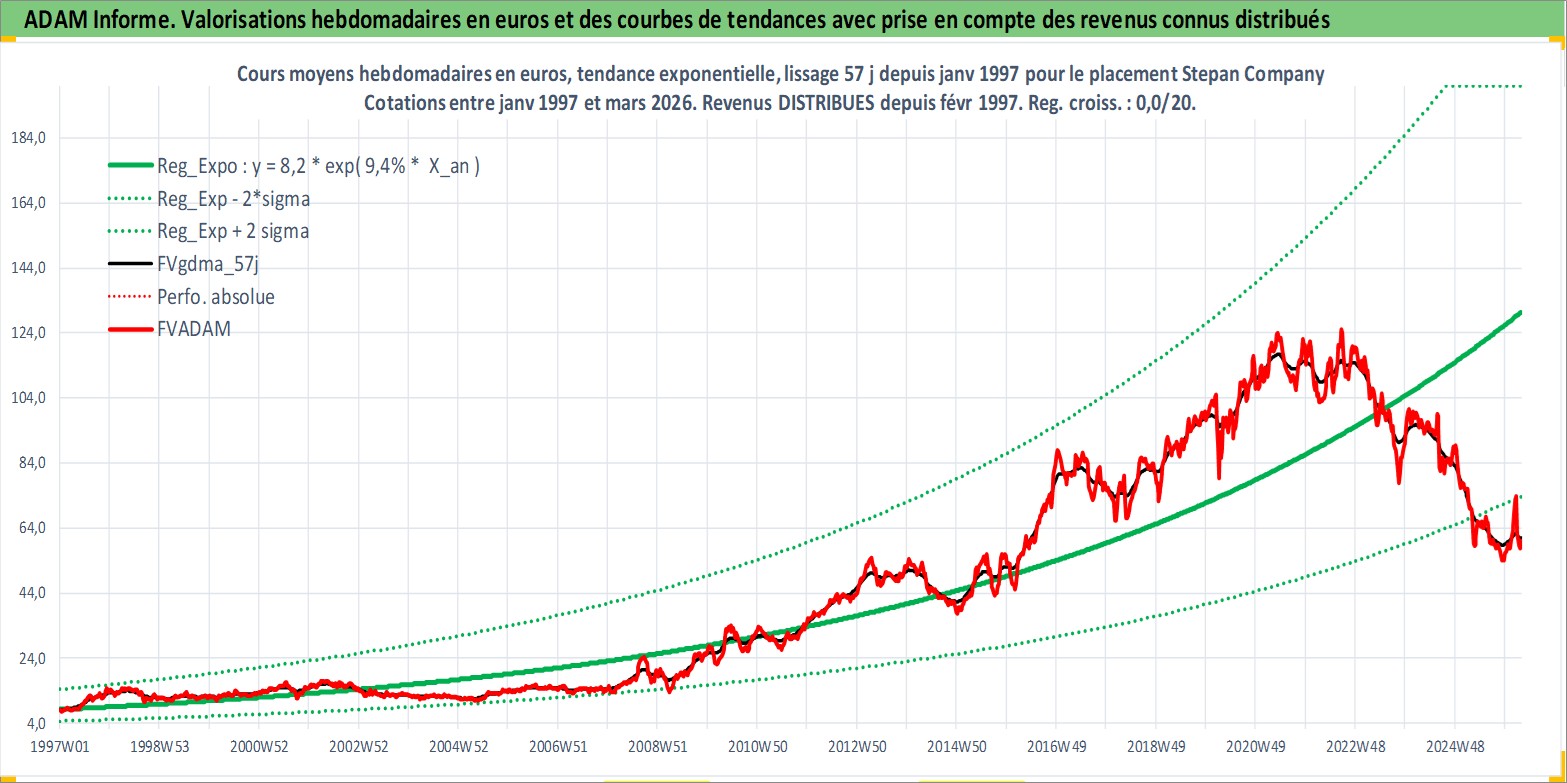 Site dédié aux investisseursPage dédiée sur site financeAnalyse des valorisations hebdomadaires de l'action Stepan Company. Cet actif est cote en USD. Les valorisations sont en contrevaleur EURO et couvrent les semaines 1997W01 a 2026W13. Les revenus de cet actif financier sont pris en compte depuis la semaine 1997W09. La note ESG de cet actif n'est pas connue.