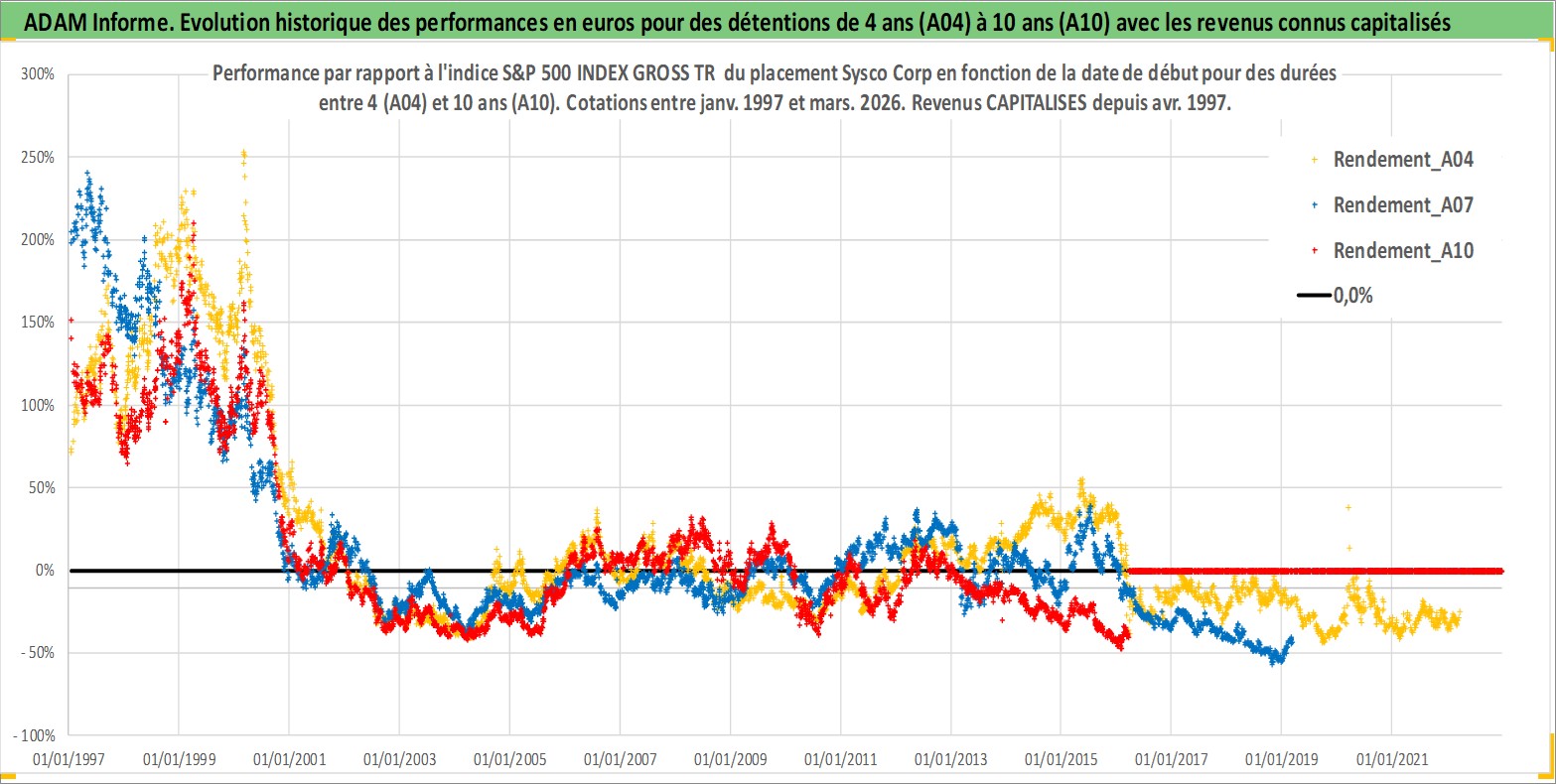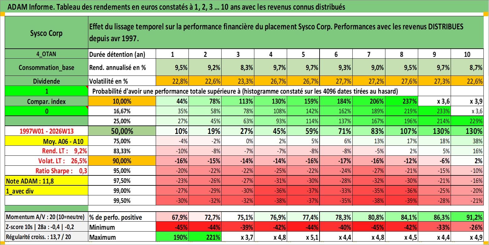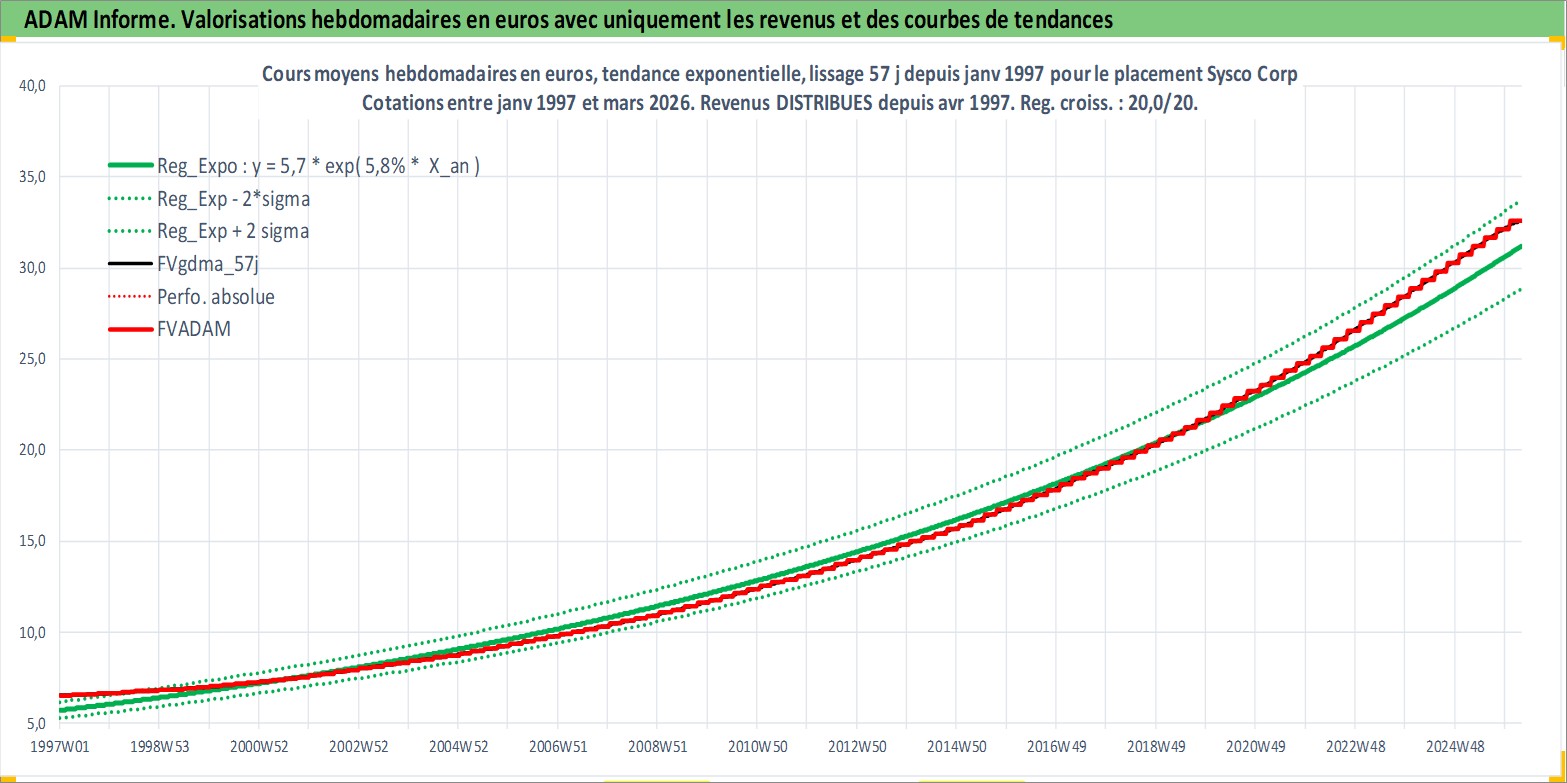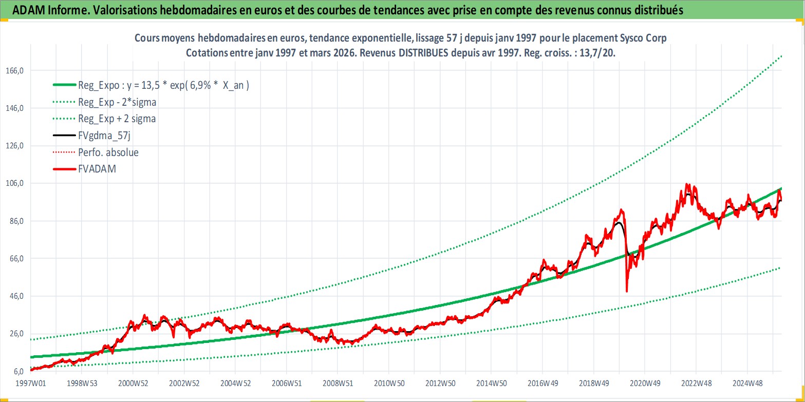 Site dédié aux investisseursPage dédiée sur site financeAnalyse des valorisations hebdomadaires de l'action Sysco Corp. Cet actif est cote en USD. Les valorisations sont en contrevaleur EURO et couvrent les semaines 1997W01 a 2026W13. Les revenus de cet actif financier sont pris en compte depuis la semaine 1997W14. La note globale ESG de cet actif est estimee a 15.0 (apres rebasage entre 0 et 20).