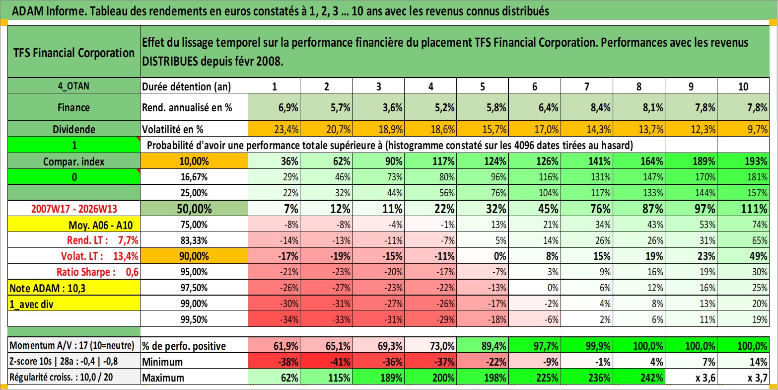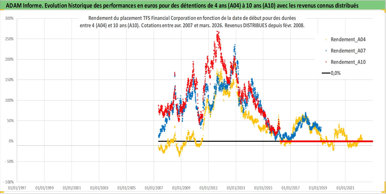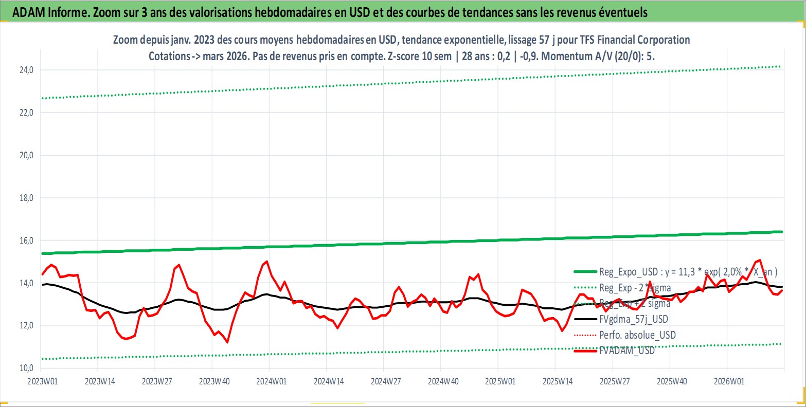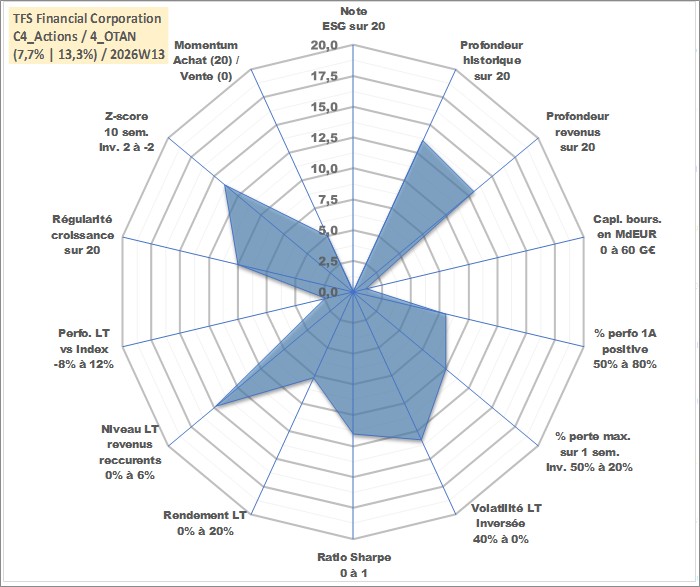 Site dédié aux investisseursPage dédiée sur site financeAnalyse des valorisations hebdomadaires de l'action TFS Financial Corporation. Cet actif est cote en USD. Les valorisations sont en contrevaleur EURO et couvrent les semaines 2007W17 a 2026W13. Les revenus de cet actif financier sont pris en compte depuis la semaine 2008W08. La note ESG de cet actif n'est pas connue.