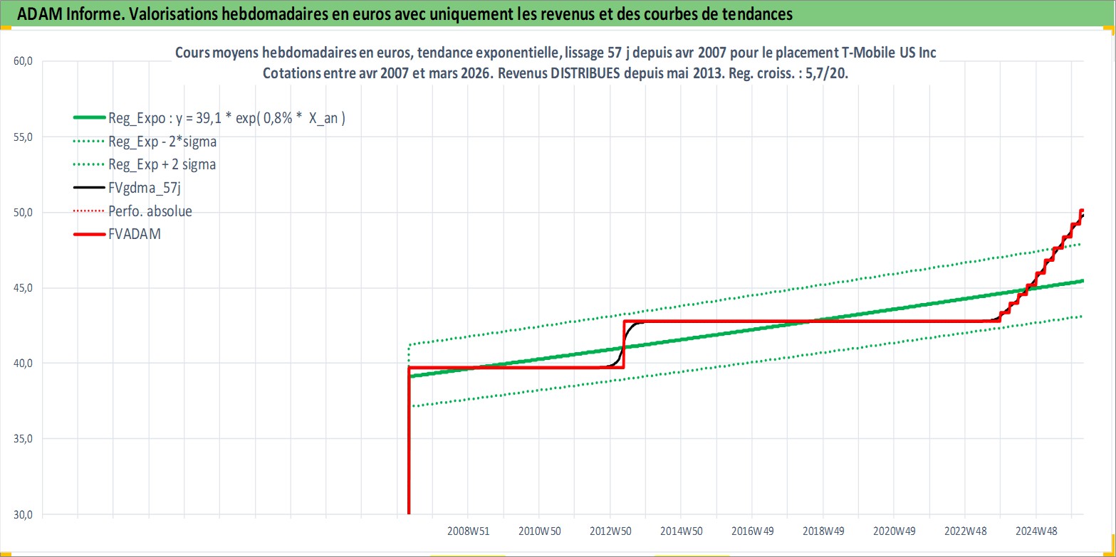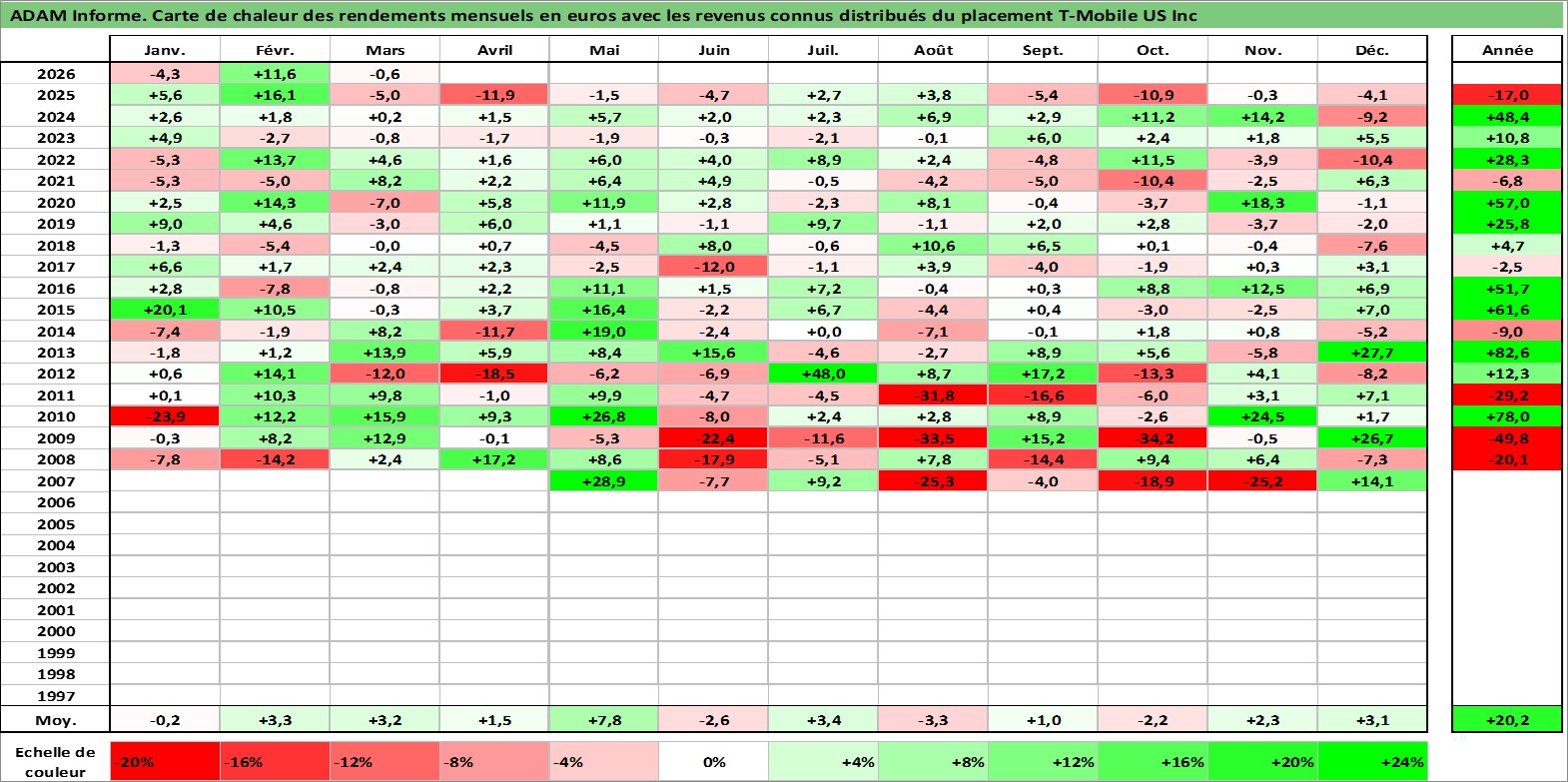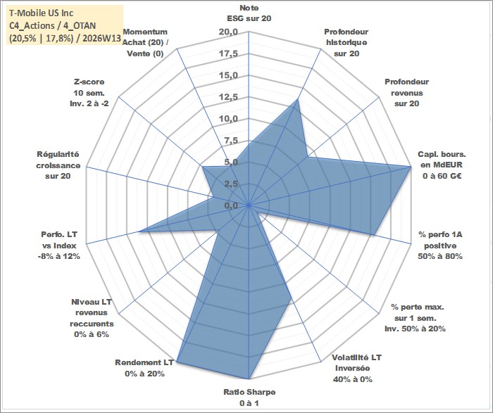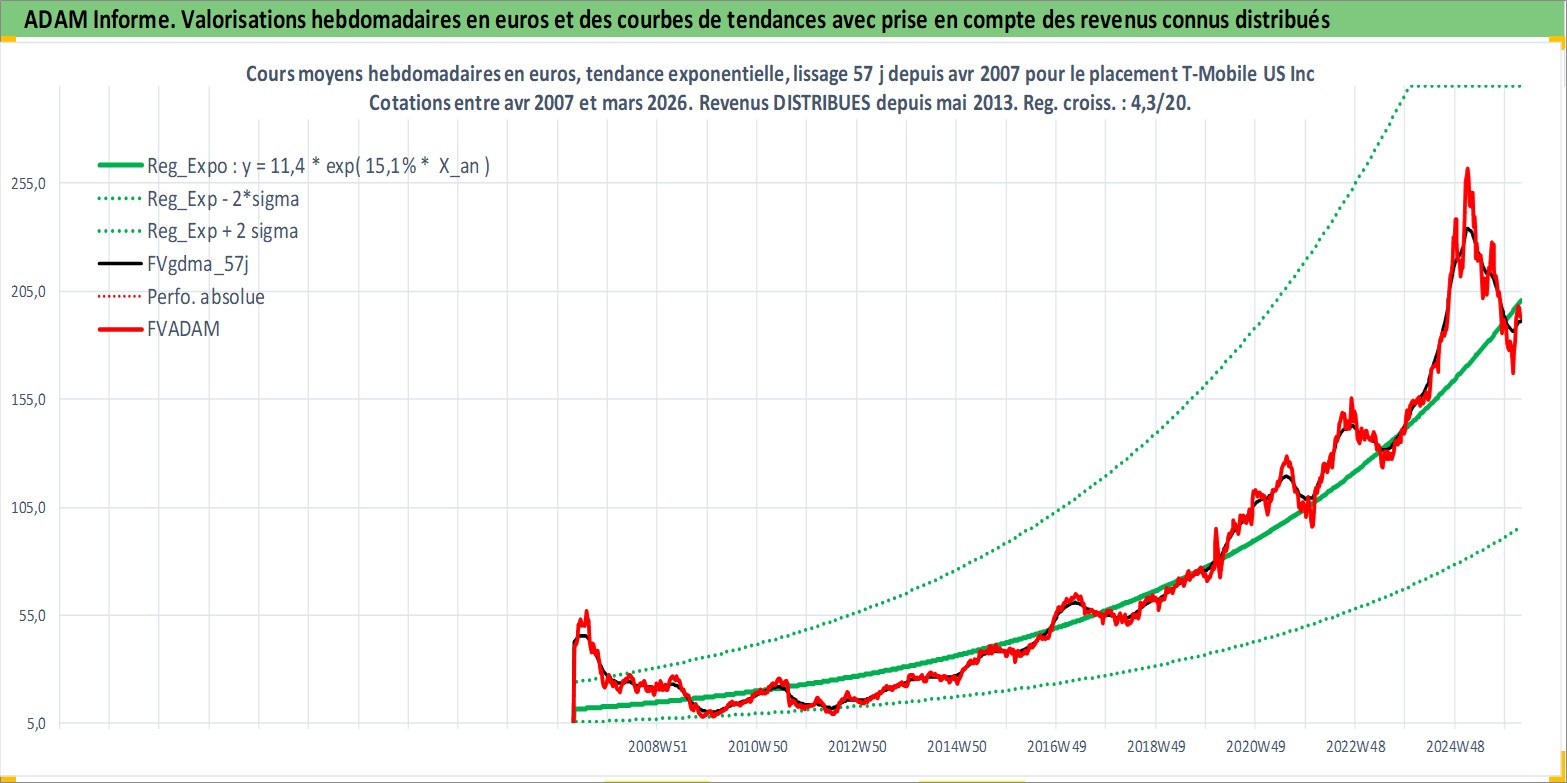 Site dédié aux investisseursPage dédiée sur site financeAnalyse des valorisations hebdomadaires de l'action T-Mobile US Inc. Cet actif est cote en USD. Les valorisations sont en contrevaleur EURO et couvrent les semaines 2007W16 a 2026W13. Les revenus de cet actif financier sont pris en compte depuis la semaine 2013W18. La note globale ESG de cet actif est estimee a 7.0 (apres rebasage entre 0 et 20).