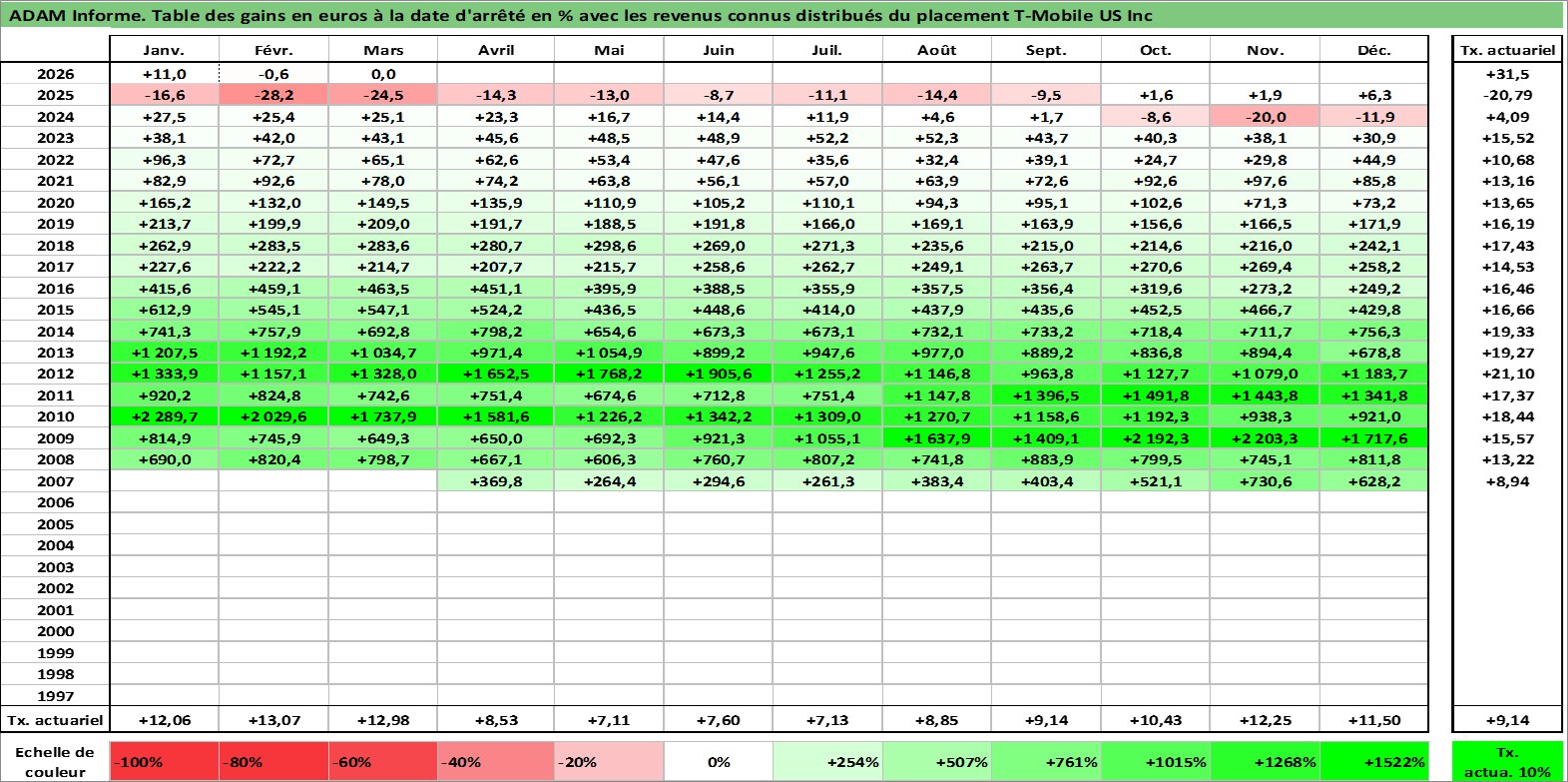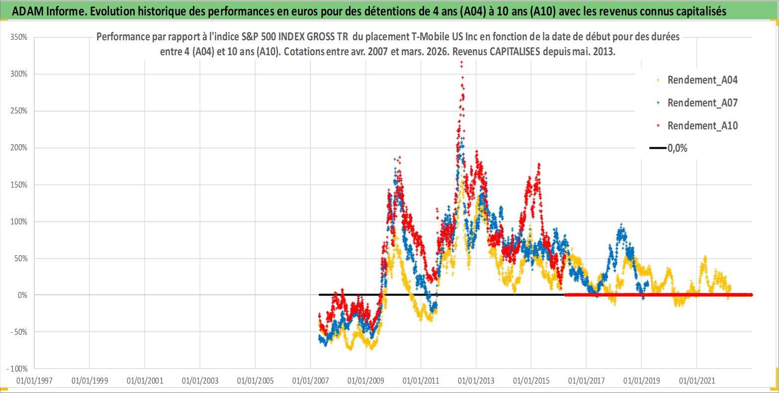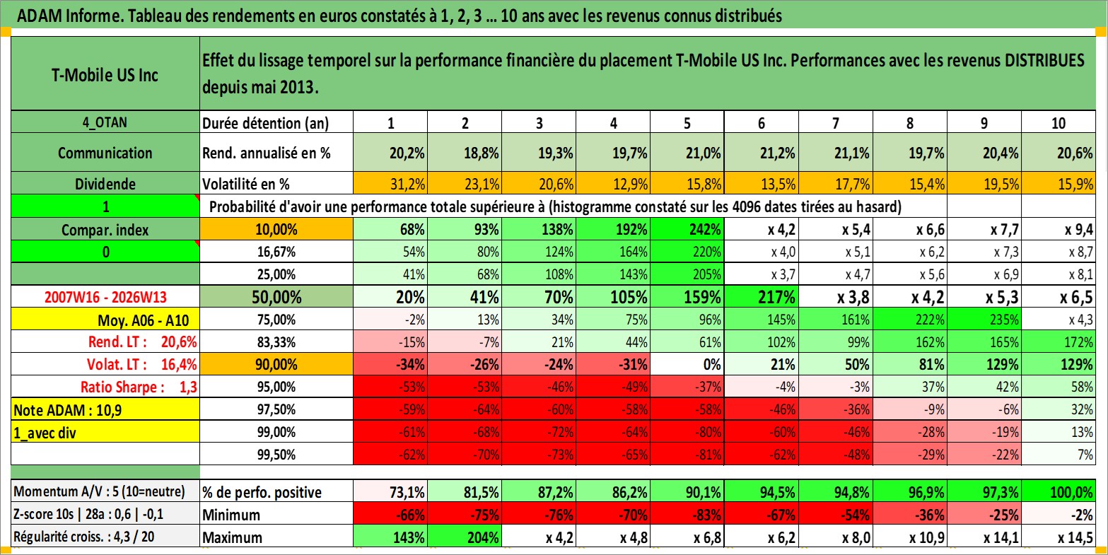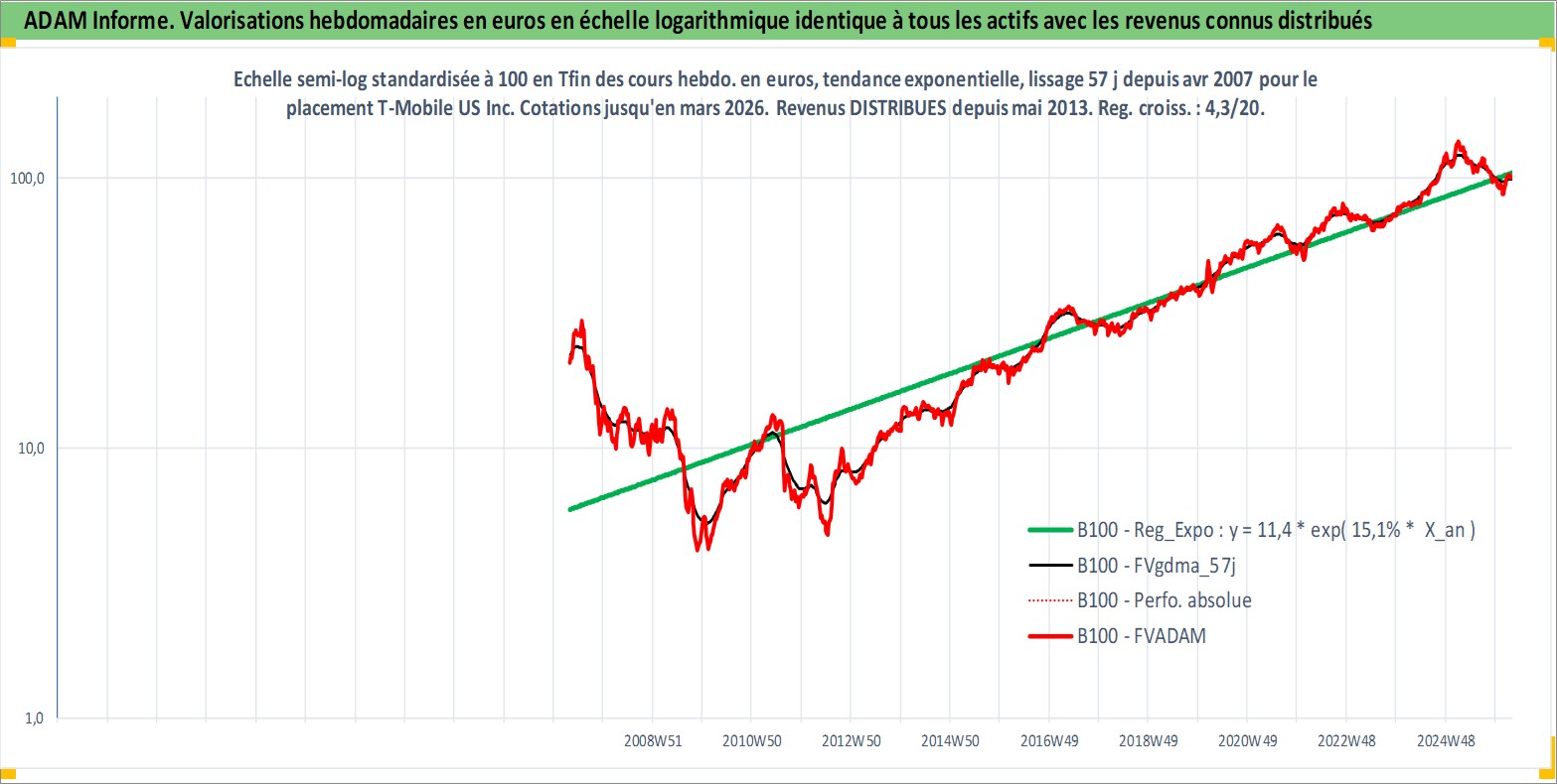 Site dédié aux investisseursPage dédiée sur site financeAnalyse des valorisations hebdomadaires de l'action T-Mobile US Inc. Cet actif est cote en USD. Les valorisations sont en contrevaleur EURO et couvrent les semaines 2007W16 a 2026W13. Les revenus de cet actif financier sont pris en compte depuis la semaine 2013W18. La note globale ESG de cet actif est estimee a 7.0 (apres rebasage entre 0 et 20).