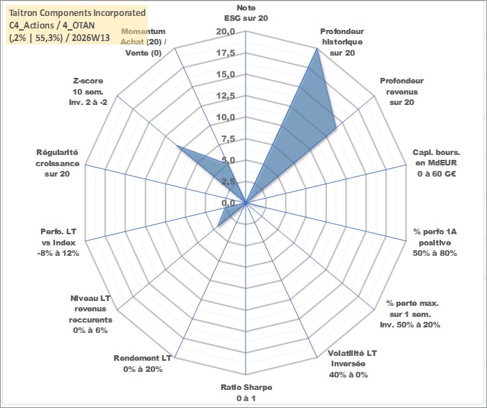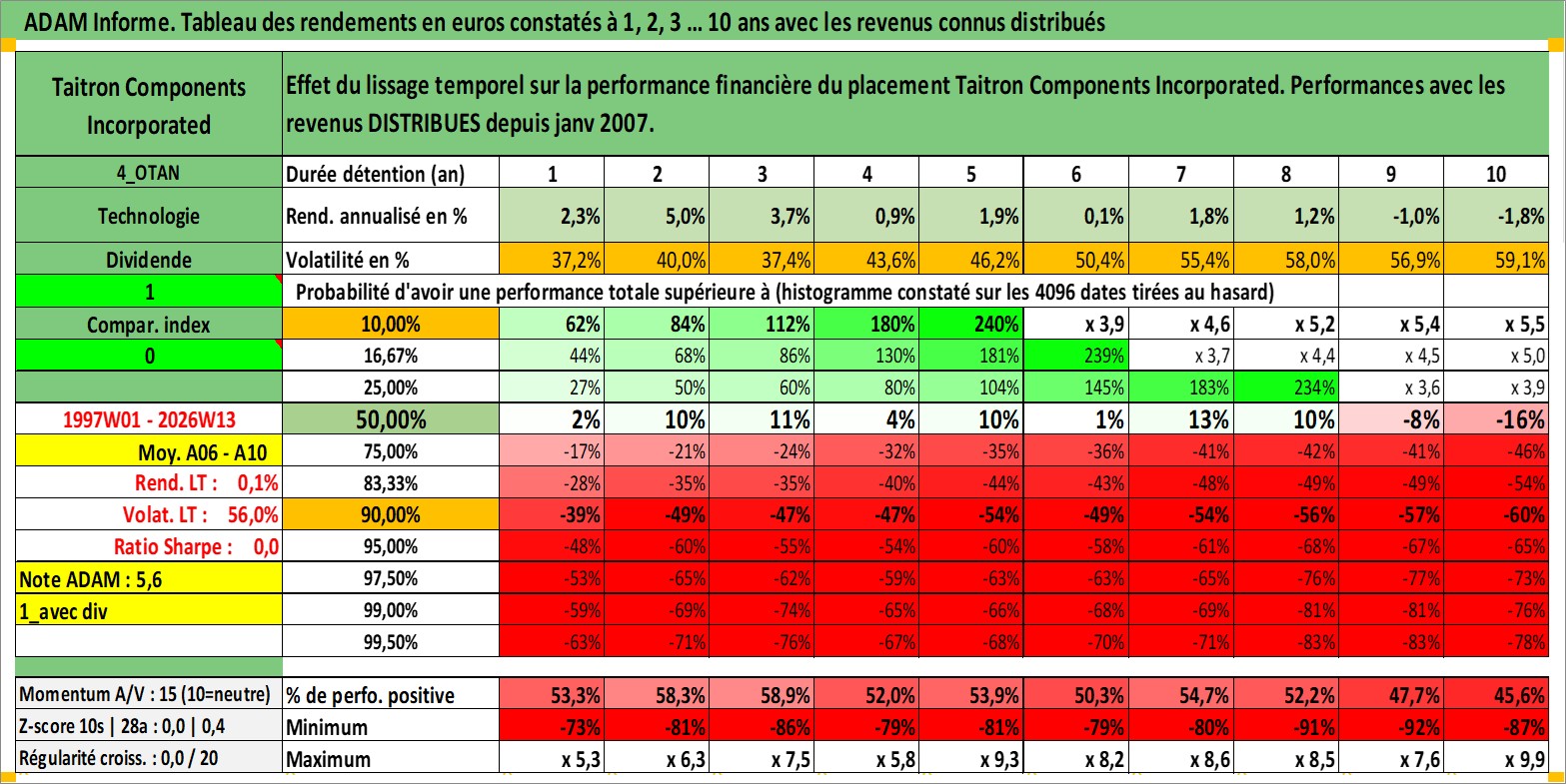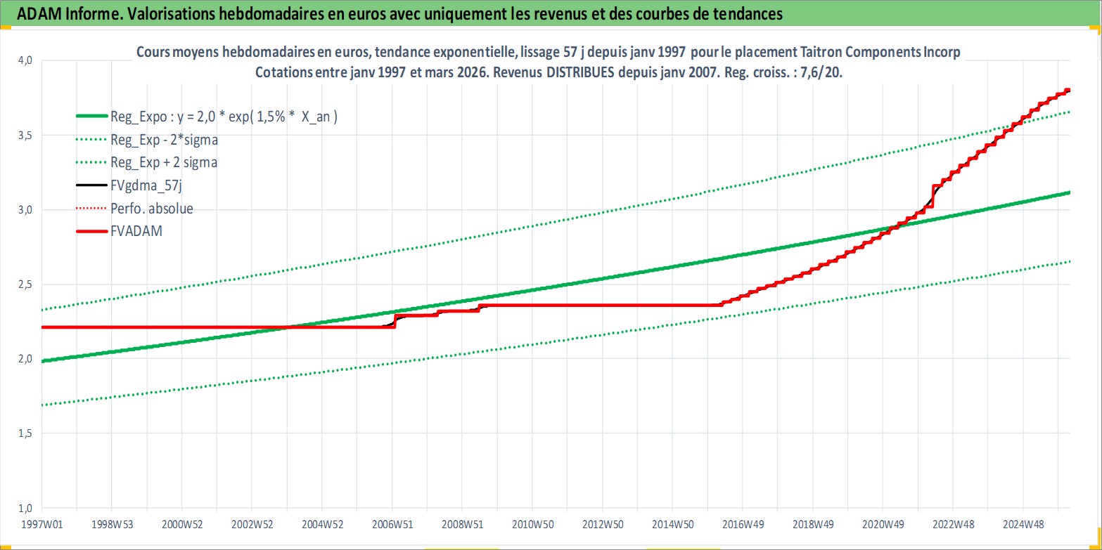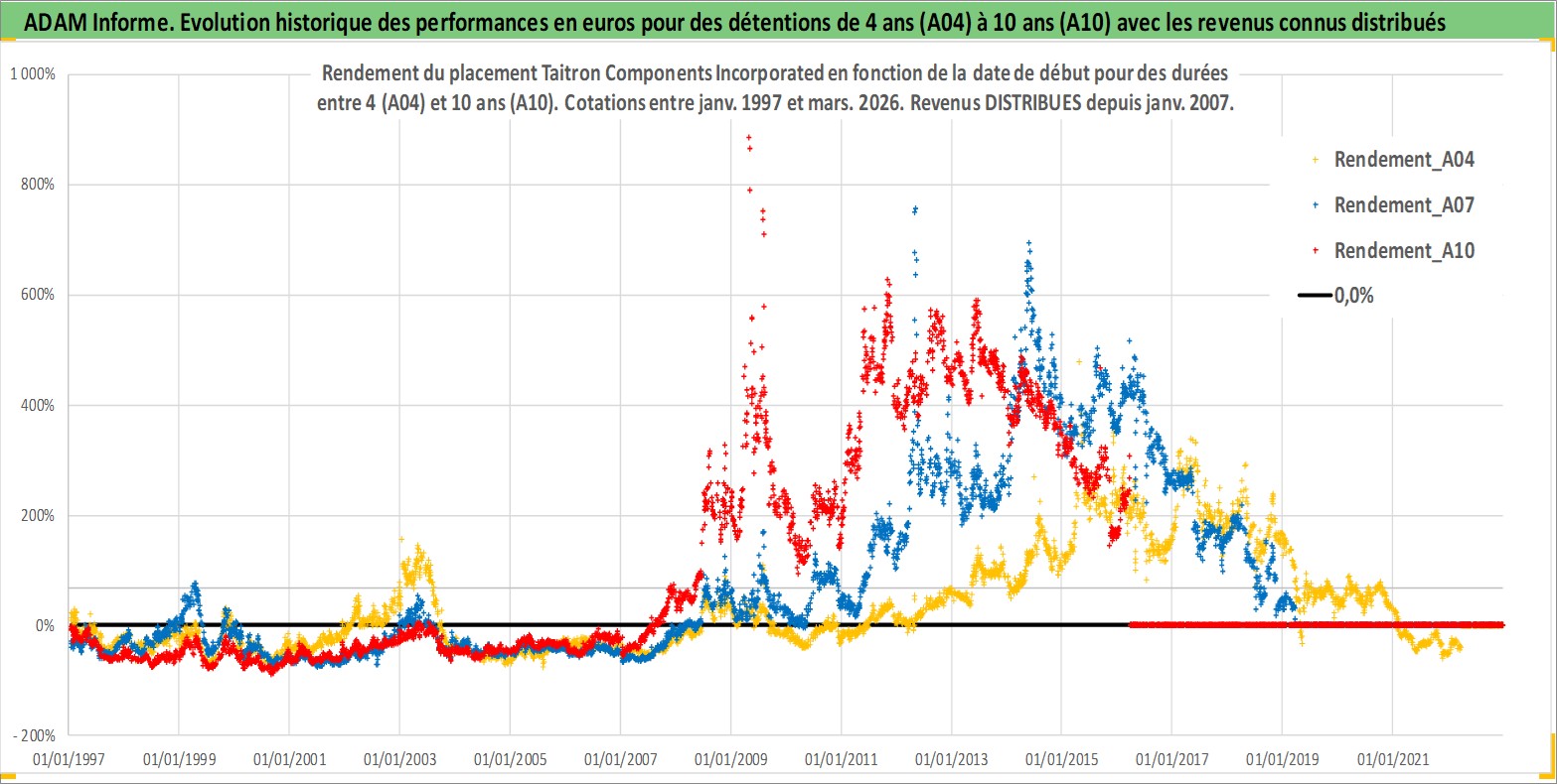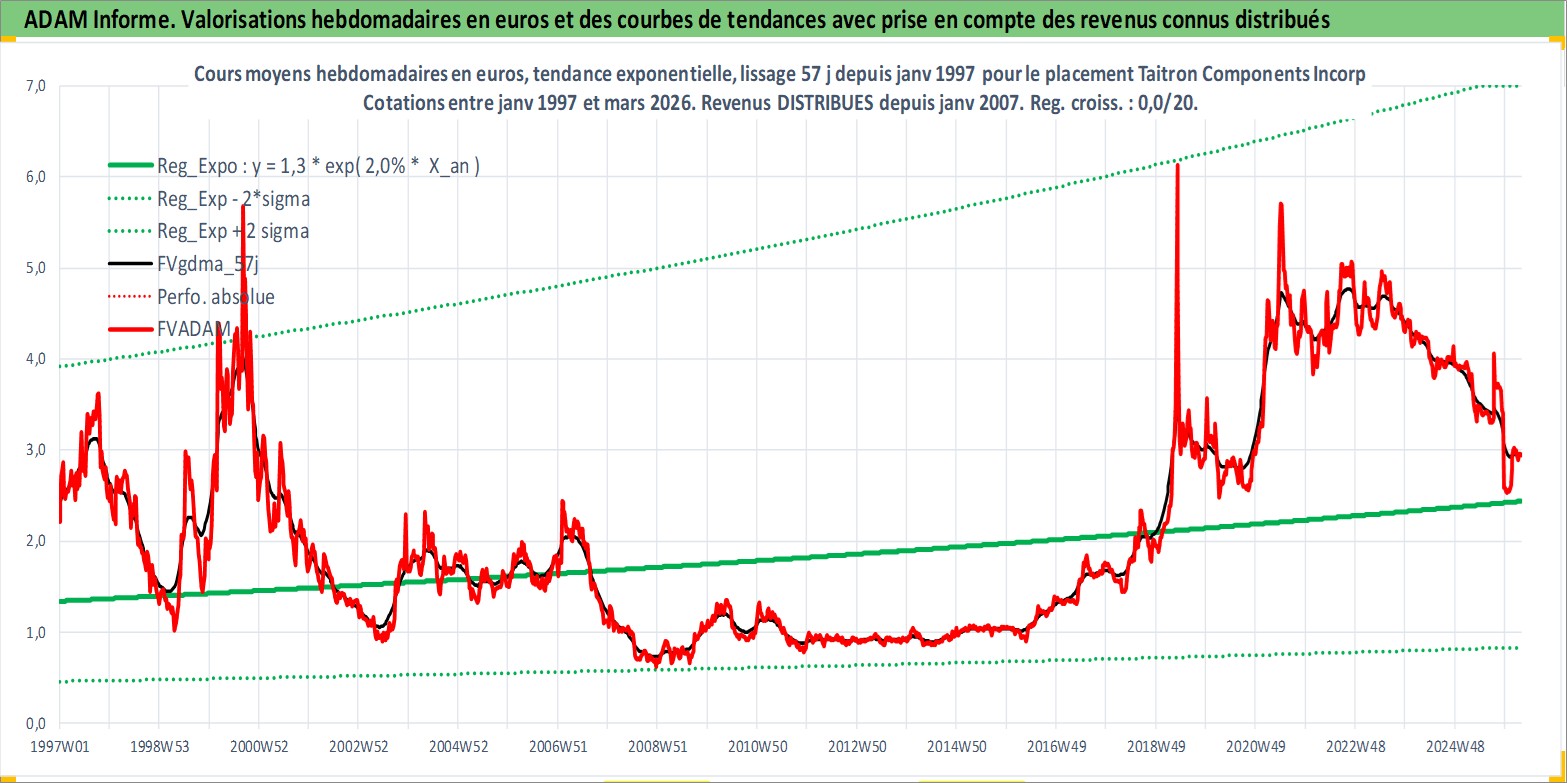 Site dédié aux investisseursPage dédiée sur site financeAnalyse des valorisations hebdomadaires de l'action Taitron Components Incorporated. Cet actif est cote en USD. Les valorisations sont en contrevaleur EURO et couvrent les semaines 1997W01 a 2026W13. Les revenus de cet actif financier sont pris en compte depuis la semaine 2007W03. La note ESG de cet actif n'est pas connue.