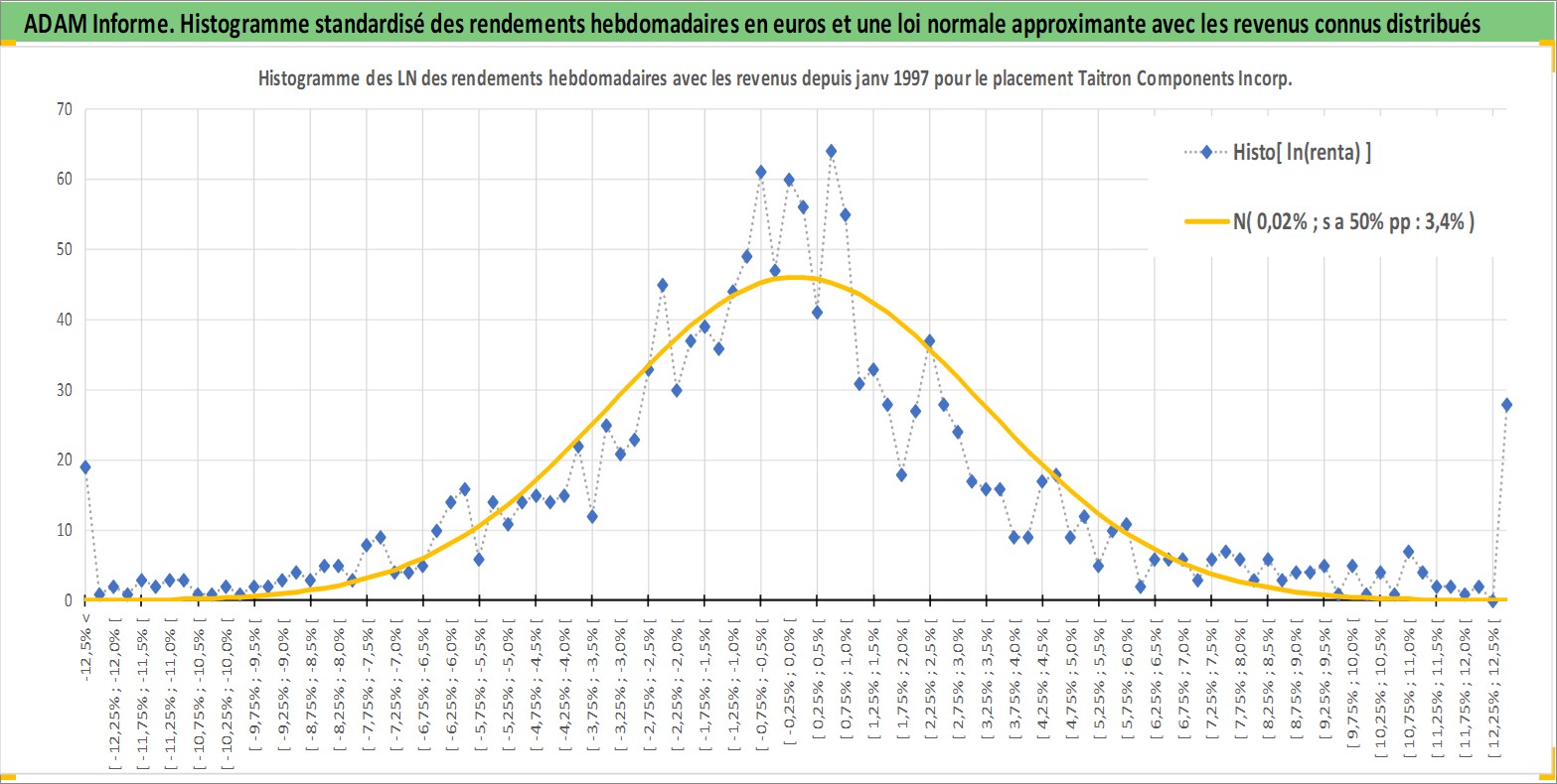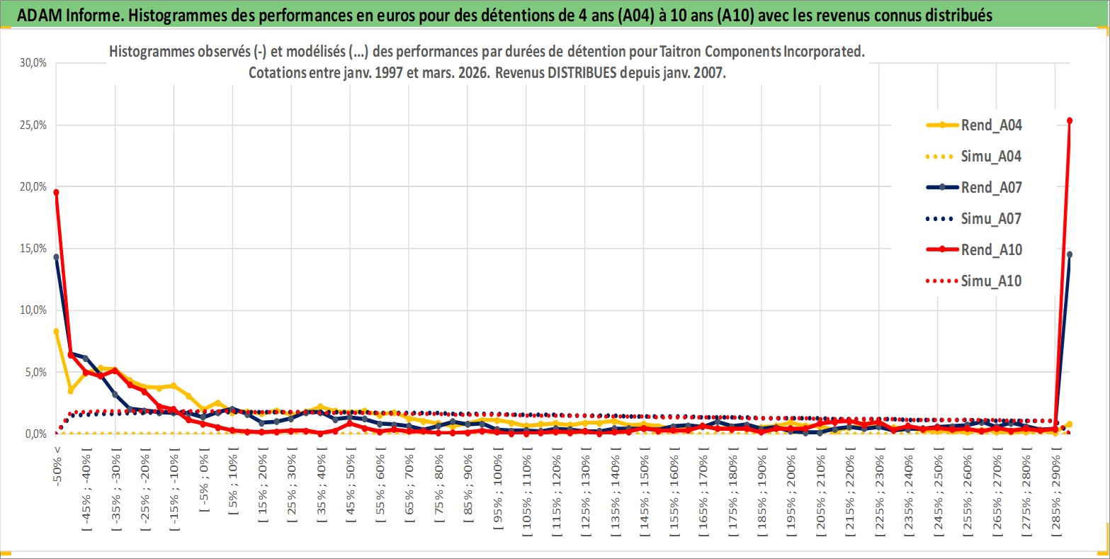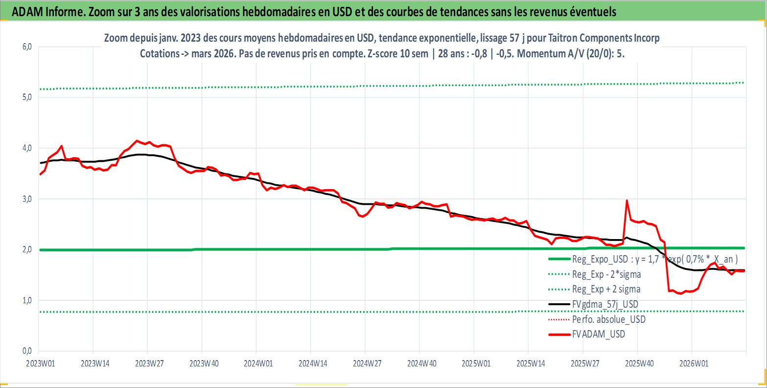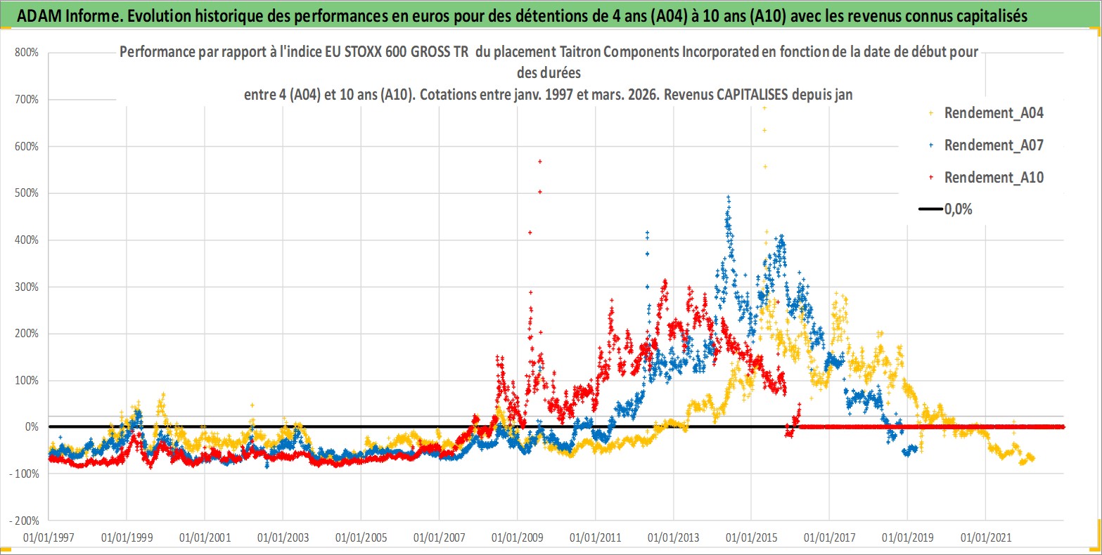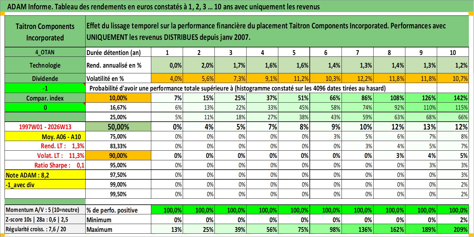 Site dédié aux investisseursPage dédiée sur site financeAnalyse des valorisations hebdomadaires de l'action Taitron Components Incorporated. Cet actif est cote en USD. Les valorisations sont en contrevaleur EURO et couvrent les semaines 1997W01 a 2026W13. Les revenus de cet actif financier sont pris en compte depuis la semaine 2007W03. La note ESG de cet actif n'est pas connue.