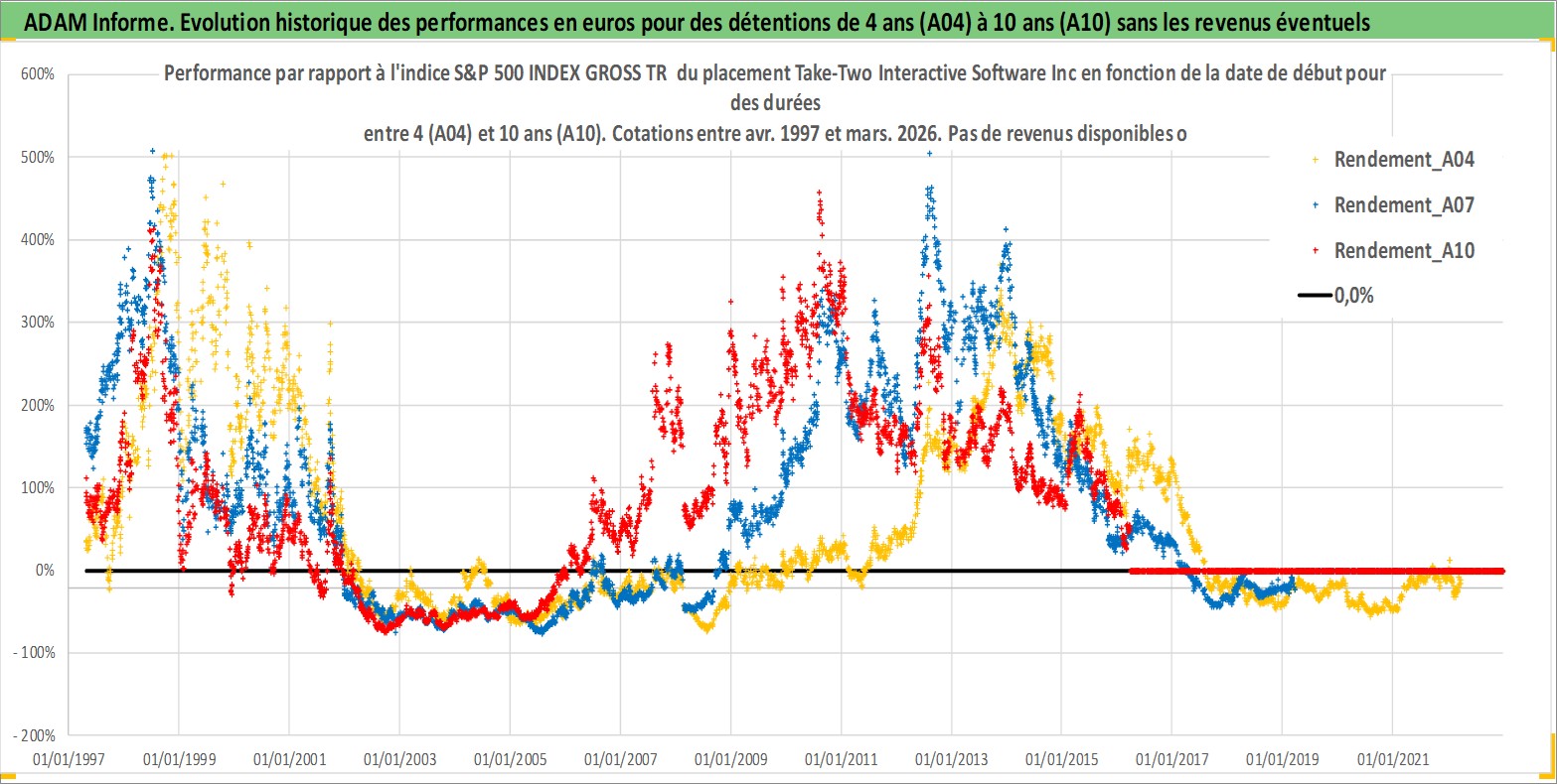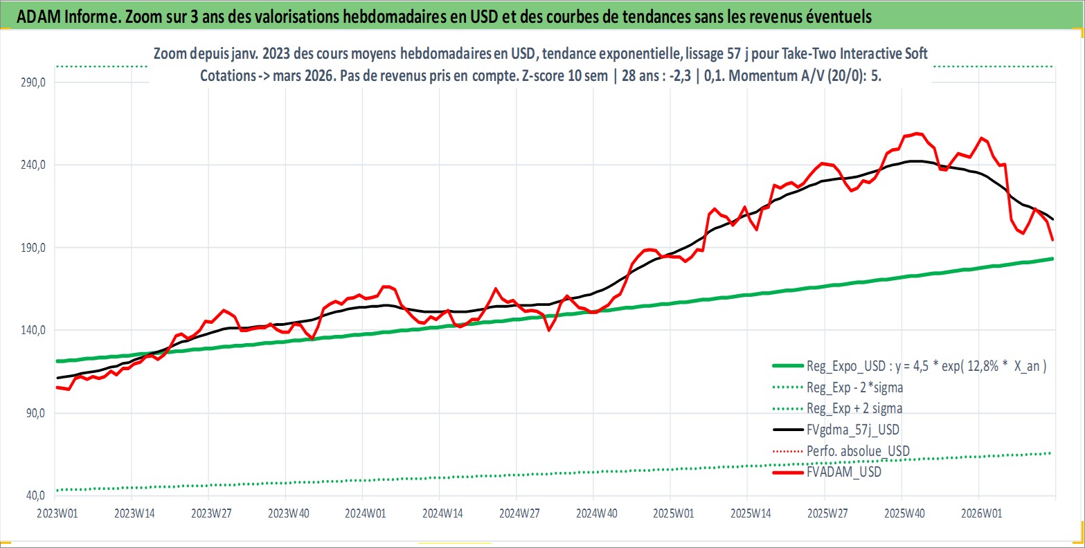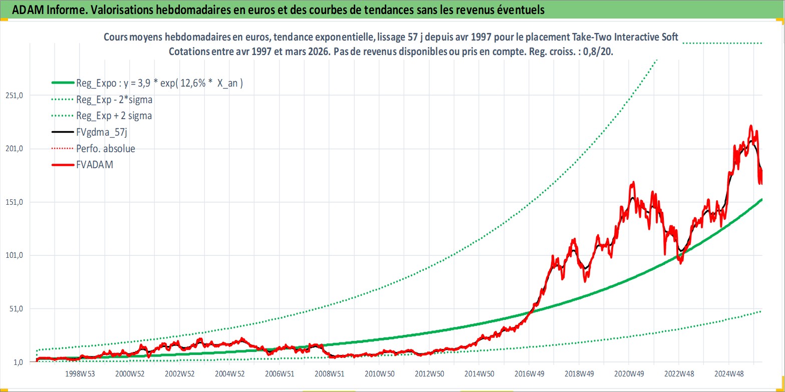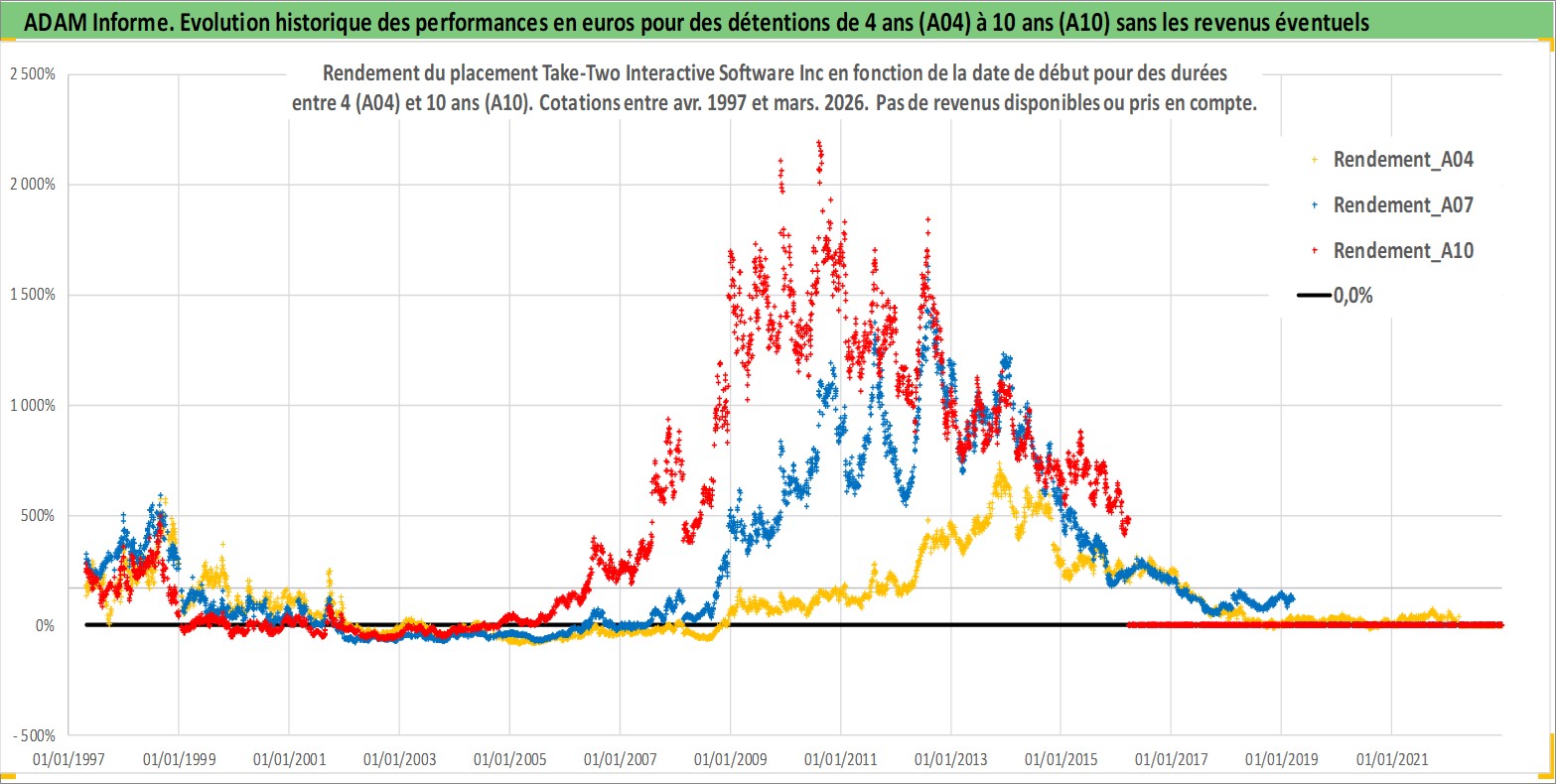 Site dédié aux investisseursPage dédiée sur site financeAnalyse des valorisations hebdomadaires de l'action Take-Two Interactive Software Inc. Cet actif est cote en USD. Les valorisations sont en contrevaleur EURO et couvrent les semaines 1997W16 a 2026W13. Les revenus de cet actif financier ne sont pas connus car non existants ou non disponibles sur le site Yahoo Finance. La note ESG de cet actif n'est pas connue.