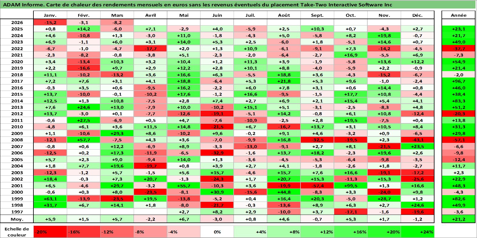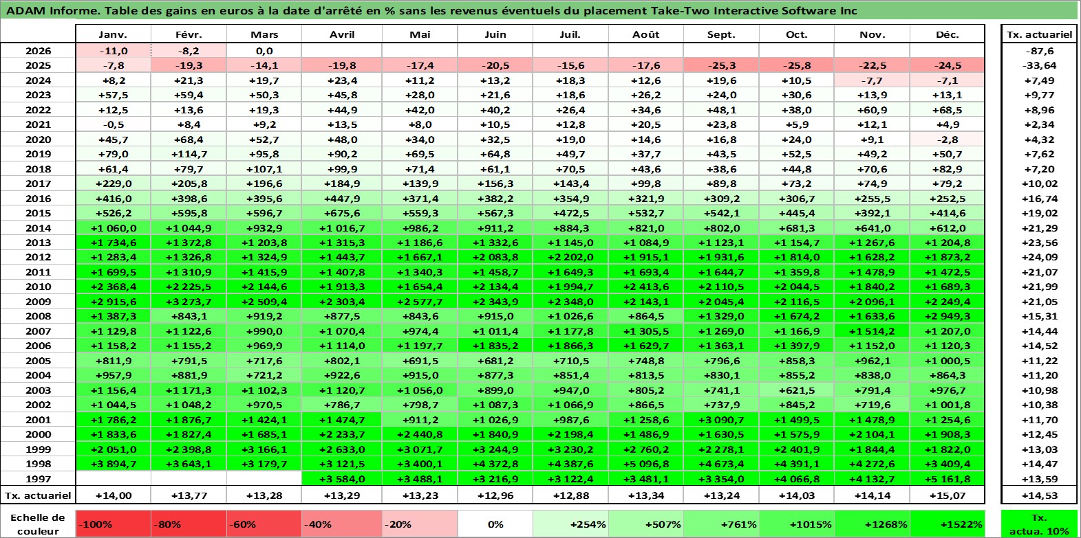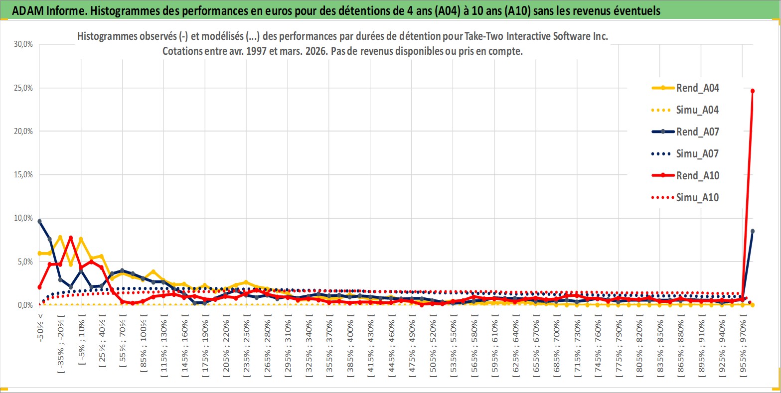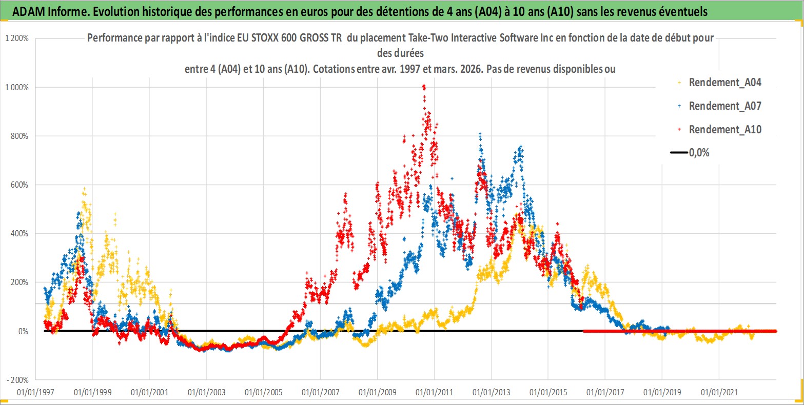 Site dédié aux investisseursPage dédiée sur site financeAnalyse des valorisations hebdomadaires de l'action Take-Two Interactive Software Inc. Cet actif est cote en USD. Les valorisations sont en contrevaleur EURO et couvrent les semaines 1997W16 a 2026W13. Les revenus de cet actif financier ne sont pas connus car non existants ou non disponibles sur le site Yahoo Finance. La note ESG de cet actif n'est pas connue.