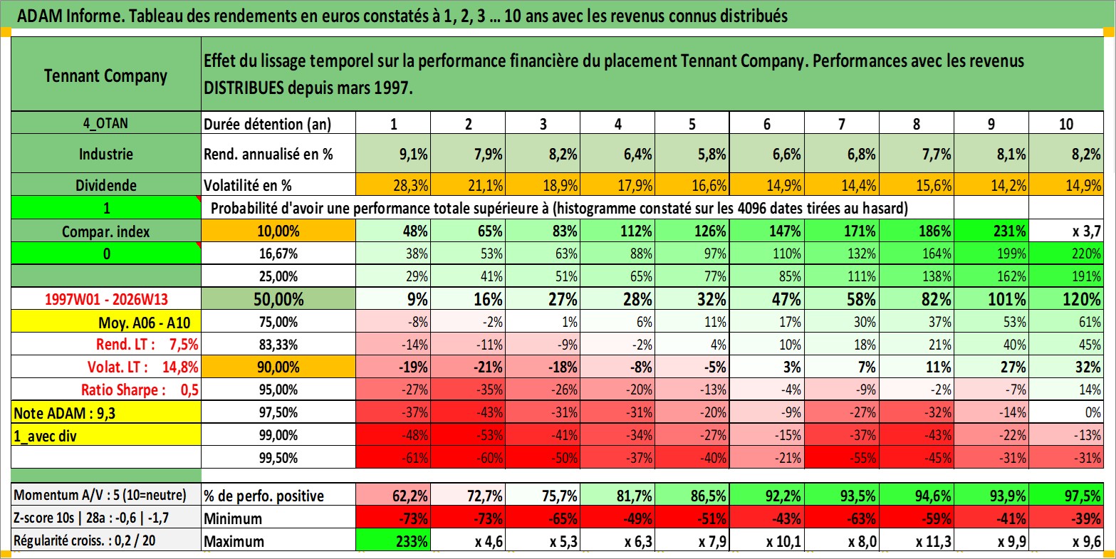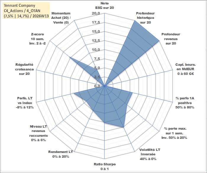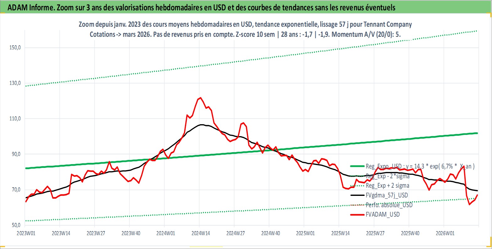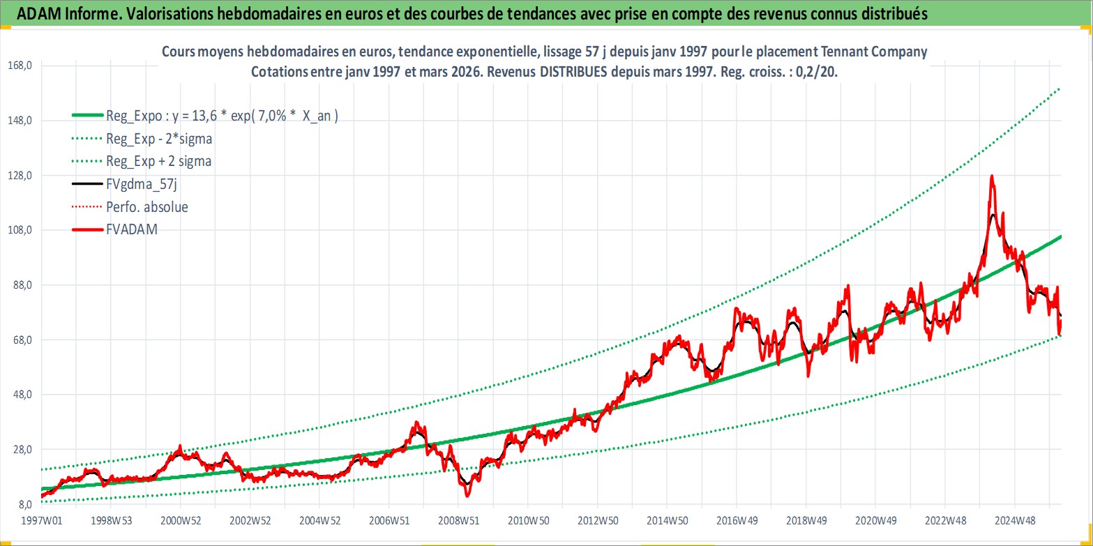 Site dédié aux investisseursPage dédiée sur site financeAnalyse des valorisations hebdomadaires de l'action Tennant Company. Cet actif est cote en USD. Les valorisations sont en contrevaleur EURO et couvrent les semaines 1997W01 a 2026W13. Les revenus de cet actif financier sont pris en compte depuis la semaine 1997W10. La note ESG de cet actif n'est pas connue.