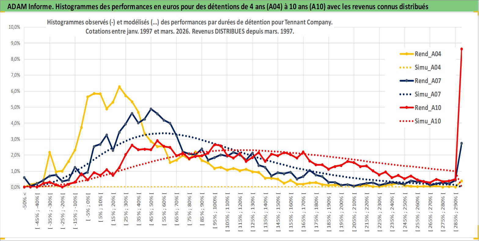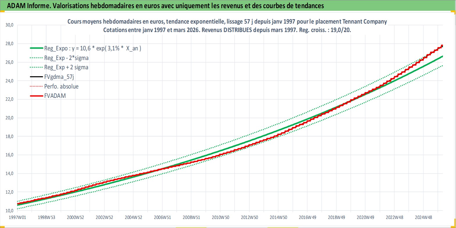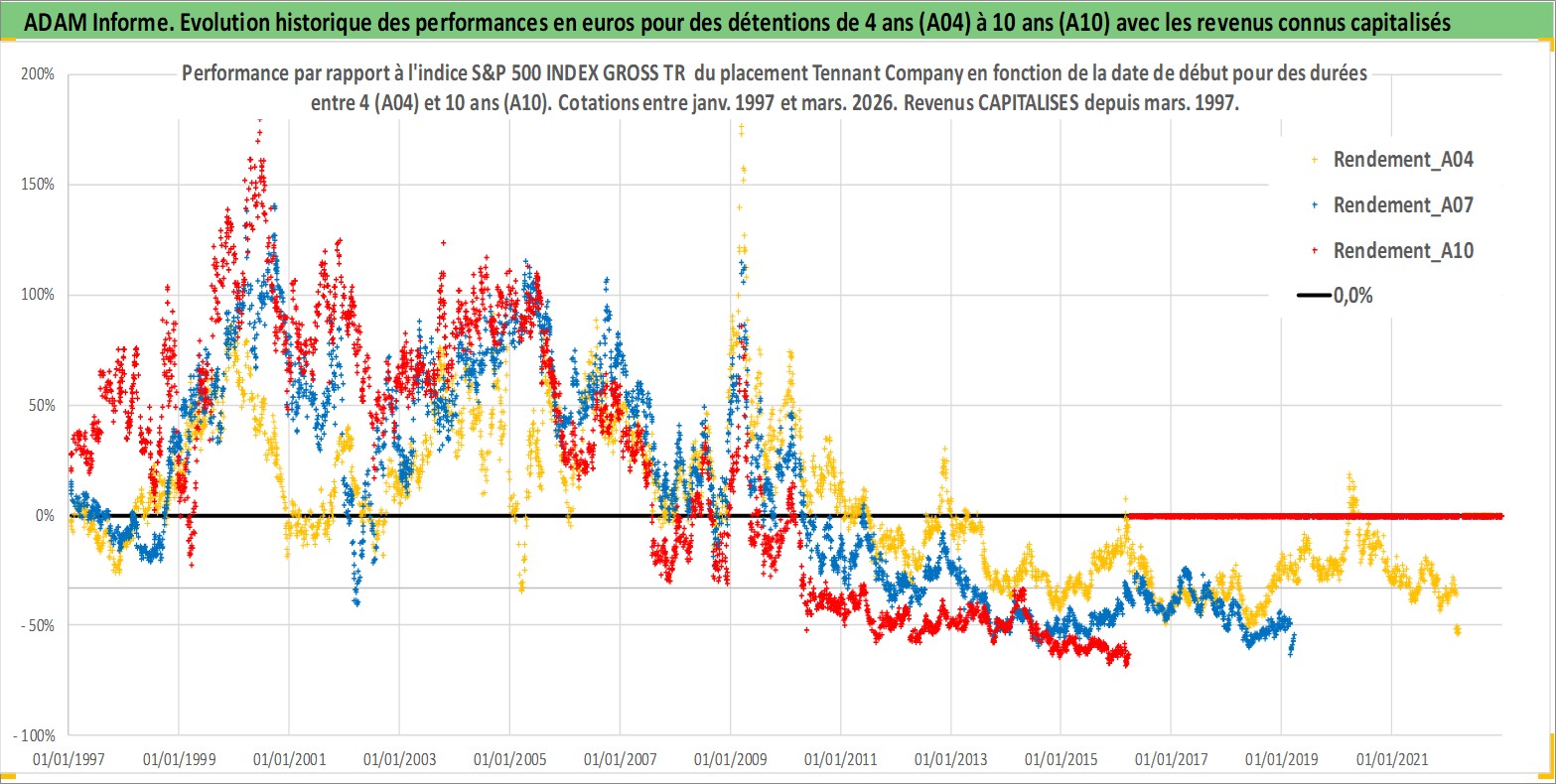 Site dédié aux investisseursPage dédiée sur site financeAnalyse des valorisations hebdomadaires de l'action Tennant Company. Cet actif est cote en USD. Les valorisations sont en contrevaleur EURO et couvrent les semaines 1997W01 a 2026W13. Les revenus de cet actif financier sont pris en compte depuis la semaine 1997W10. La note ESG de cet actif n'est pas connue.