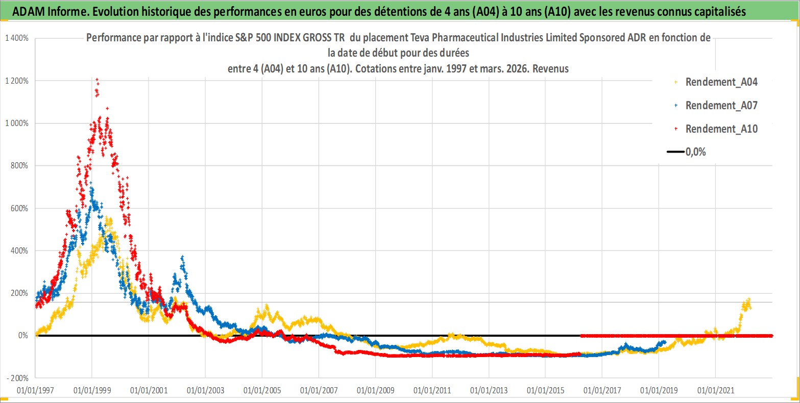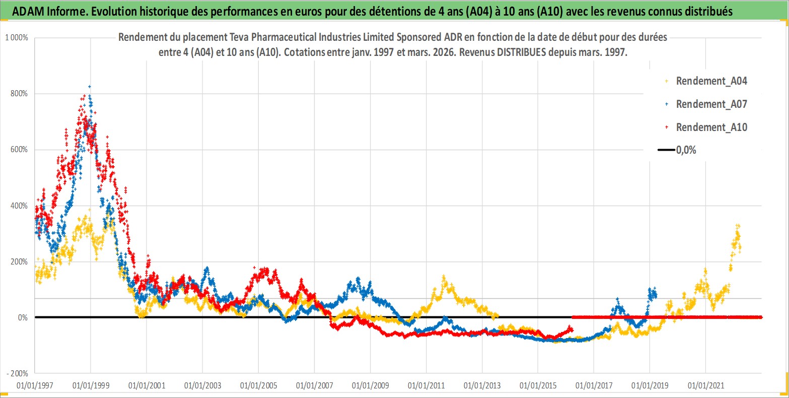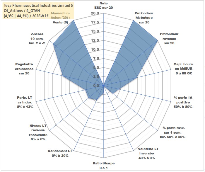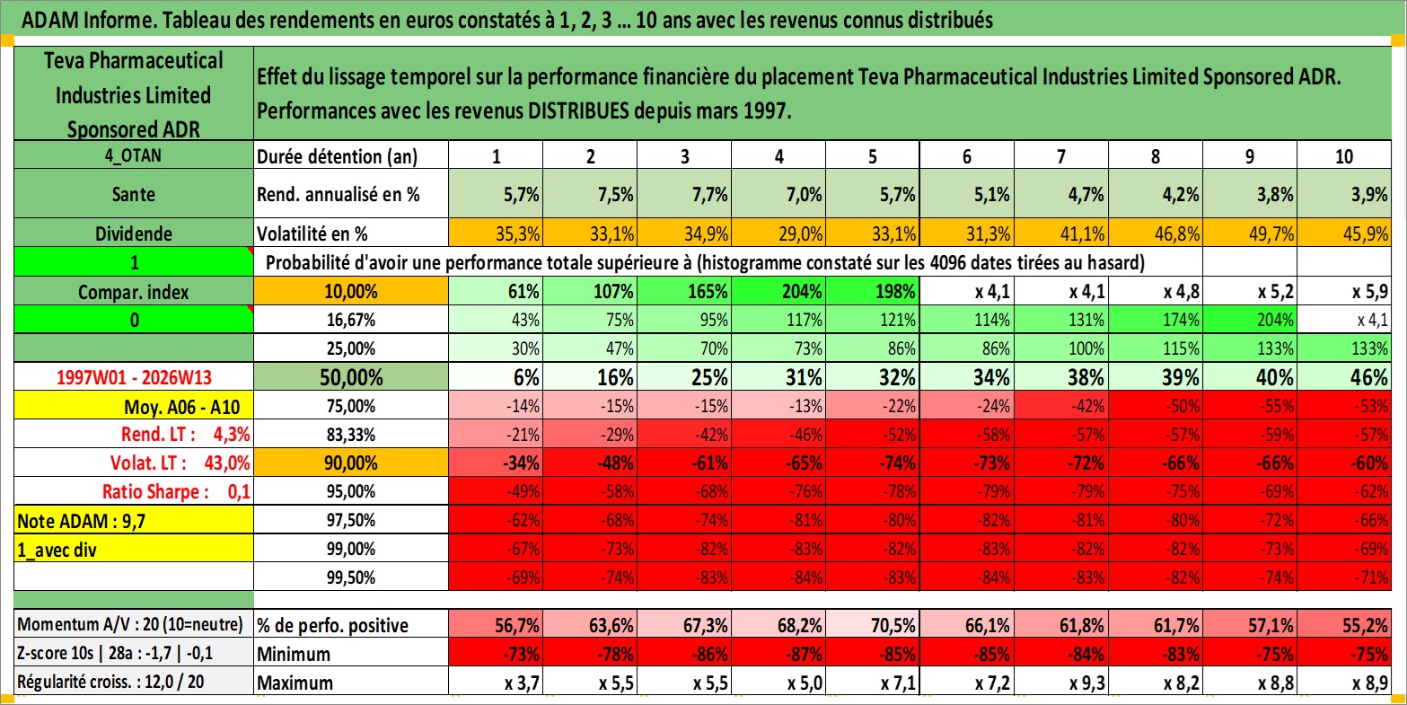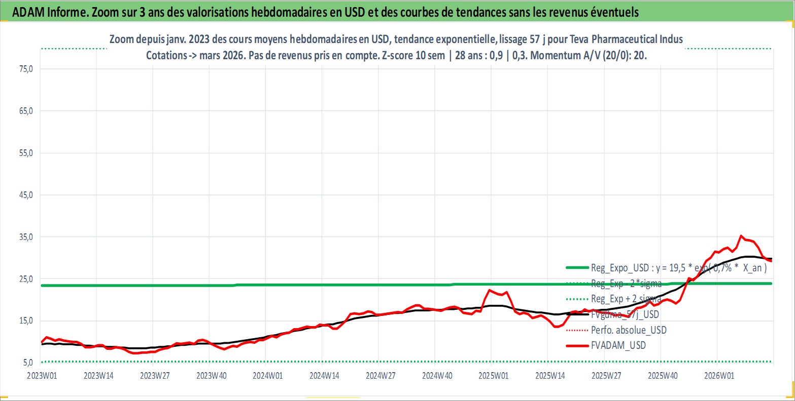 Site dédié aux investisseursPage dédiée sur site financeAnalyse des valorisations hebdomadaires de l'action Teva Pharmaceutical Industries Limited Sponsored ADR. Cet actif est cote en USD. Les valorisations sont en contrevaleur EURO et couvrent les semaines 1997W01 a 2026W13. Les revenus de cet actif financier sont pris en compte depuis la semaine 1997W10. La note ESG de cet actif n'est pas connue.
