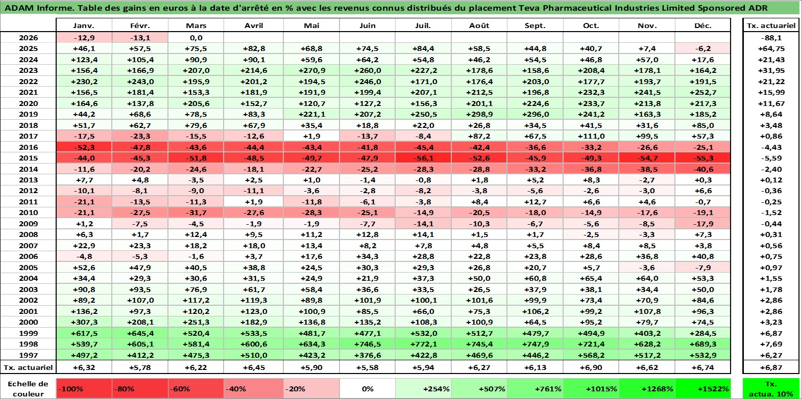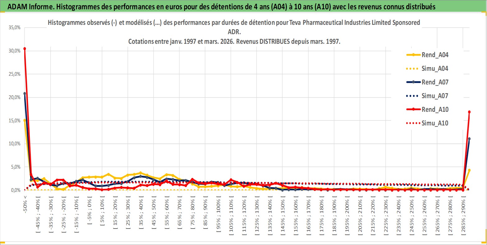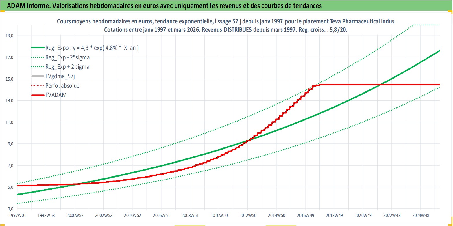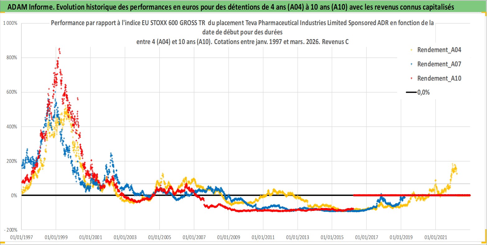 Site dédié aux investisseursPage dédiée sur site financeAnalyse des valorisations hebdomadaires de l'action Teva Pharmaceutical Industries Limited Sponsored ADR. Cet actif est cote en USD. Les valorisations sont en contrevaleur EURO et couvrent les semaines 1997W01 a 2026W13. Les revenus de cet actif financier sont pris en compte depuis la semaine 1997W10. La note ESG de cet actif n'est pas connue.