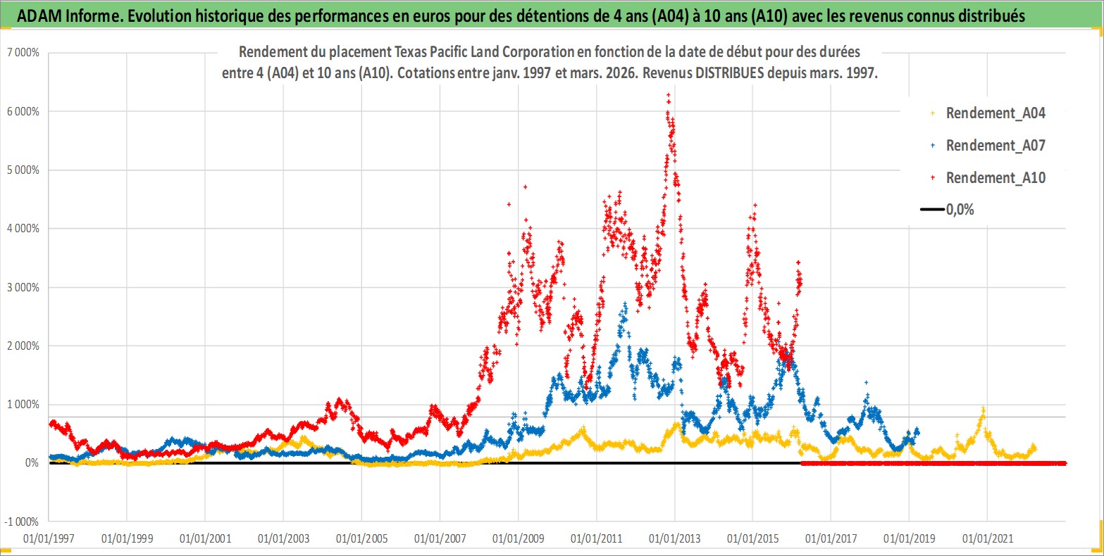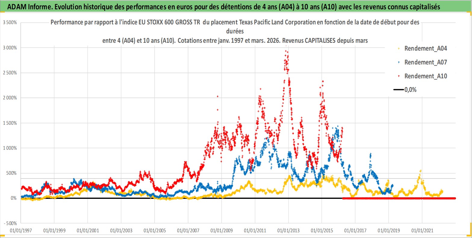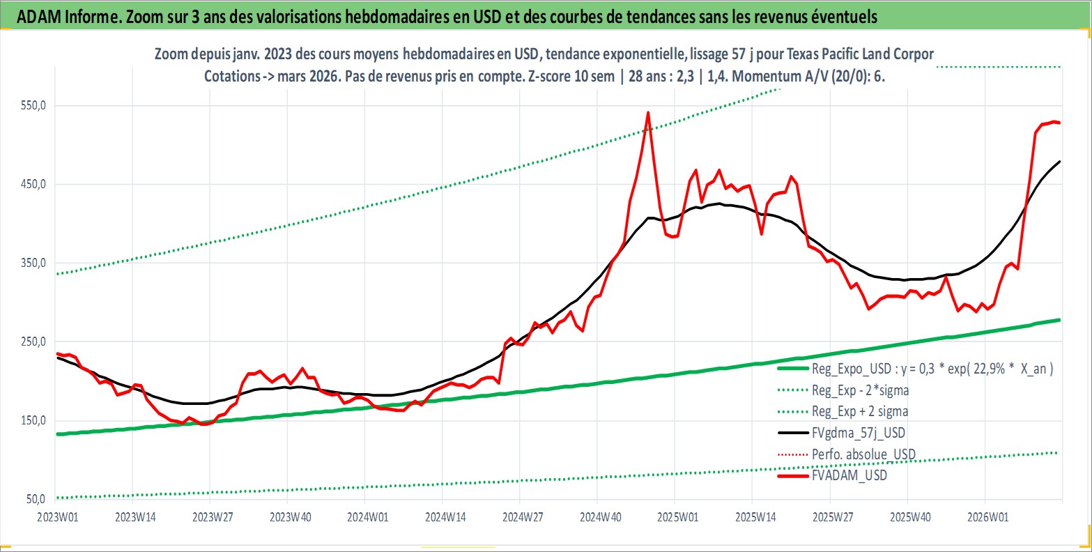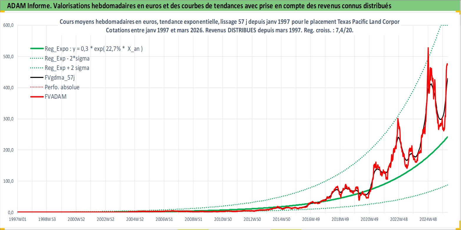 Site dédié aux investisseursPage dédiée sur site financeAnalyse des valorisations hebdomadaires de l'action Texas Pacific Land Corporation. Cet actif est cote en USD. Les valorisations sont en contrevaleur EURO et couvrent les semaines 1997W01 a 2026W13. Les revenus de cet actif financier sont pris en compte depuis la semaine 1997W10. La note ESG de cet actif n'est pas connue.