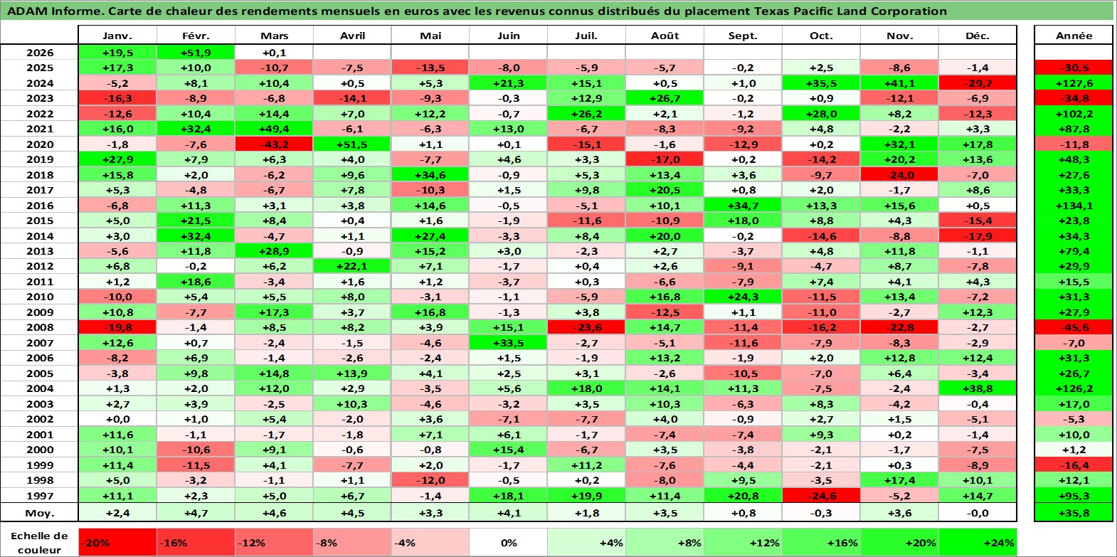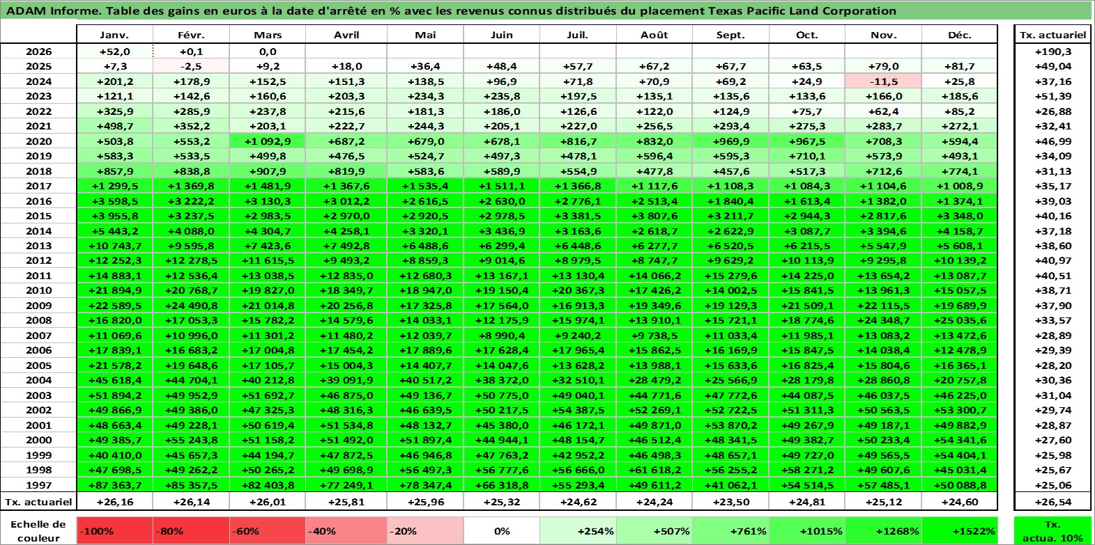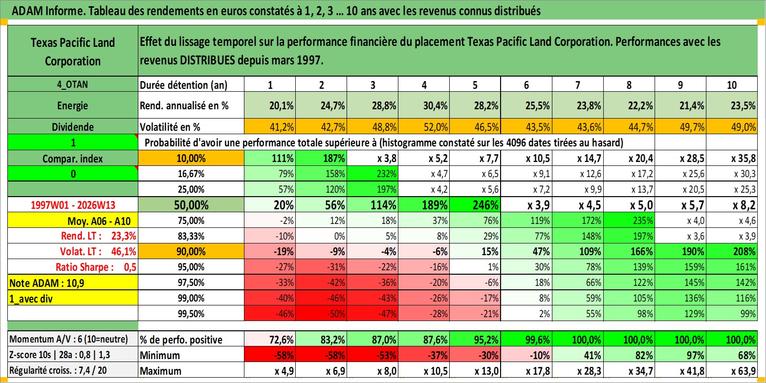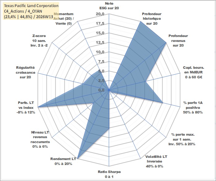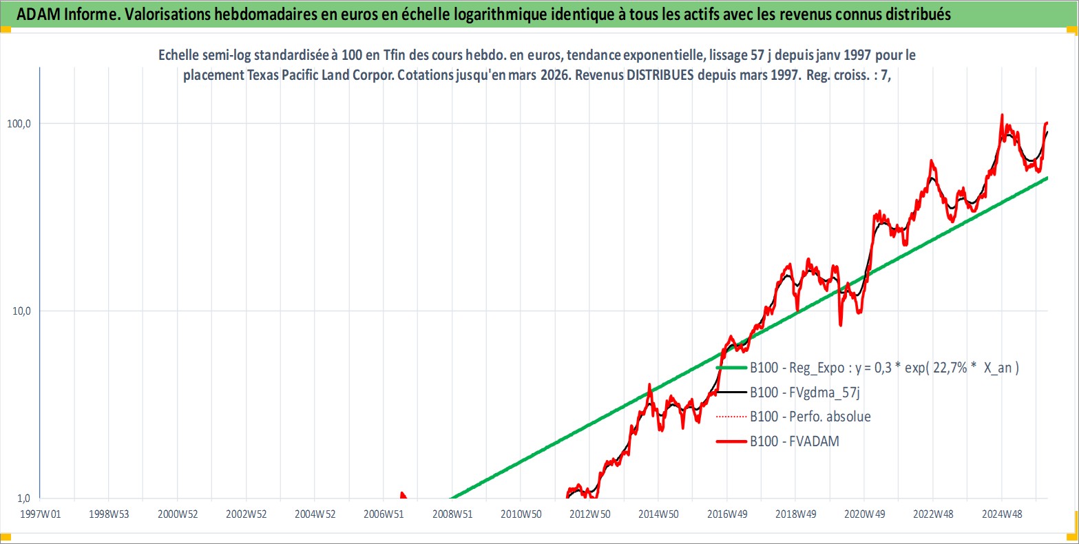 Site dédié aux investisseursPage dédiée sur site financeAnalyse des valorisations hebdomadaires de l'action Texas Pacific Land Corporation. Cet actif est cote en USD. Les valorisations sont en contrevaleur EURO et couvrent les semaines 1997W01 a 2026W13. Les revenus de cet actif financier sont pris en compte depuis la semaine 1997W10. La note ESG de cet actif n'est pas connue.
