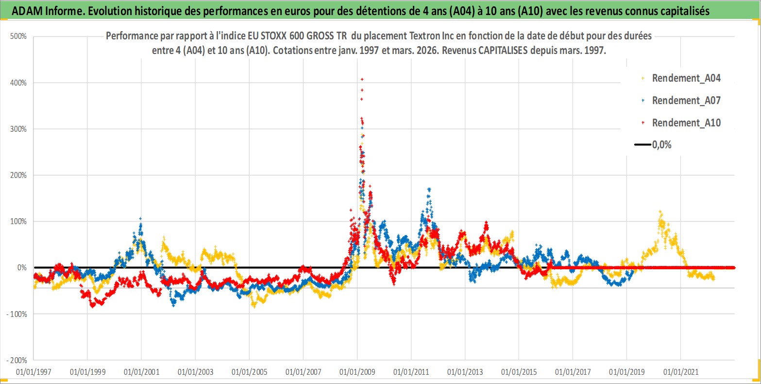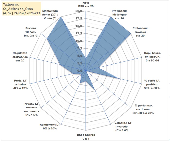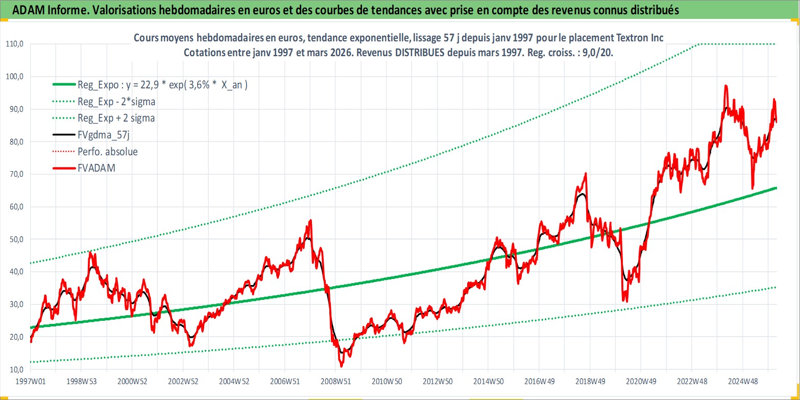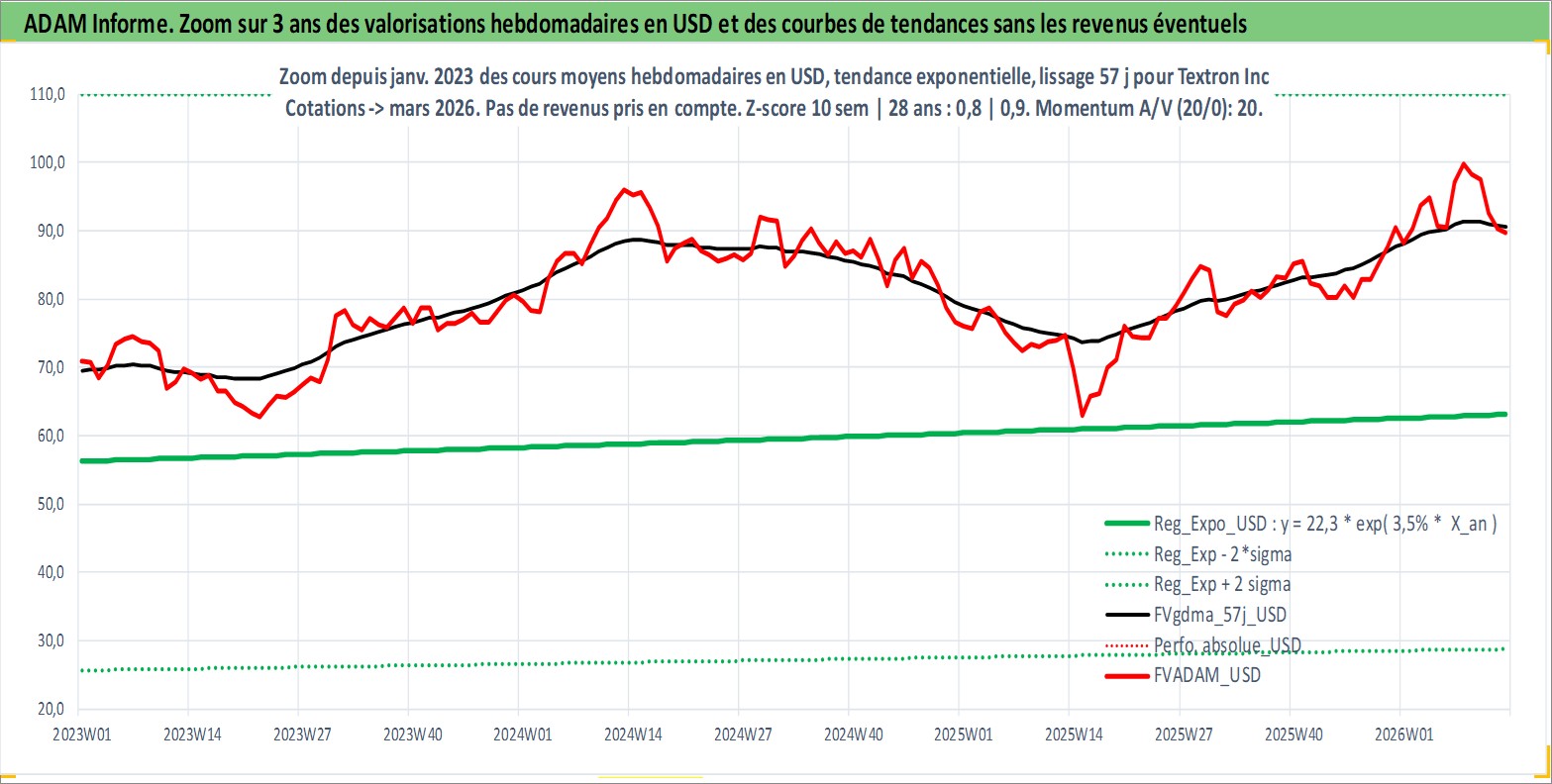 Site dédié aux investisseursPage dédiée sur site financeAnalyse des valorisations hebdomadaires de l'action Textron Inc. Cet actif est cote en USD. Les valorisations sont en contrevaleur EURO et couvrent les semaines 1997W01 a 2026W13. Les revenus de cet actif financier sont pris en compte depuis la semaine 1997W11. La note globale ESG de cet actif est estimee a 4.0 (apres rebasage entre 0 et 20).