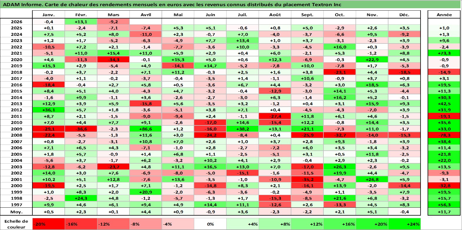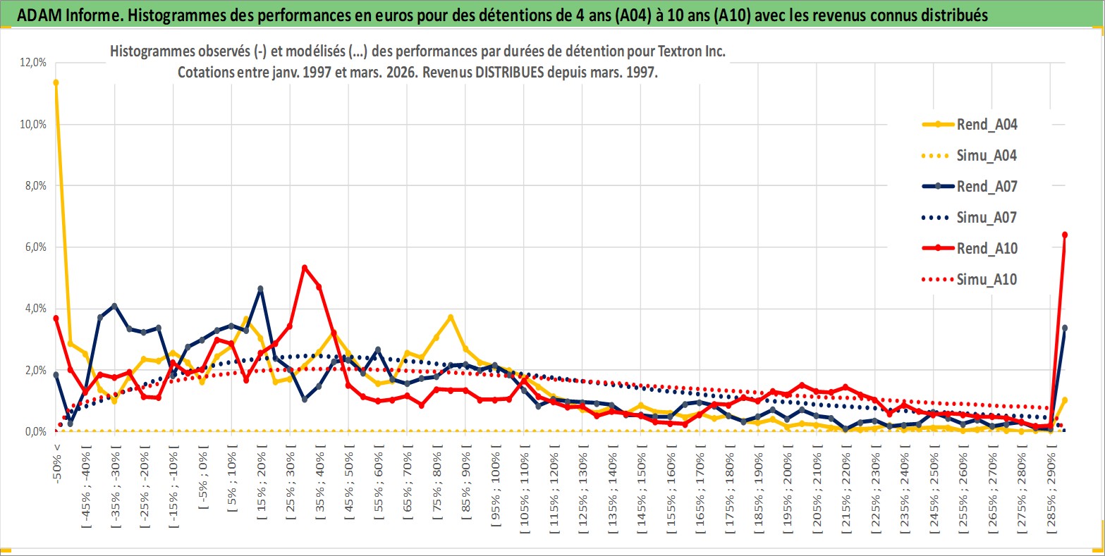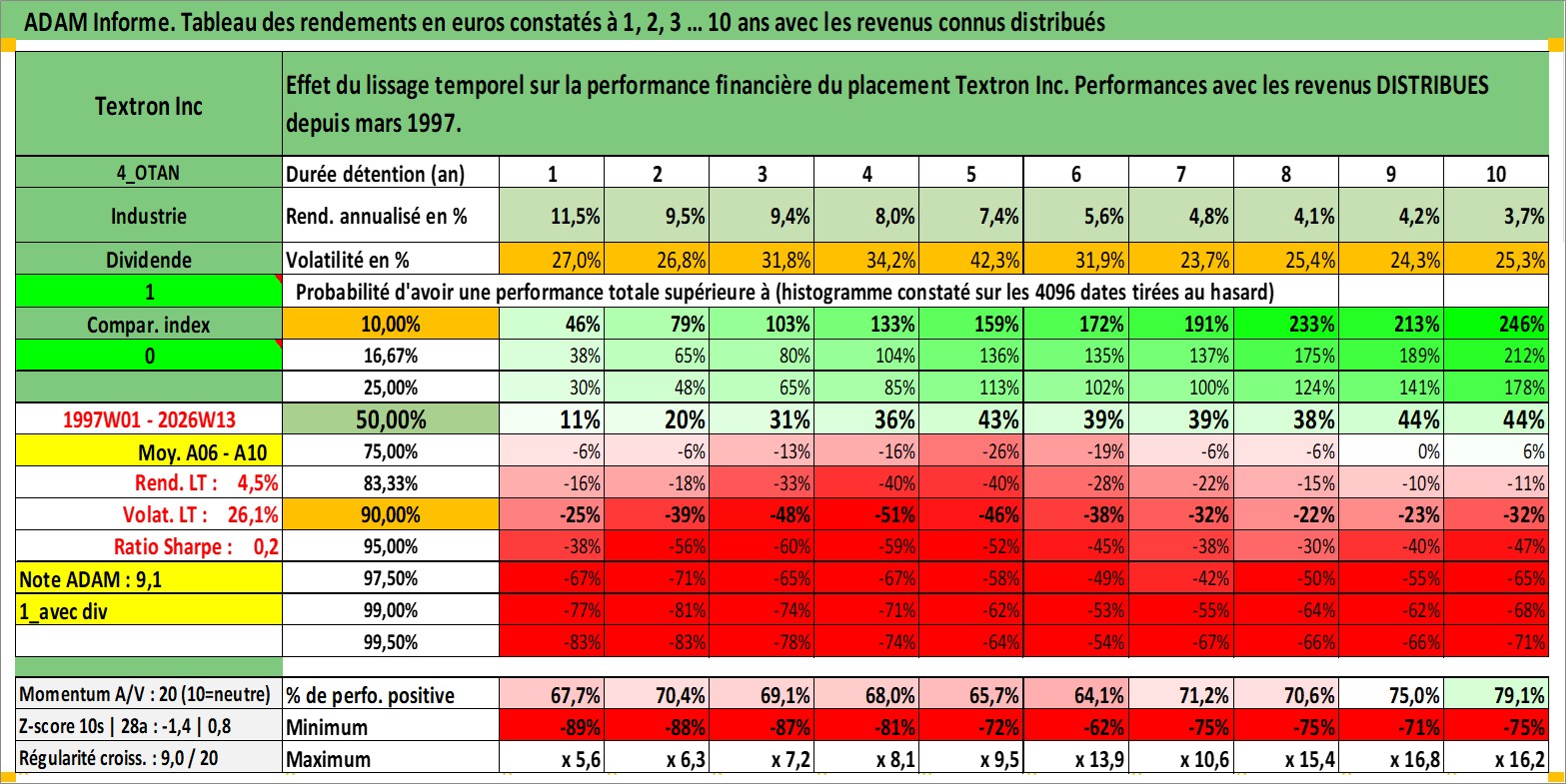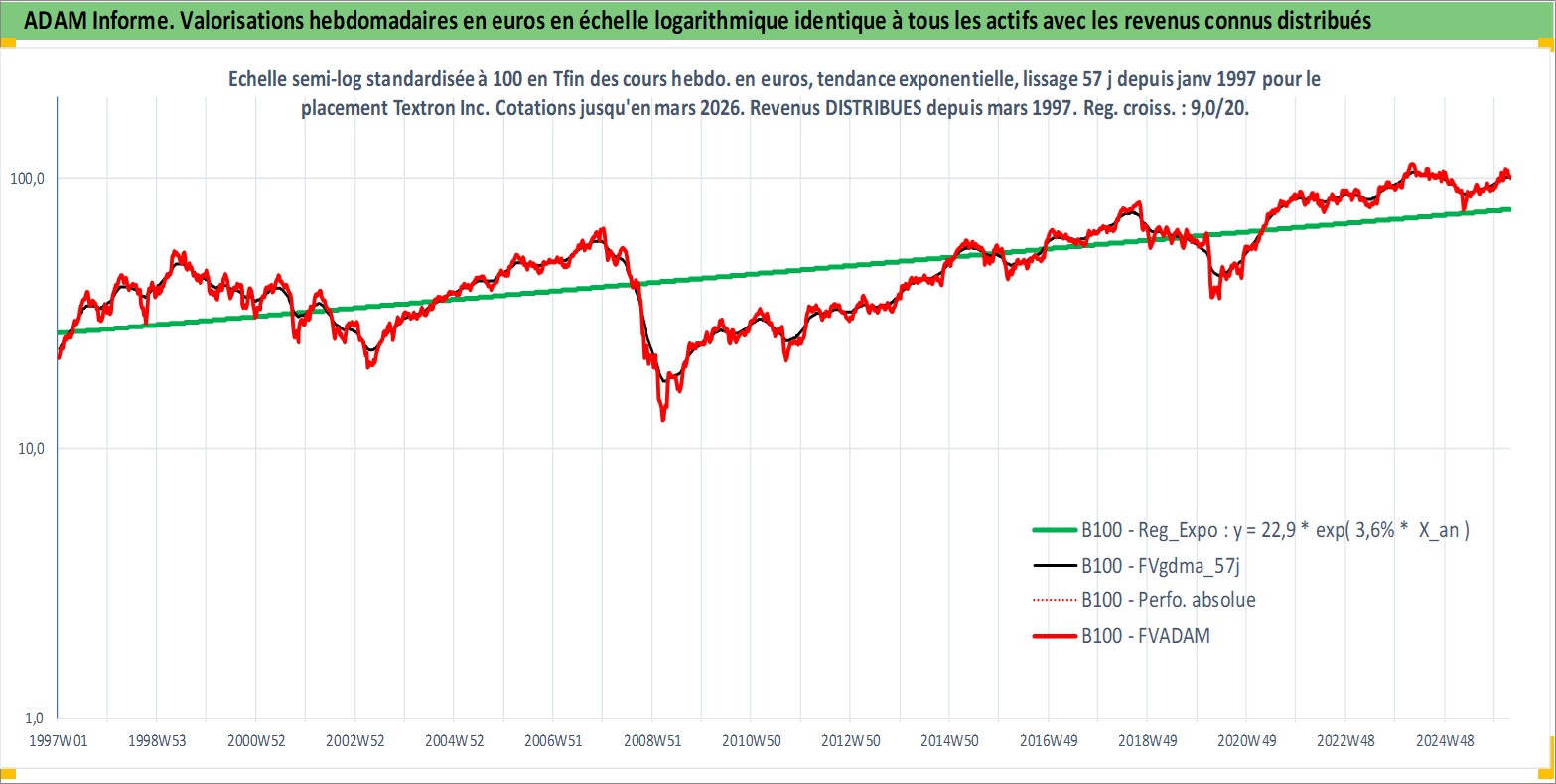 Site dédié aux investisseursPage dédiée sur site financeAnalyse des valorisations hebdomadaires de l'action Textron Inc. Cet actif est cote en USD. Les valorisations sont en contrevaleur EURO et couvrent les semaines 1997W01 a 2026W13. Les revenus de cet actif financier sont pris en compte depuis la semaine 1997W11. La note globale ESG de cet actif est estimee a 4.0 (apres rebasage entre 0 et 20).