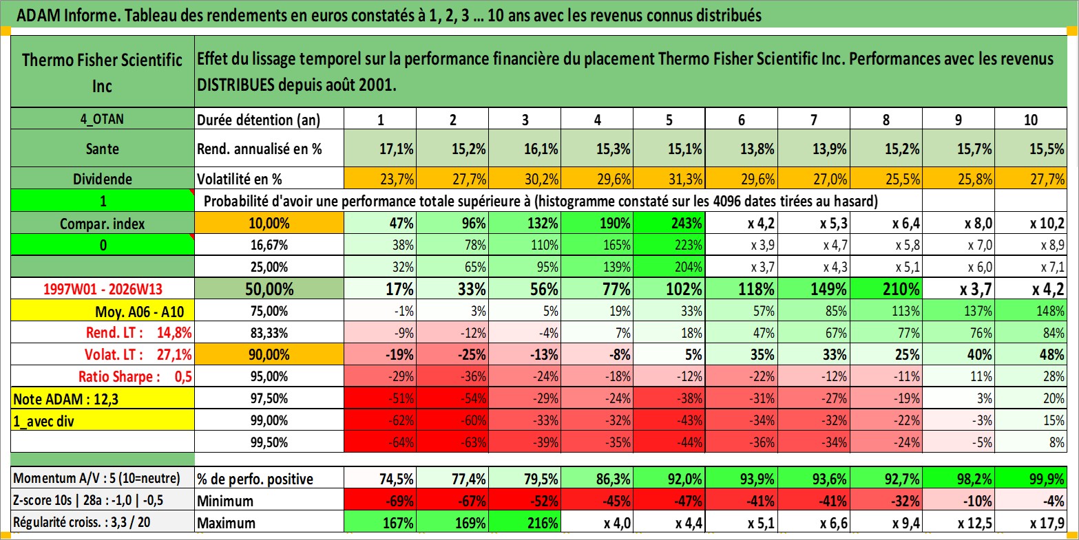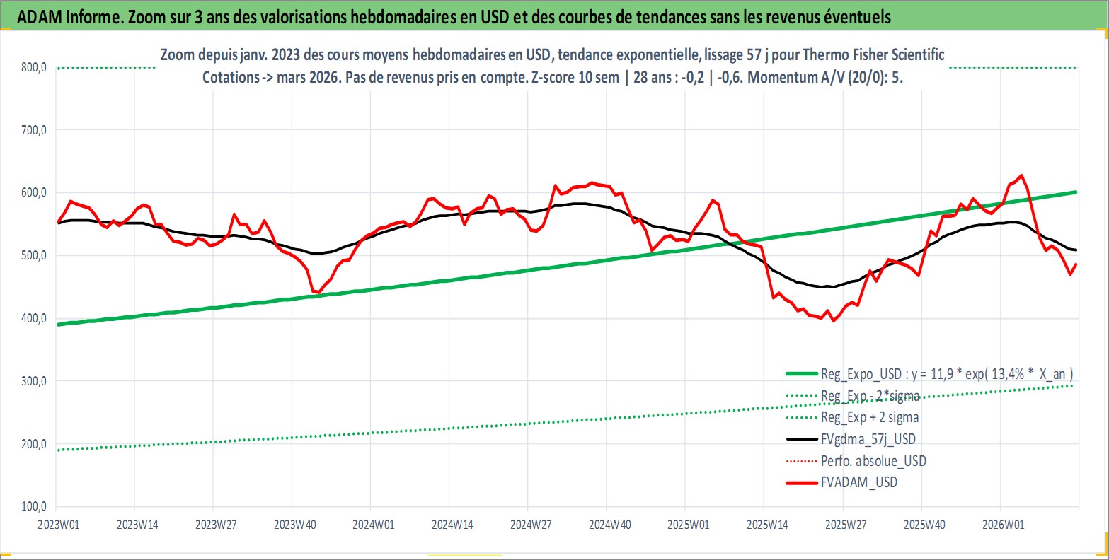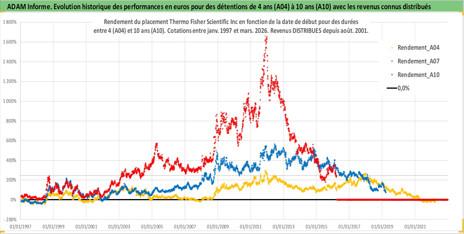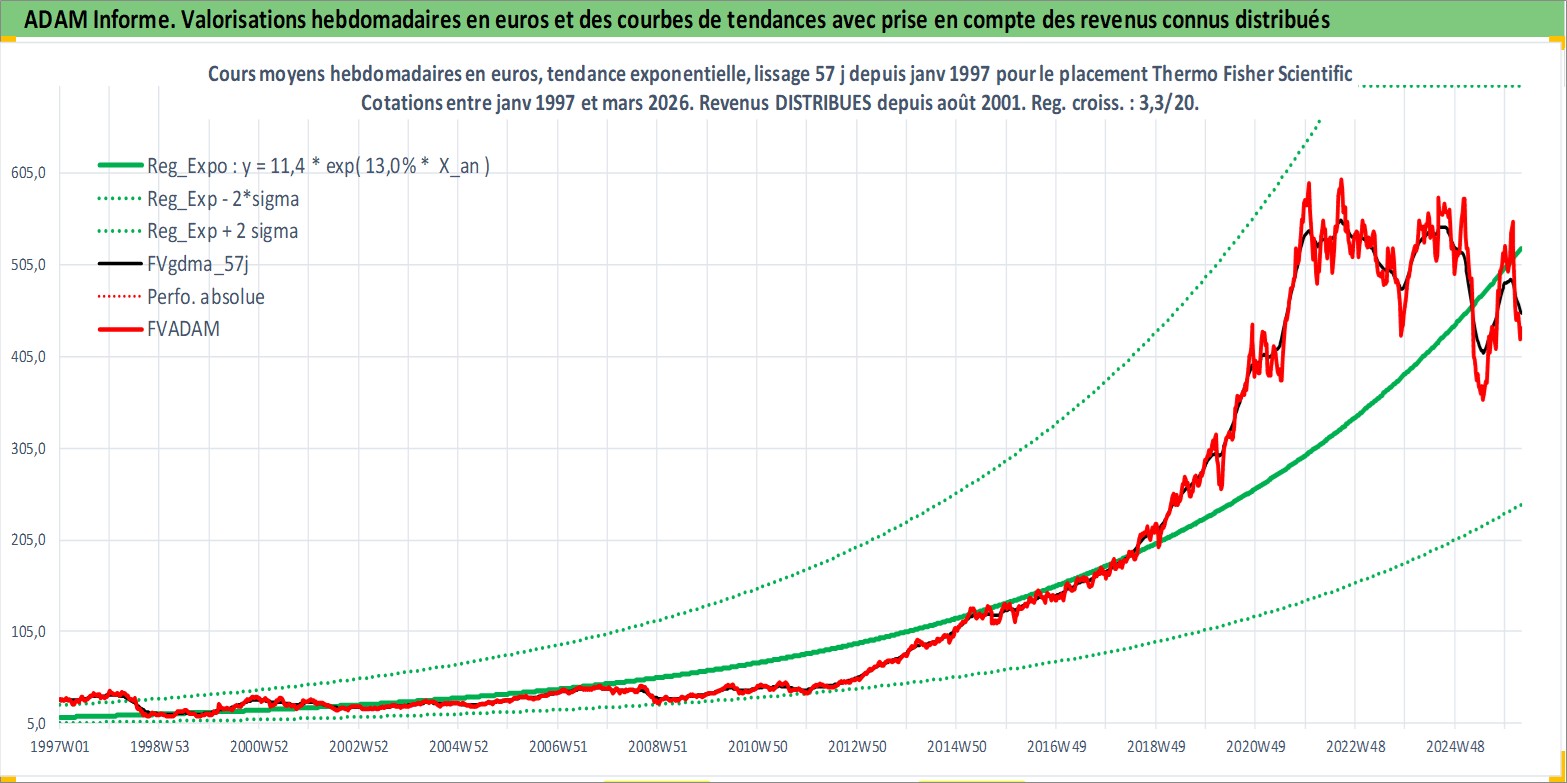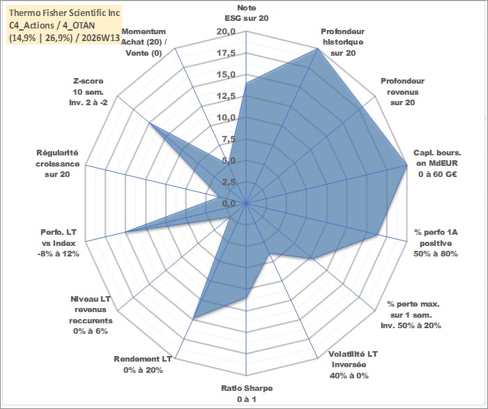 Site dédié aux investisseursPage dédiée sur site financeAnalyse des valorisations hebdomadaires de l'action Thermo Fisher Scientific Inc. Cet actif est cote en USD. Les valorisations sont en contrevaleur EURO et couvrent les semaines 1997W01 a 2026W13. Les revenus de cet actif financier sont pris en compte depuis la semaine 2001W32. La note globale ESG de cet actif est estimee a 14.0 (apres rebasage entre 0 et 20).