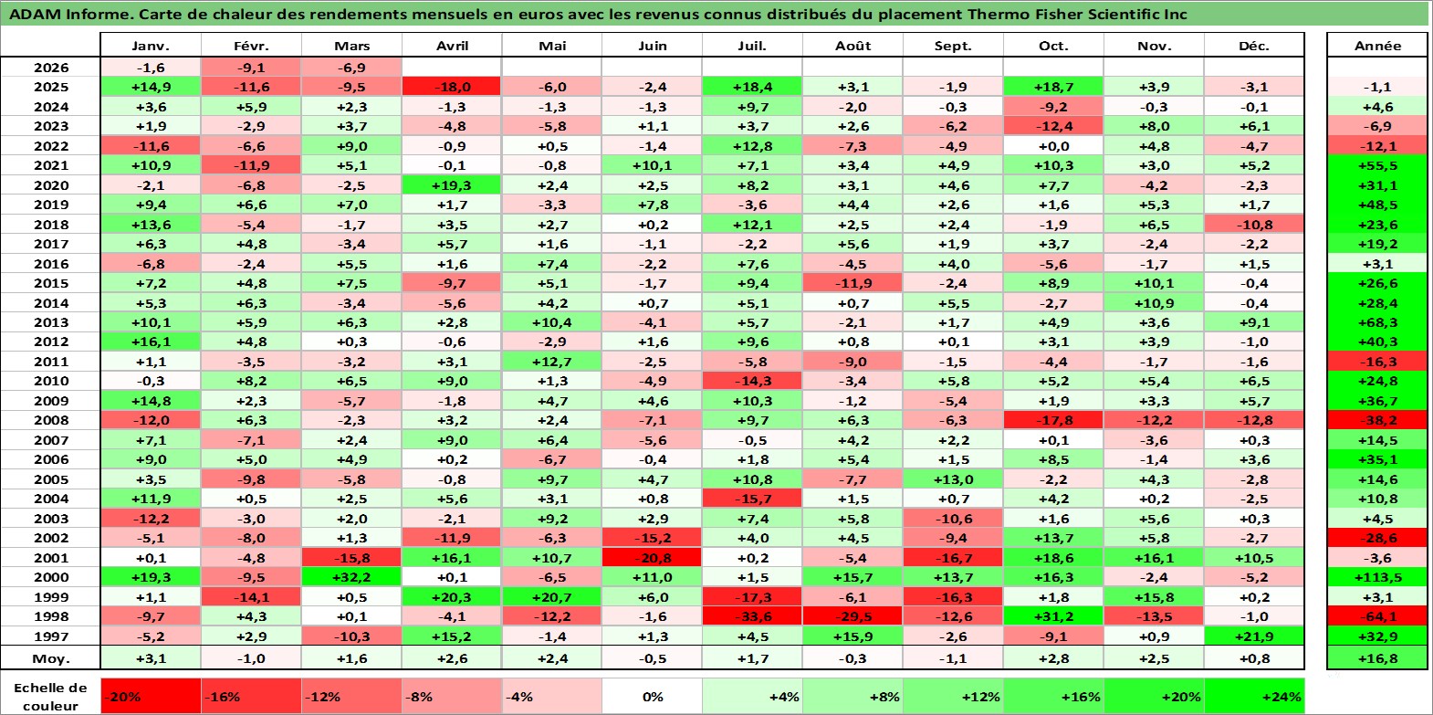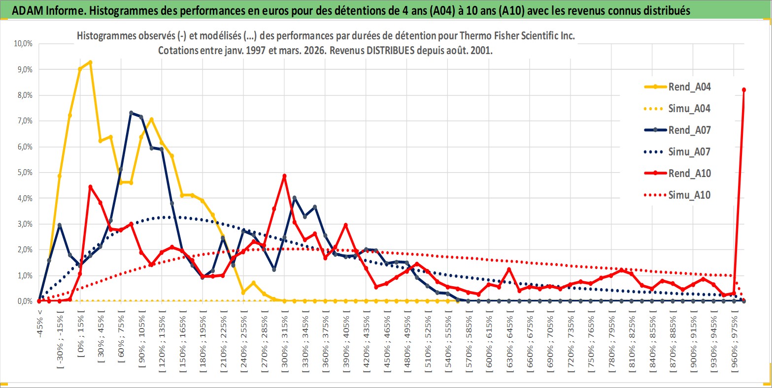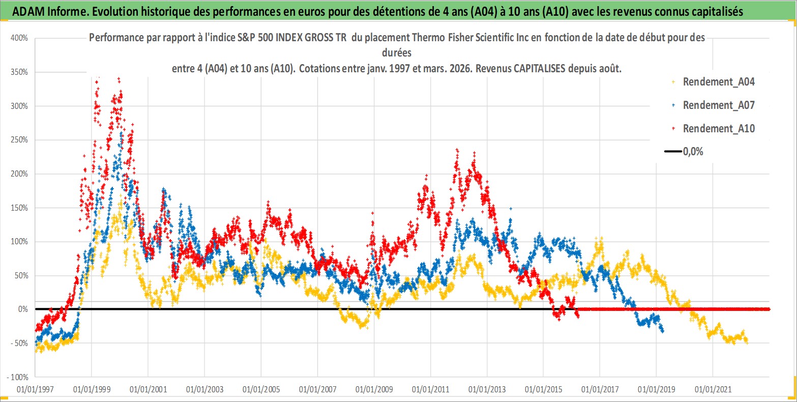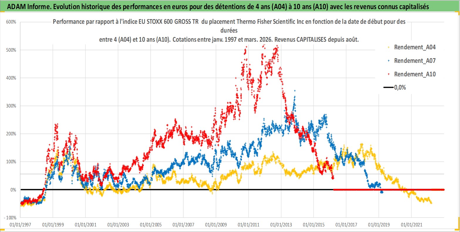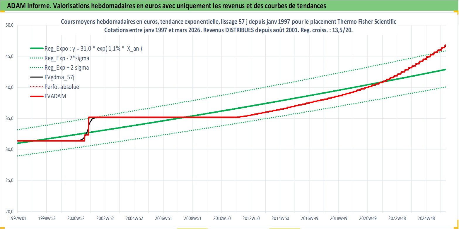 Site dédié aux investisseursPage dédiée sur site financeAnalyse des valorisations hebdomadaires de l'action Thermo Fisher Scientific Inc. Cet actif est cote en USD. Les valorisations sont en contrevaleur EURO et couvrent les semaines 1997W01 a 2026W13. Les revenus de cet actif financier sont pris en compte depuis la semaine 2001W32. La note globale ESG de cet actif est estimee a 14.0 (apres rebasage entre 0 et 20).