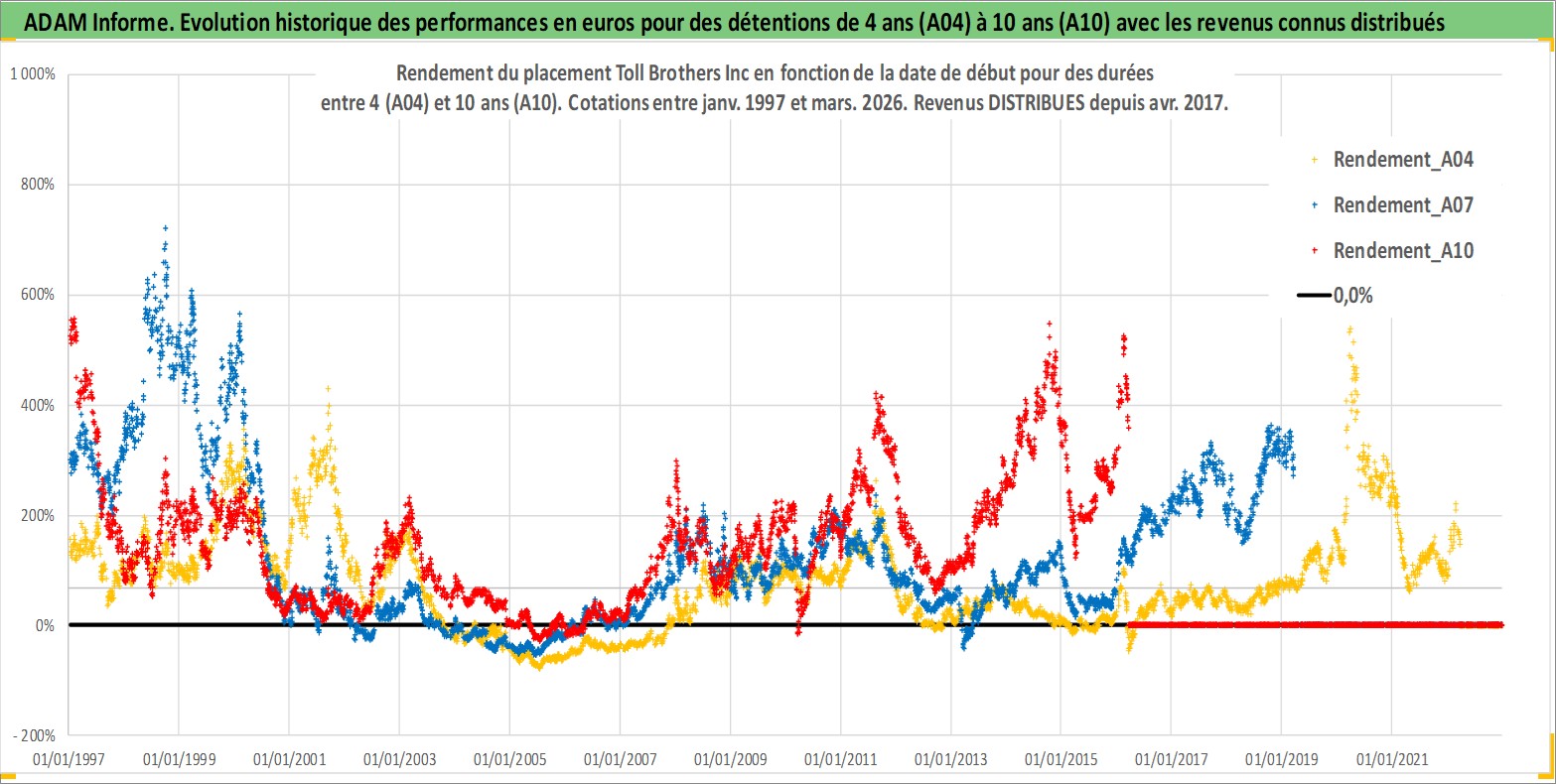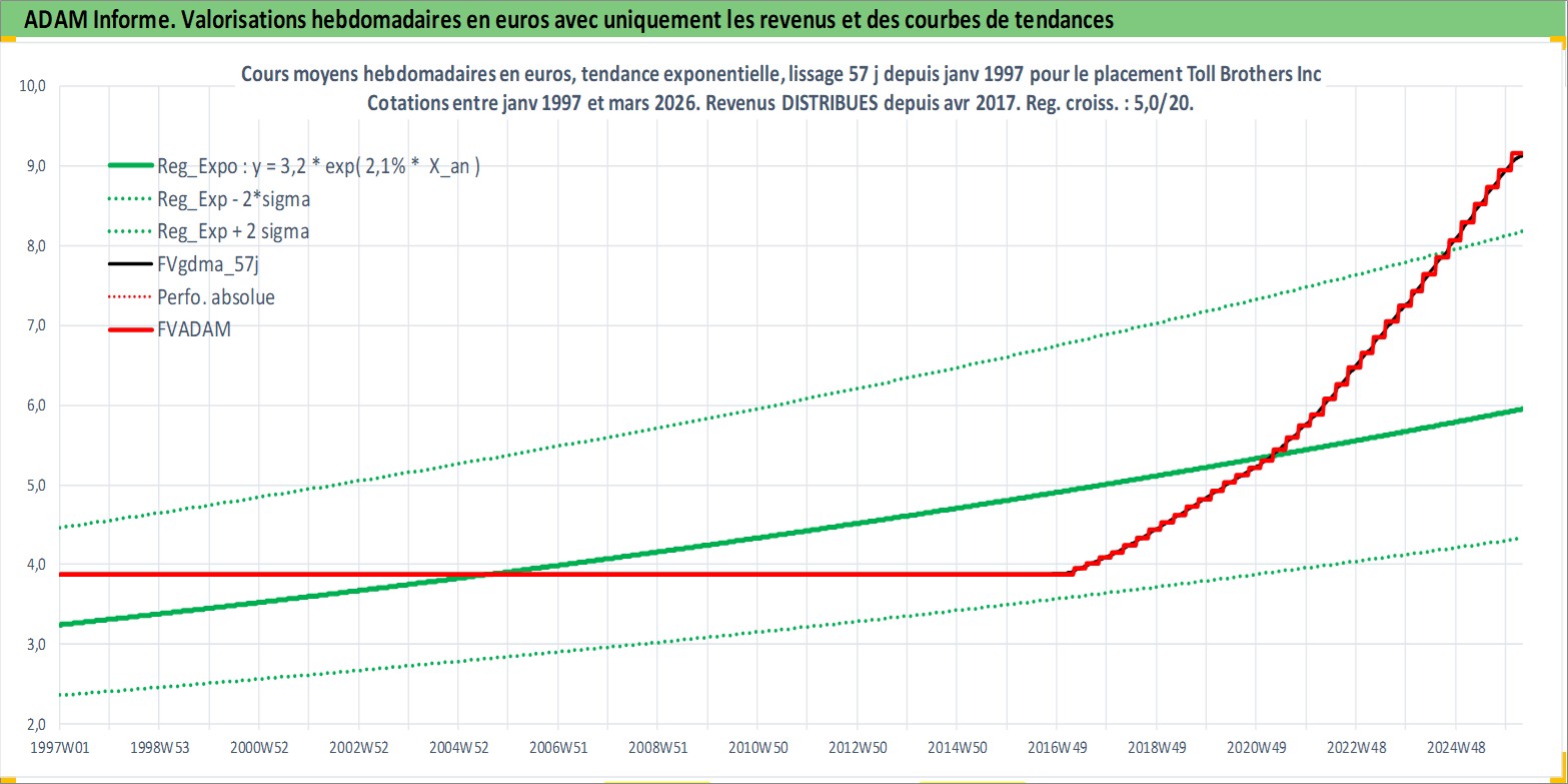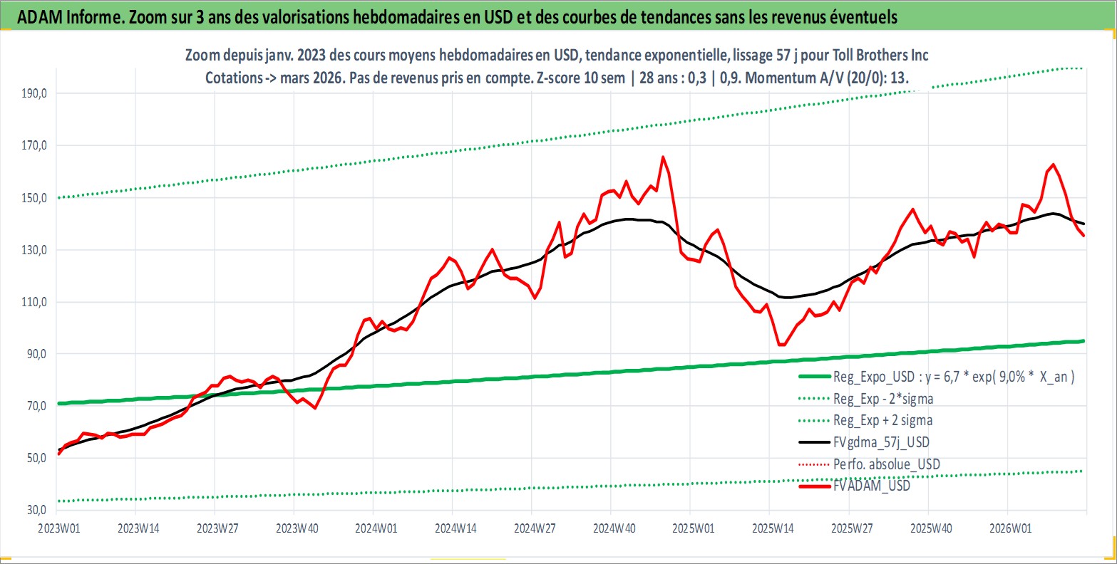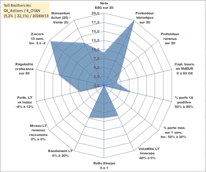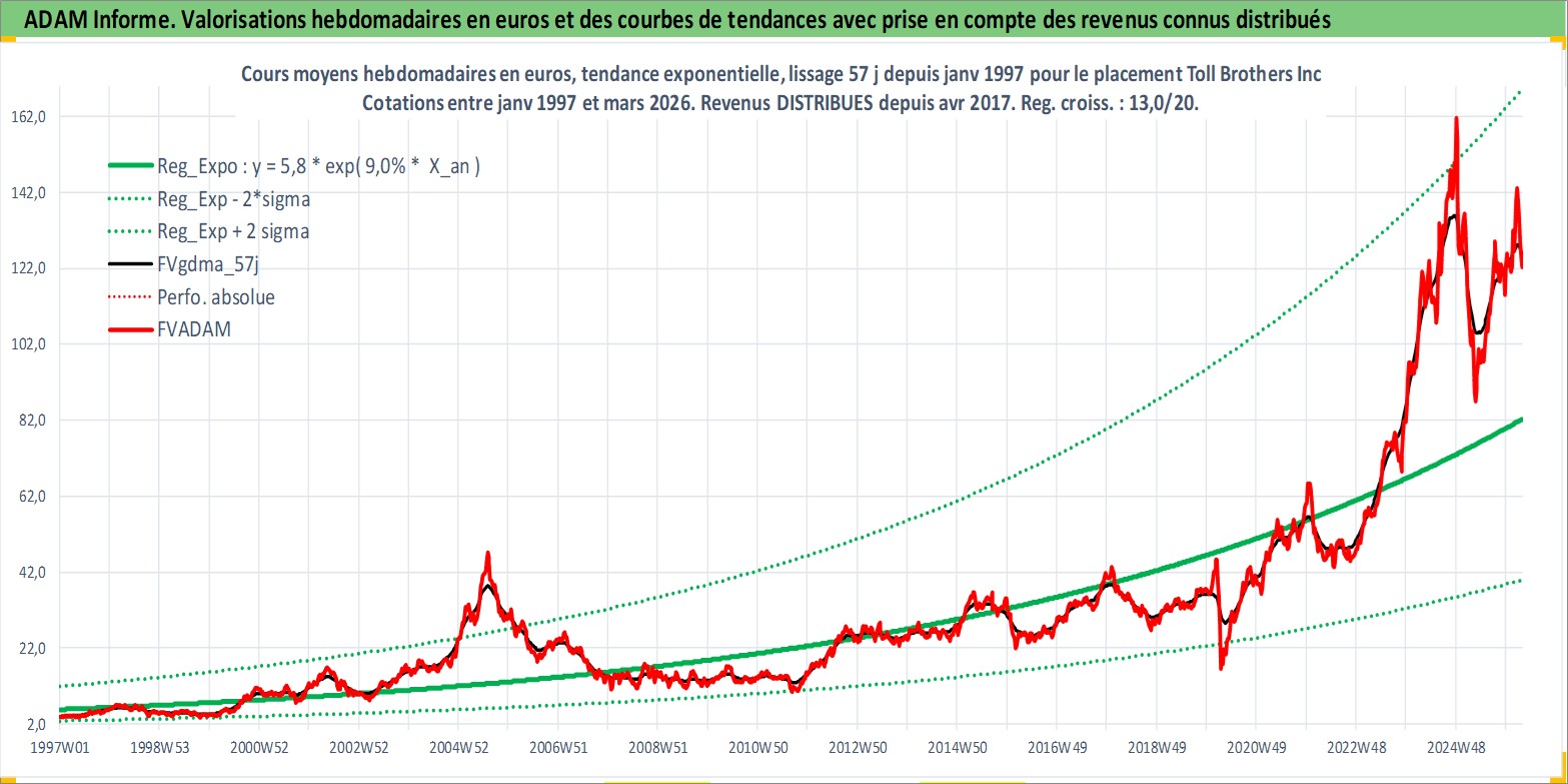 Site dédié aux investisseursPage dédiée sur site financeAnalyse des valorisations hebdomadaires de l'action Toll Brothers Inc. Cet actif est cote en USD. Les valorisations sont en contrevaleur EURO et couvrent les semaines 1997W01 a 2026W13. Les revenus de cet actif financier sont pris en compte depuis la semaine 2017W15. La note globale ESG de cet actif est estimee a 9.0 (apres rebasage entre 0 et 20).