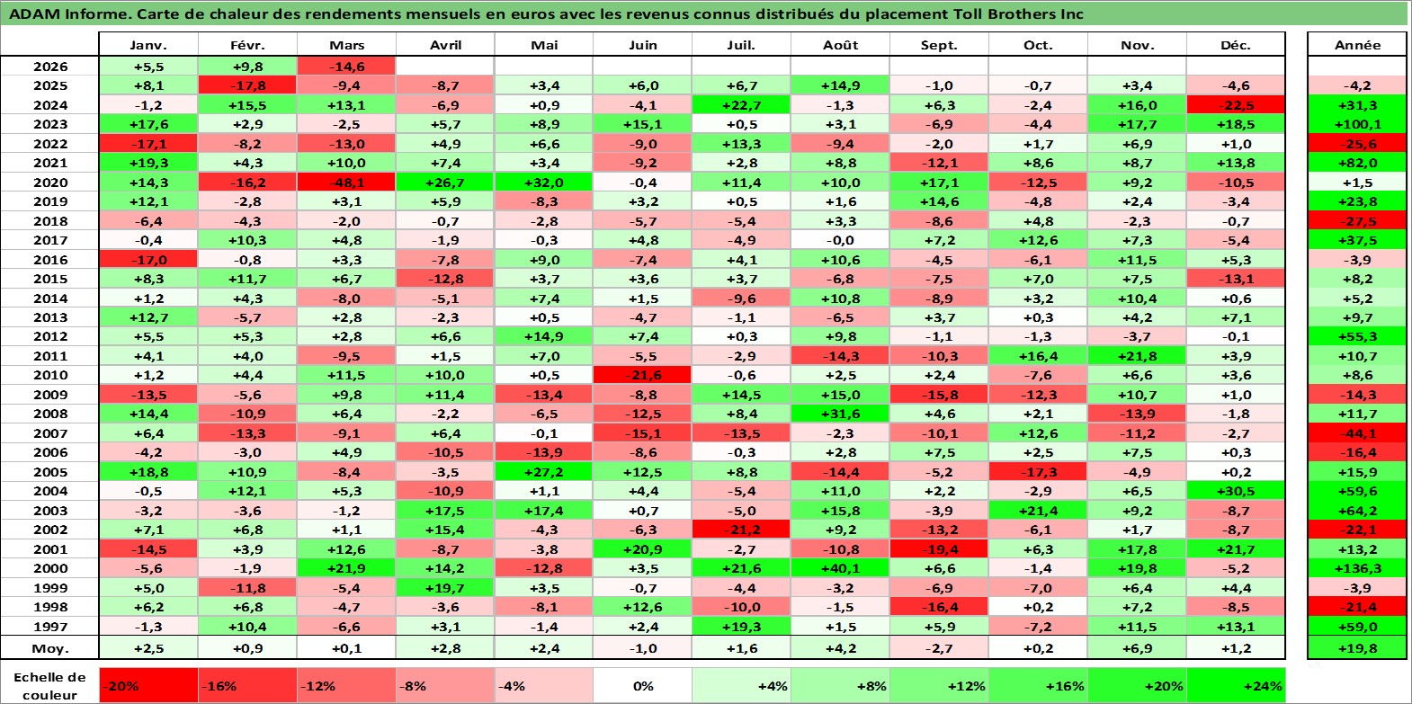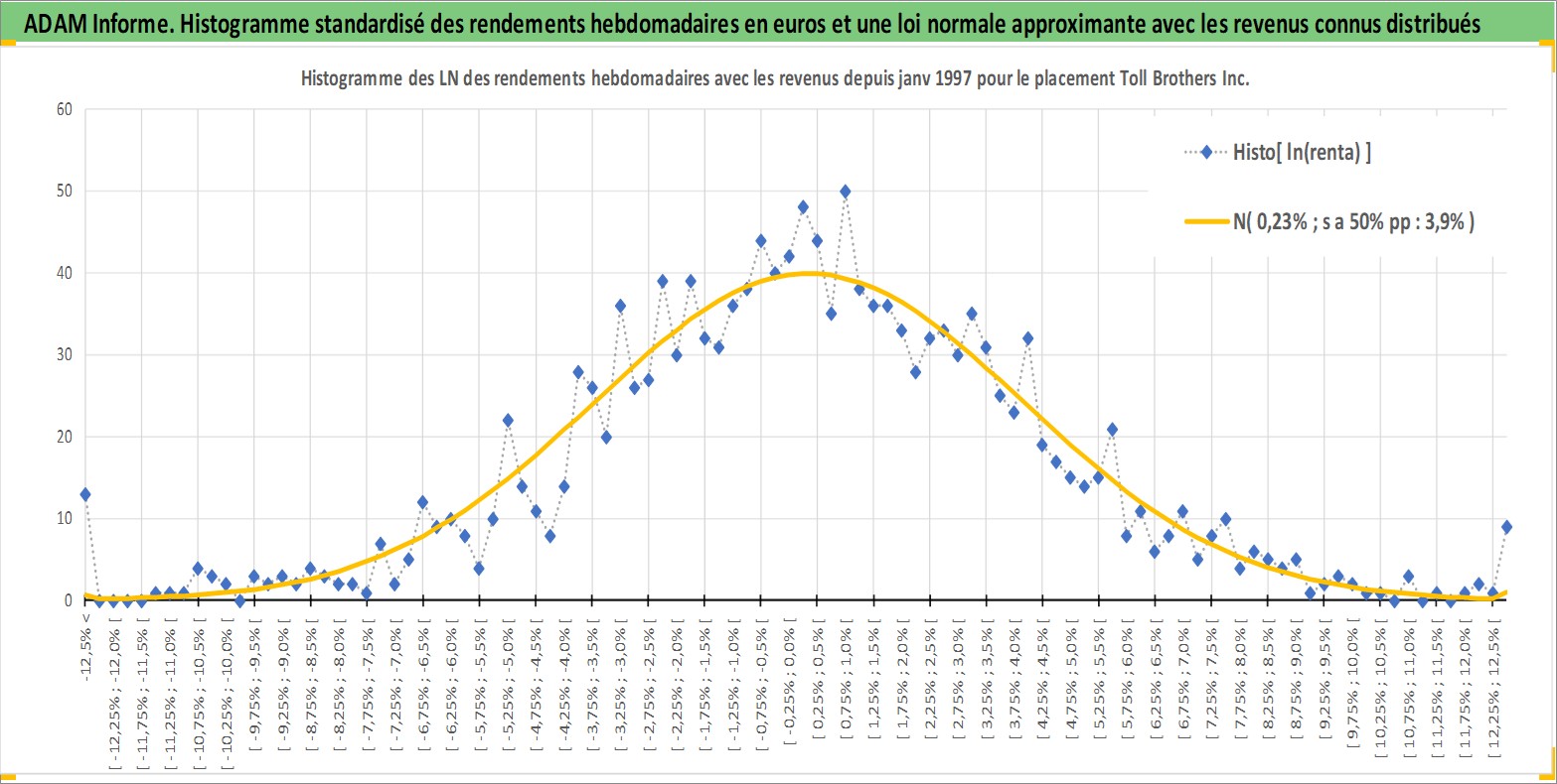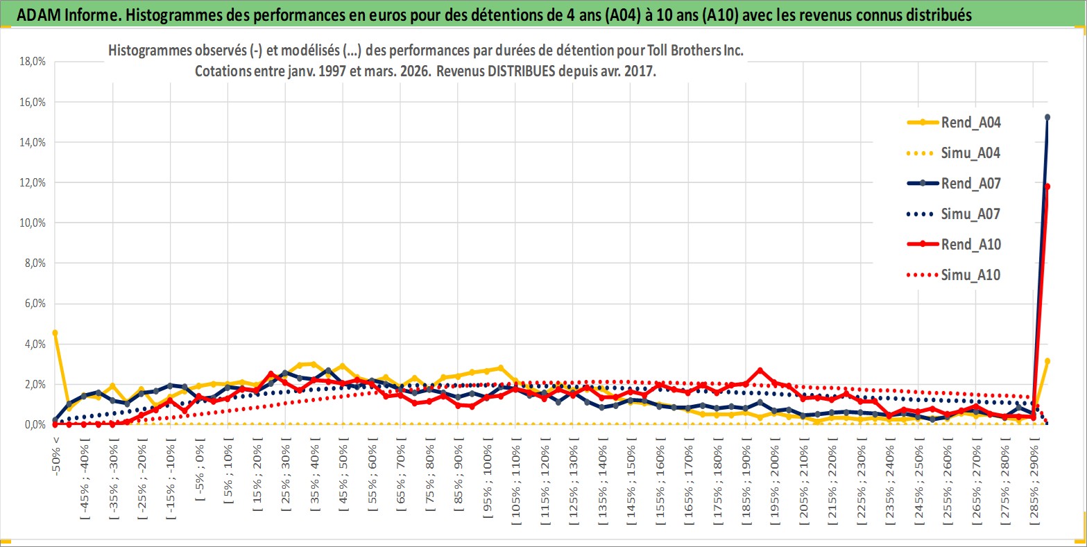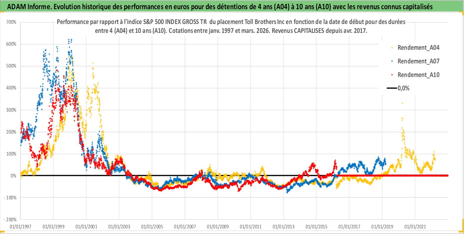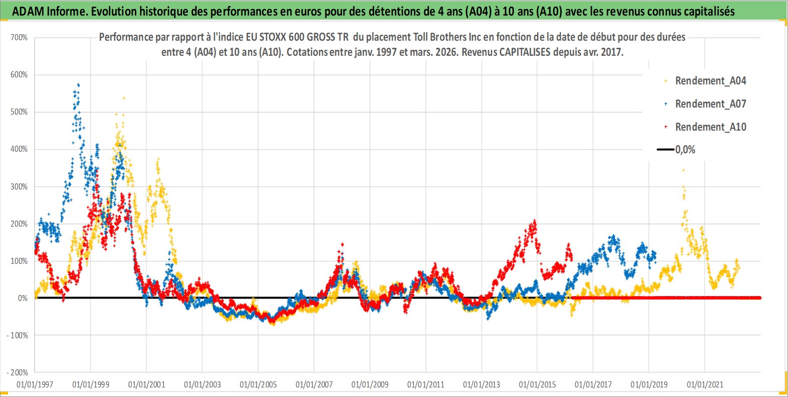 Site dédié aux investisseursPage dédiée sur site financeAnalyse des valorisations hebdomadaires de l'action Toll Brothers Inc. Cet actif est cote en USD. Les valorisations sont en contrevaleur EURO et couvrent les semaines 1997W01 a 2026W13. Les revenus de cet actif financier sont pris en compte depuis la semaine 2017W15. La note globale ESG de cet actif est estimee a 9.0 (apres rebasage entre 0 et 20).