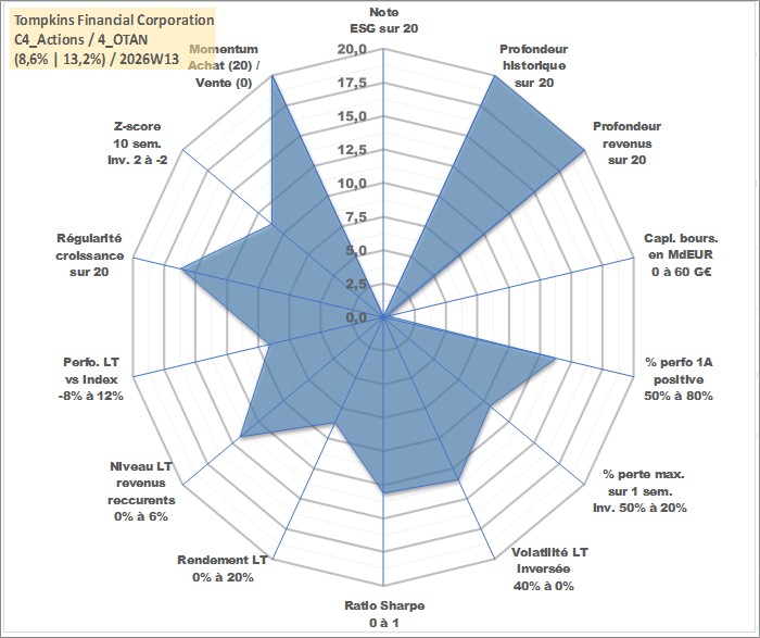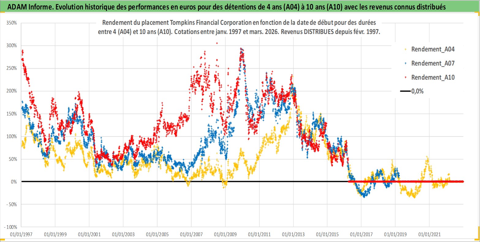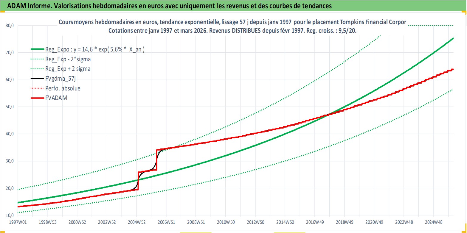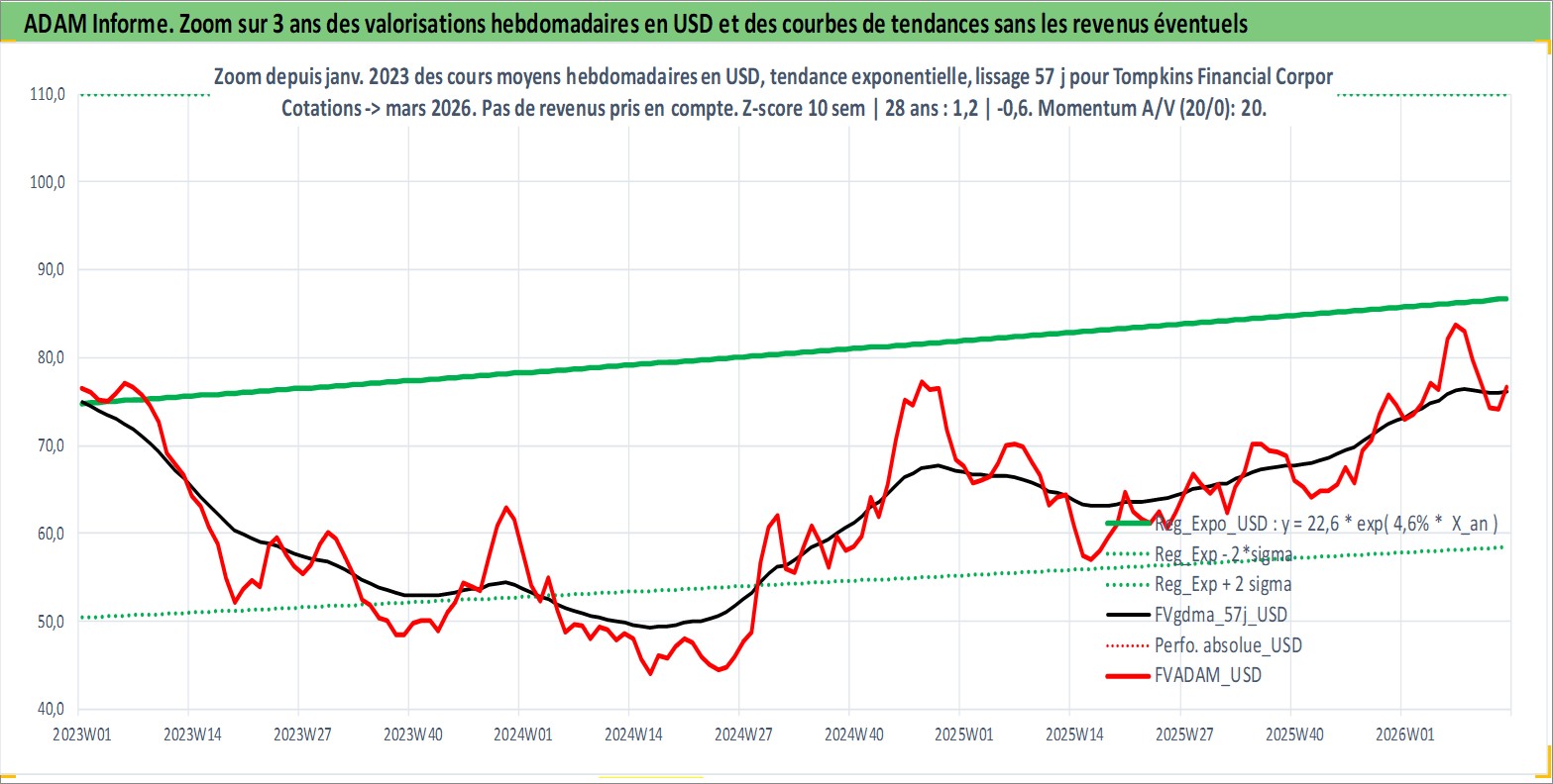 Site dédié aux investisseursPage dédiée sur site financeAnalyse des valorisations hebdomadaires de l'action Tompkins Financial Corporation. Cet actif est cote en USD. Les valorisations sont en contrevaleur EURO et couvrent les semaines 1997W01 a 2026W13. Les revenus de cet actif financier sont pris en compte depuis la semaine 1997W09. La note ESG de cet actif n'est pas connue.