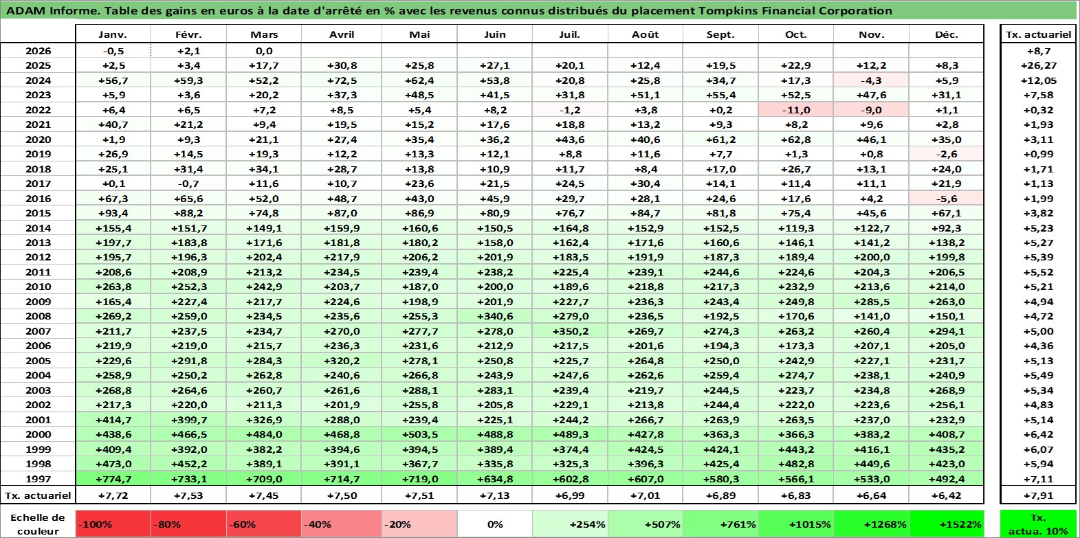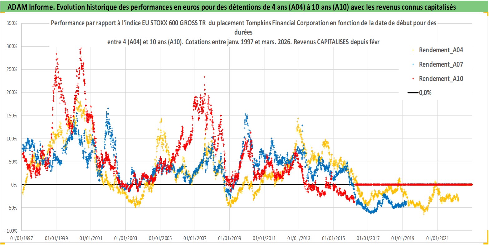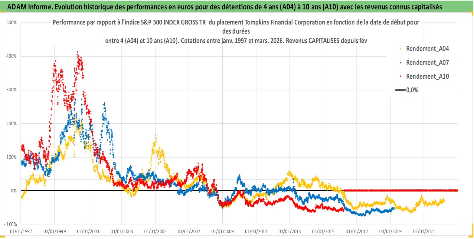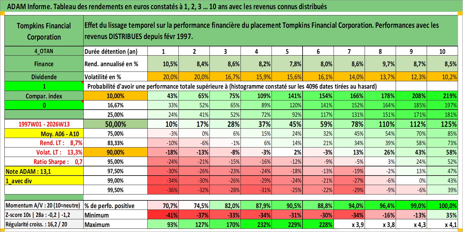 Site dédié aux investisseursPage dédiée sur site financeAnalyse des valorisations hebdomadaires de l'action Tompkins Financial Corporation. Cet actif est cote en USD. Les valorisations sont en contrevaleur EURO et couvrent les semaines 1997W01 a 2026W13. Les revenus de cet actif financier sont pris en compte depuis la semaine 1997W09. La note ESG de cet actif n'est pas connue.