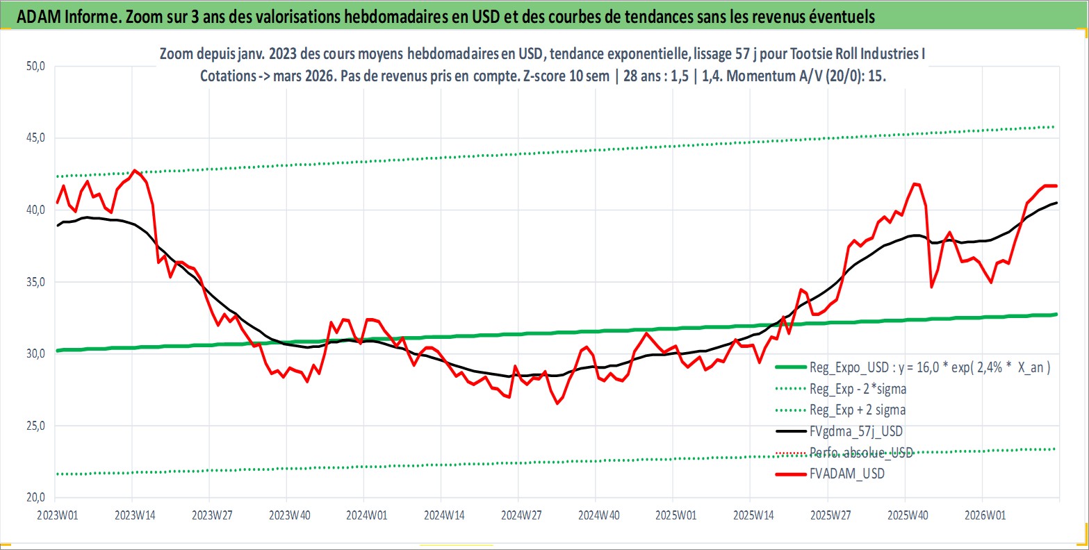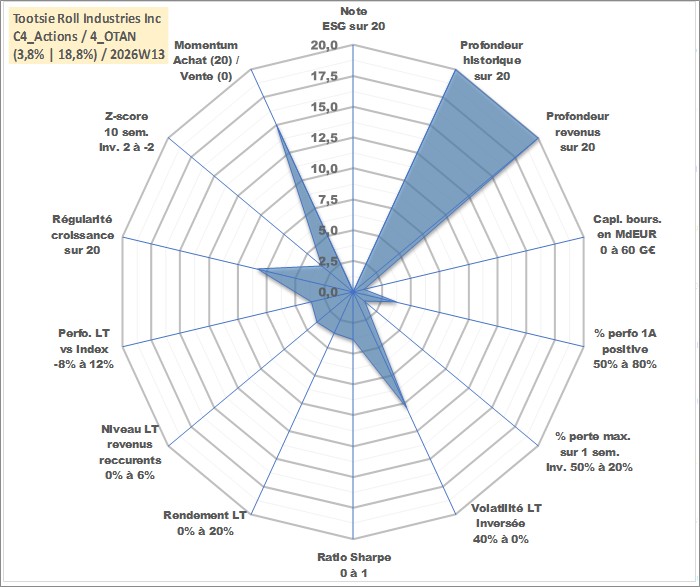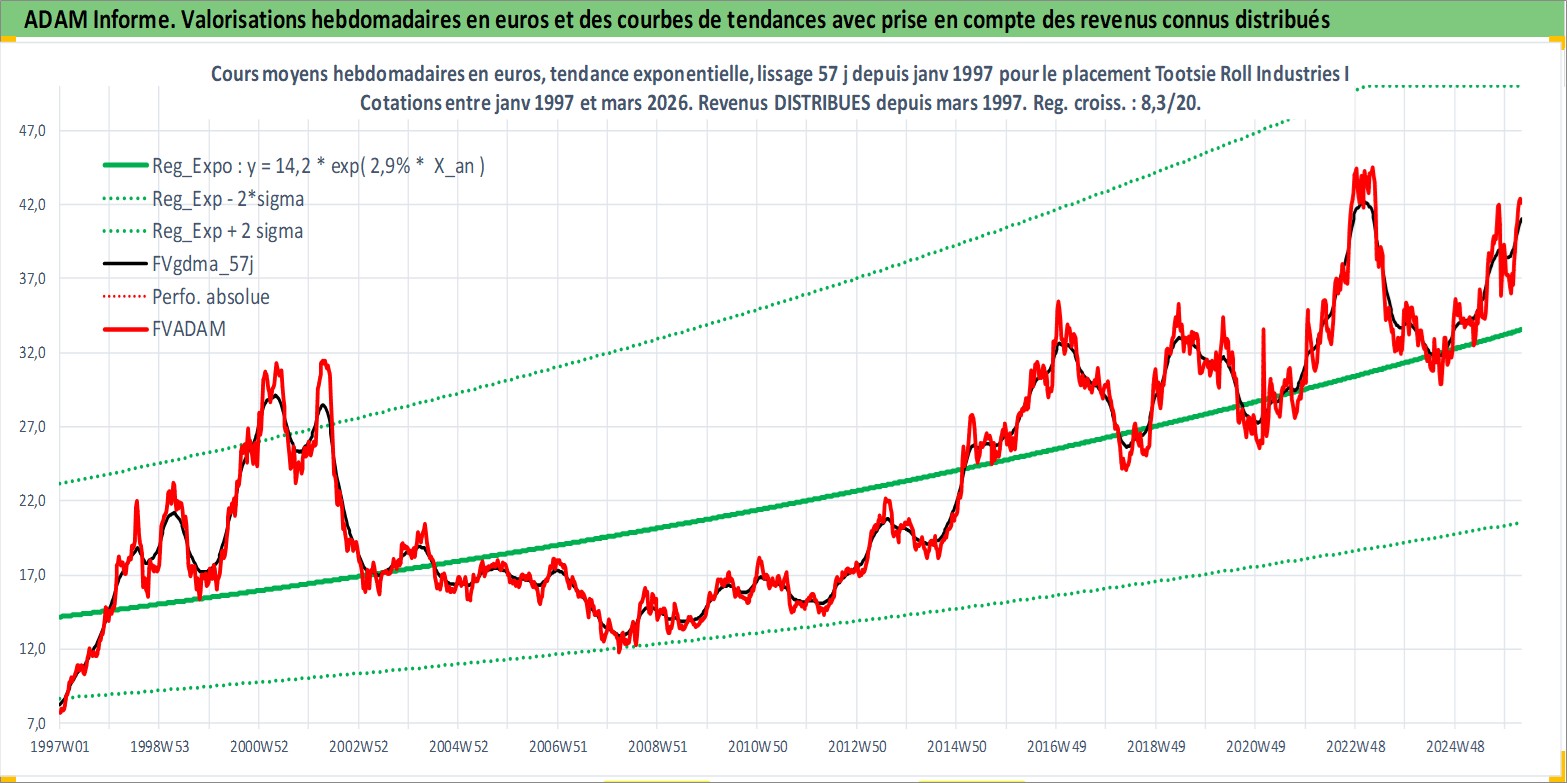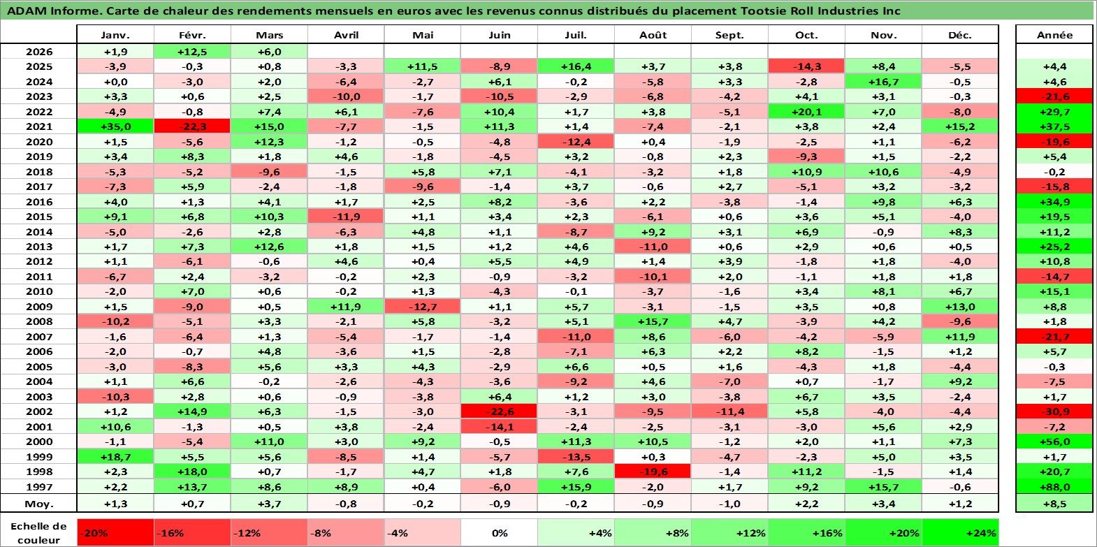 Site dédié aux investisseursPage dédiée sur site financeAnalyse des valorisations hebdomadaires de l'action Tootsie Roll Industries Inc. Cet actif est cote en USD. Les valorisations sont en contrevaleur EURO et couvrent les semaines 1997W01 a 2026W13. Les revenus de cet actif financier sont pris en compte depuis la semaine 1997W10. La note ESG de cet actif n'est pas connue.