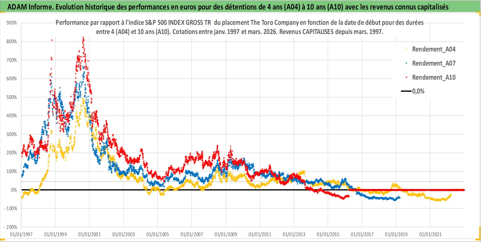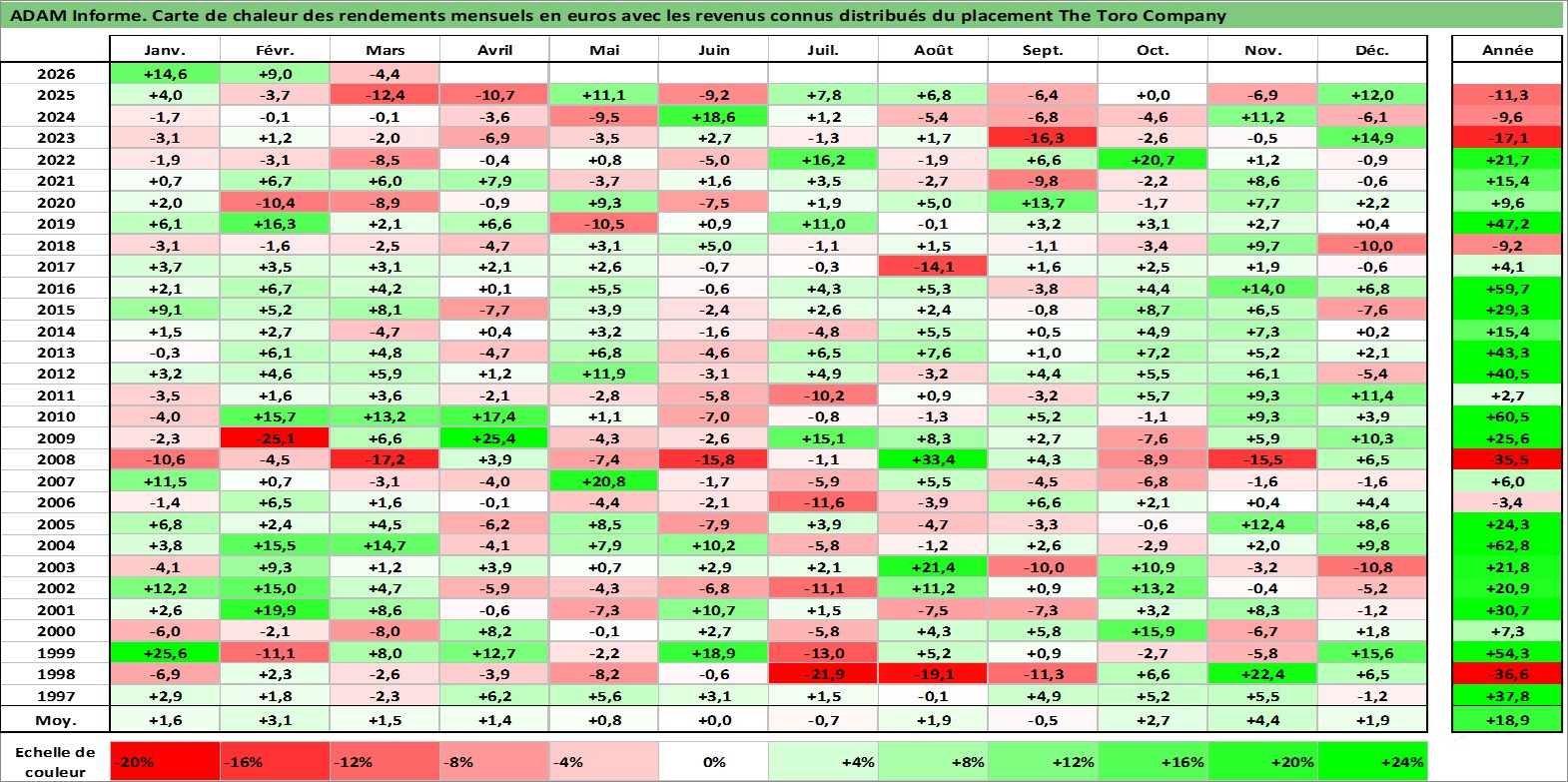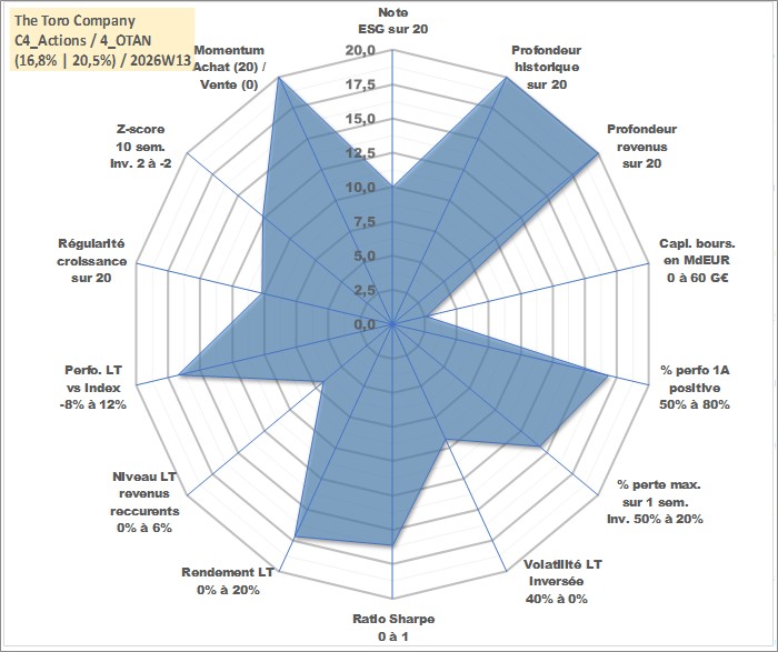 Site dédié aux investisseursPage dédiée sur site financeAnalyse des valorisations hebdomadaires de l'action The Toro Company. Cet actif est cote en USD. Les valorisations sont en contrevaleur EURO et couvrent les semaines 1997W01 a 2026W13. Les revenus de cet actif financier sont pris en compte depuis la semaine 1997W13. La note globale ESG de cet actif est estimee a 10.0 (apres rebasage entre 0 et 20).