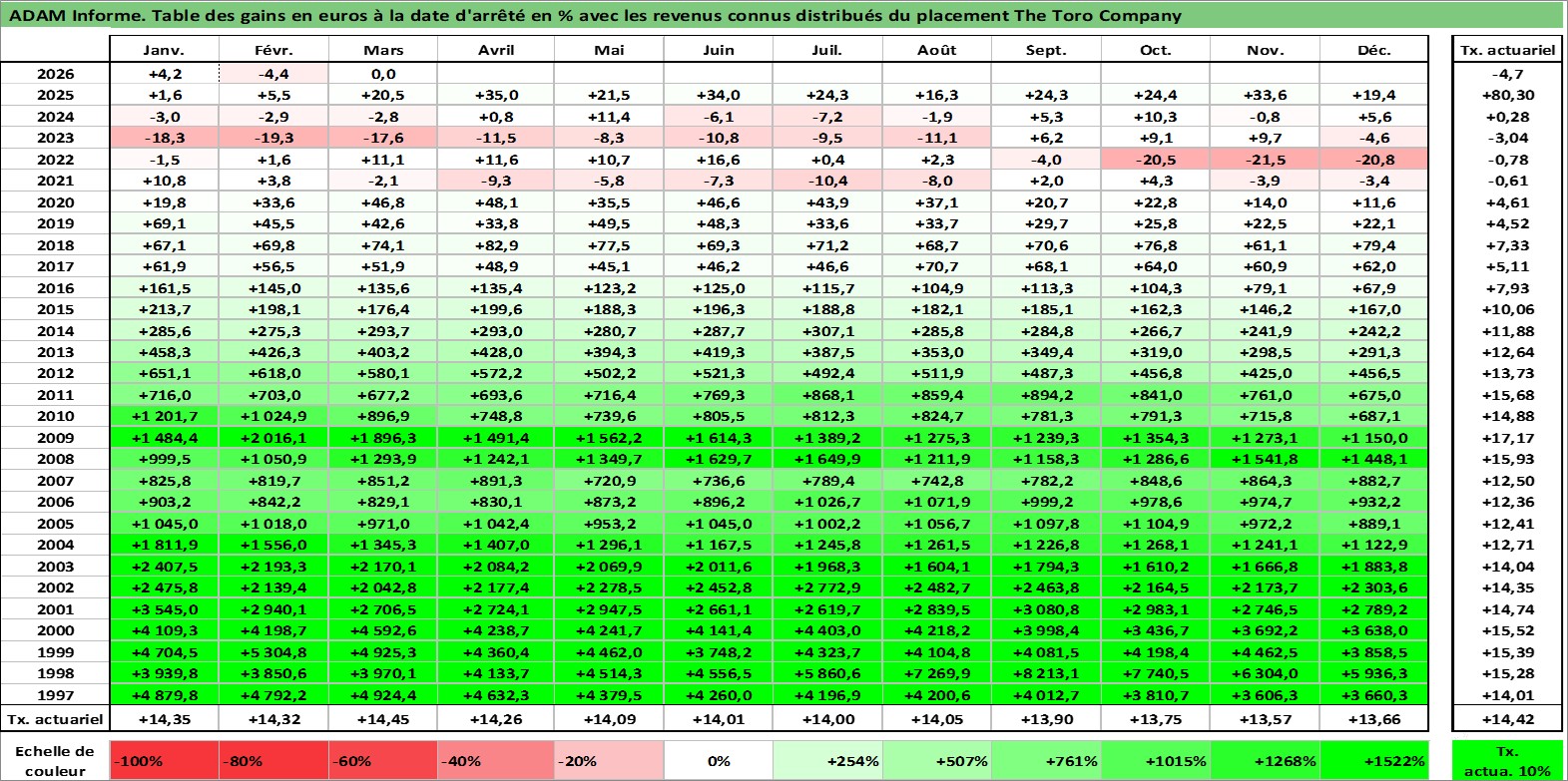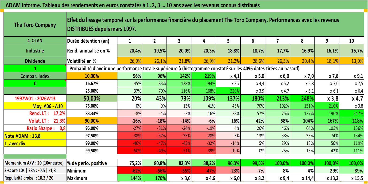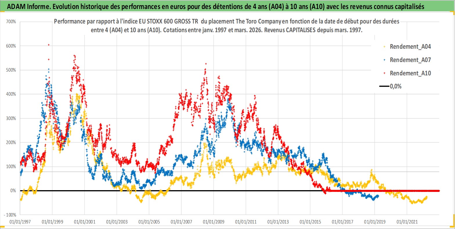 Site dédié aux investisseursPage dédiée sur site financeAnalyse des valorisations hebdomadaires de l'action The Toro Company. Cet actif est cote en USD. Les valorisations sont en contrevaleur EURO et couvrent les semaines 1997W01 a 2026W13. Les revenus de cet actif financier sont pris en compte depuis la semaine 1997W13. La note globale ESG de cet actif est estimee a 10.0 (apres rebasage entre 0 et 20).